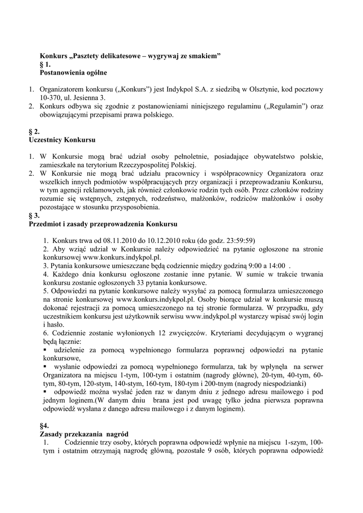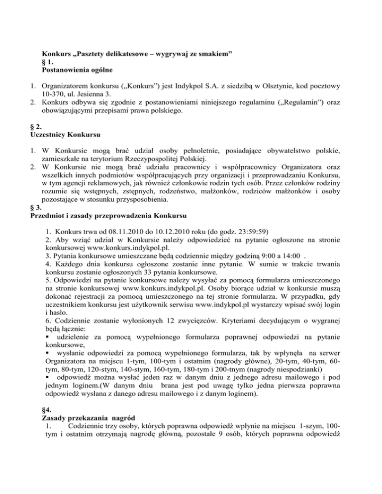 Konkurs „Pasztety delikatesowe – wygrywaj ze smakiem” § 1. Postanowienia ogólne 1. Organizatorem konkursu („Konkurs”) jest Indykpol S.A. z siedzibą w Olsztynie, kod pocztowy 10-370, ul. Jesienna 3. 2. Konkurs odbywa się zgodnie z postanowieniami niniejszego regulaminu („Regulamin”) oraz obowiązującymi przepisami prawa polskiego. § 2. Uczestnicy Konkursu 1. W Konkursie mogą brać udział osoby pełnoletnie, posiadające obywatelstwo polskie, zamieszkałe na terytorium Rzeczypospolitej Polskiej. 2. W Konkursie nie mogą brać udziału pracownicy i współpracownicy Organizatora oraz wszelkich innych podmiotów współpracujących przy organizacji i przeprowadzaniu Konkursu, w tym agencji reklamowych, jak również członkowie rodzin tych osób. Przez członków rodziny rozumie się wstępnych, zstępnych, rodzeństwo, małżonków, rodziców małżonków i osoby pozostające w stosunku przysposobienia. § 3. Przedmiot i zasady przeprowadzenia Konkursu 1. Konkurs trwa od 08.11.2010 do 10.12.2010 roku (do godz. 23:59:59) 2. Aby wziąć udział w Konkursie należy odpowiedzieć na pytanie ogłoszone na stronie konkursowej www.konkurs.indykpol.pl. 3. Pytania konkursowe umieszczane będą codziennie między godziną 9:00 a 14:00 . 4. Każdego dnia konkursu ogłoszone zostanie inne pytanie. W sumie w trakcie trwania konkursu zostanie ogłoszonych 33 pytania konkursowe. 5. Odpowiedzi na pytanie konkursowe należy wysyłać za pomocą formularza umieszczonego na stronie konkursowej www.konkurs.indykpol.pl. Osoby biorące udział w konkursie muszą dokonać rejestracji za pomocą umieszczonego na tej stronie formularza. W przypadku, gdy uczestnikiem konkursu jest użytkownik serwisu www.indykpol.pl wystarczy wpisać swój login i hasło. 6. Codziennie zostanie wyłonionych 12 zwycięzców. Kryteriami decydującym o wygranej będą łącznie: udzielenie za pomocą wypełnionego formularza poprawnej odpowiedzi na pytanie konkursowe, wysłanie odpowiedzi za pomocą wypełnionego formularza, tak by wpłynęła na serwer Organizatora na miejscu 1-tym, 100-tym i ostatnim (nagrody główne), 20-tym, 40-tym, 60tym, 80-tym, 120-stym, 140-stym, 160-tym, 180-tym i 200-tnym (nagrody niespodzianki) odpowiedź można wysłać jeden raz w danym dniu z jednego adresu mailowego i pod jednym loginem.(W danym dniu brana jest pod uwagę tylko jedna pierwsza poprawna odpowiedź wysłana z danego adresu mailowego i z danym loginem). §4. Zasady przekazania nagród 1. Codziennie trzy osoby, których poprawna odpowiedź wpłynie na miejscu 1-szym, 100tym i ostatnim otrzymają nagrodę główną, pozostałe 9 osób, których poprawna odpowiedź wpłynie na miejscu: 20-tym, 40-tym, 60-tym, 80-tym, 120-stym, 140-stym, 160-tym, 180-tym i 200-tnym otrzyma nagrody niespodzianki 2. Nagrodami głównymi będą: 3 elementowy zestaw ręczników łazienkowych – wym. 70x140, 50x100, 30x50 Opiekacz do kanapek Moulinex 2 elementowy zestaw sztućców do porcjowania mięsa Komplet pościeli z satyny bawełnianej 16x200/ 2 poszewki na poduszkę 70x80 Bluza polarowa granatowa Termometr elektroniczny widelec do mięsa z termometrem Trzymiesięczny bezpłatny dostęp do klubu www.pięknieje.pl, fundatorem nagrody jest serwis www.pieknieje.pl Koc akrylowy 160x210 Patelnia teflonowa firmy Tefal 4. Nagrodami niespodziankami będą m.in.: Drewniane tłuczki do mięsa Eleganckie długopisy Smycze Kubeczki Inne 5. Każdego dnia na stronie konkursowej zostanie umieszczona informacja o rodzaju nagrody głównej, jaką można wygrać w danym dniu konkursu. 6. Informację do Zwycięzców o wygranej Organizator wyśle na adres mailowy, z którego zostanie wysłana odpowiedź, natomiast loginy Zwycięzców poszczególnych etapów zostaną umieszczone na stronie konkursowej www.konkurs.indykpol.pl najpóźniej kolejnego dnia konkursowego po wysłaniu odpowiedzi.. 7. Warunkiem otrzymania nagrody jest odesłanie przez Zwycięzców danych kontaktowych w terminie 7 dni od dnia wysłania potwierdzenia o wygranej przez Organizatora. Dane kontaktowe należy przesłać na adres [email protected] 8. Nagroda zostanie wysłana drogą pocztową w ciągu 21 dni od otrzymania danych adresowych Zwycięzcy. 9. Każdy Uczestnik wysyłający odpowiedź na pytanie konkursowe ma obowiązek zapoznać się z Regulaminem Konkursu dostępnym pod adresem: www.konkursy.indykpol.pl 10. Nagrody, które nie zostały przyznane z uwagi na niespełnienie wymogów określonych w niniejszym Regulaminie pozostają własnością Organizatora. 11. Nagrody nie mogą być wymieniane na ekwiwalent pieniężny i zostaną dostarczone do zwycięzców na koszt Organizatora. §5. Dane osobowe i Polityka Prywatności 1. Zwycięzcy Konkursu zostaną powiadomieni przez Organizatora o wygranej drogą elektroniczną. Zwycięzca zostanie poproszony o podanie swoich danych osobowych w celu umożliwienia przekazania nagrody. 2. Uczestnicy Konkursu poprzez fakt przystąpienia do Konkursu wyrażają zgodę na wykorzystanie przez Organizatora ich danych dla potrzeb przeprowadzenia niniejszego Konkursu na warunkach określonych w ustawie z dnia 29 sierpnia 1997 r. o ochronie danych osobowych (tekst jednolity Dz. U. z 2002, Nr 101, poz. 926). Podanie danych osobowych jest dobrowolne, Uczestnikom serwisu przysługuje prawo wglądu do danych, prawo ich poprawiania i usuwania zgodnie z Ustawą z dnia 29.08.97 r. o Ochronie Danych Osobowych Dz. U. nr 133 poz. 883. 3. Dane osobowe Uczestników przetwarzane będą w zakresie i celach związanych z przeprowadzeniem konkursu, a w szczególności w celu komunikacji z Uczestnikami oraz wydania nagród zwycięzcom. 0. Administratorem danych osobowych jest Indykpol S.A. z siedzibą w Olsztynie przy ul. Jesiennej 3, zarejestrowana w Krajowym Rejestrze Sądowym pod nr KRS 0000037732 0. Indykpol S.A. zapewnia każdemu Uczestnikowi konkursu prawo wglądu do swoich danych osobowych oraz możliwość ich poprawiania. Uczestnik, który chce zmienić lub us