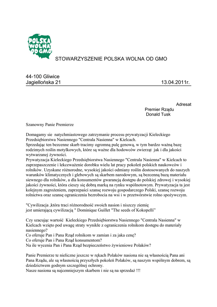 STOWARZYSZENIE POLSKA WOLNA OD GMO 44-100 Gliwice Jagiellońska 21 13.04.2011r. Adresat Premier Rządu Donald Tusk Szanowny Panie Premierze Domagamy sie natychmiastowego zatrzymanie procesu prywatyzacji Kieleckiego Przedsiębiorstwa Nasiennego "Centrala Nasienna" w Kielcach. Sprzedając ten bezcenne skarb tracimy ogromną pulę genową, w tym bardzo ważną bazę rodzimych roślin motylkowych, które są ważne dla hodowców zwierząt jak i dla jakości wytwarzanej żywności. Prywatyzacja Kieleckiego Przedsiębiorstwa Nasiennego "Centrala Nasienna" w Kielcach to zaprzepaszczenie i lekceważenie dorobku wielu lat pracy pokoleń polskich naukowców i rolników. Uzyskane różnorodne, wysokiej jakości odmiany roślin dostosowanych do naszych warunków klimatycznych i glebowych są skarbem narodowym, są bezcenną bazą materiału siewnego dla rolników, a dla konsumentów gwarancją dostępu do polskiej zdrowej i wysokiej jakości żywności, która cieszy się dobrą marką na rynku wspólnotowym. Prywatyzacja ta jest kolejnym zagrożeniem, zaprzepaści szansę rozwoju gospodarczego Polski, szansę rozwoju rolnictwa oraz szansę ograniczenia bezrobocia na wsi i w przetwórstwie rolno spożywczym. "Cywilizacja ,która traci różnorodność swoich nasion i niszczy ziemię jest umierającą cywilizacją " Dominique Guillet "The seeds of Kokopelli” Czy szacując wartość Kieleckiego Przedsiębiorstwa Nasiennego "Centrala Nasienna" w Kielcach wzięto pod uwagę straty wynikłe z ograniczenia rolnikom dostępu do materiały nasiennego? Co oferuje Pan i Pana Rząd rolnikom w zamian i za jaka cenę? Co oferuje Pan i Pana Rząd konsumentom? Na ile wycenia Pan i Pana Rząd bezpieczeństwo żywieniowe Polaków? Panie Premierze te nieliczne jeszcze w rękach Polaków nasiona nie są własnością Pana ani Pana Rządu, ale są własnością przyszłych pokoleń Polaków, są naszym wspólnym dobrem, są dziedzictwem godnym szczególnej ochrony. Nasze nasiona są najcenniejszym skarbem i nie są na sprzedaż !!! Polska już straciła wiele swoich dobrych nasion przy wcześniejszej prywatyzacji innych Przedsiębiorstw Nasiennych. Z krajowego rejestru wynika, że odmian rzepaku pozostało tylko 18%, odmian polskiej kukurydzy 23%, odmian buraka cukrowego29% … Panie Premierze domagamy się podjęcia natychmiastowych działań zapobiegawczych, które uchronią przed wyniszczeniem nasze rodzime rolnictwo i gospodarkę. Domagamy się wstrzymania procesu prywatyzacji Kieleckiego Przedsiębiorstwa Nasiennego „Centrala Nasienna” Prywatyzacja Kieleckiego Przedsiębiorstwa Nasiennego "Centrala Nasienna" w Kielcach jest zagrożeniem dla naszego rolnictwa i bezpieczeństwa żywnościowego Polski. Z poważaniem Anna Szmelcer, prezes Stowarzyszenia „Polska Wolna od GMO” Do wiadomości Przewodniczących kół poselskich Ministra Skarbu Państwa media
