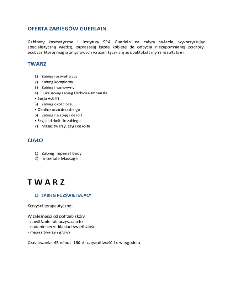 OFERTA ZABIEGÓW GUERLAIN Gabinety kosmetyczne i instytuty SPA Guerlain na całym świecie, wykorzystując specjalistyczną wiedzę, zapraszają każdą kobietę do odbycia niezapomnianej podróży, podczas której magia zmysłowych wrażeń łączy się ze spektakularnymi rezultatami. TWARZ 1) Zabieg roświetlający 2) Zabieg kompletny 3) Zabieg intensywny 4) Luksusowy zabieg Orchidee Imperiale • Sesja Actilift 5) Zabieg okolic oczu • Okolice oczu do zabiegu 6) Zabieg na szyję i dekolt • Szyja i dekolt do zabiegu 7) Masaż twarzy, szyi i dekoltu CIAŁO 1) Zabieg Imperial Body 2) Imperiale Massage TWARZ 1) ZABIEG ROZŚWIETLAJĄCY Korzyści terapeutyczne: W zależności od potrzeb skóry - nawilżanie lub oczyszczanie - nadanie cerze blasku i świetlistości - masaż twarzy i głowy Czas trwania: 45 minut 160 zł, częstotliwość 1x w tygodniu Happylogy Glowing day treatment 30ml – 273 zł 50 ml – 387 zł Redukcja pierwszych zmarszczek Success Future Day Care SPF15 30ml – 377 zł 50ml – 533 zł Redukcja zmarszczek, ujędrnienie Success Age Splendid Deep-Action Day Care SPF10 50ml – 660 zł Modelowanie, restrukturyzacja Ultra intesywne działanie odżywcze i ochronne Super Aqua-Day Comfort Day Cream SPF10 Optymalne nawilżanie, rewitalizacja 30ml – 316 zł 50ml – 448 zł 2) ZABIEG KOMPLETNY Korzyści terapeutyczne: W zależności od problemu skóry - intensywne działanie odmładzające, nawilżające - przy skórze tłustej oczyszczające, matujące i regulujące produkcję serum - masaż twarzy, szyi, dekoltu, głowy, łydek i stóp Czas trwania: 75 minut 210 - 250 zł częstotliwość 1x w miesiącu Super Aqua-Day SPF10 30ml – 316 zł 50ml – 448 zł Optymalne nawilżanie, rewitalizacja Dla skóry suchej i odwodnionej Działanie odżywcze Super Aqua - Night Recovery Balm 30ml – 381 zł Optymalne nawilżanie, wzmocnienie Super Aqua-Mask 6 Masks Optimum Hydration 448zł (1 saszetka 75zł) Optymalne nawilżanie, rewitalizacja Super Aqua-Mask 75ml – 236 zł Optymalne nawilżanie, rewitalizacja Działanie wygładzające i ulastyczniające Success Future Neck&Decollete serum 50ml – 423 zł Serum przeciwzmarszczkowe na szyję i dekolt Success Age Splendid deep-action oil-serum 50ml – 731 zł Modelowanie, napinanie 3) ZABIEG INTENSYWNY Korzyści terapeutyczne: W zależności od problemu skóry - oczyszczanie, działanie matujące i regulujące produkcję serum - głębokie nawilżanie - ujędrnianie, zagęszczanie struktury skóry - spektakularne wygładzenie, odmłodzenie - odżywienie dłoni - masaż po sesji ACTILIFT twarzy, szyi , dekoltu, głowy, łydek, stóp Czas trwania: 90 minut 250 - 290 zł częstotliwość co 4-6 tygodni Success Age Splendid deep-action day care 50ml – 660 zł Modelowanie, restrukturyzacja Ultra intesywne działanie odżywcze i ochronne Success Age Splendid deep-action night care 50ml – 778 zł Modelowanie,restrukturyzacja Działanie regulujące aktywność naturalnych procesów podczas snu Success Age-Splendid deep-action oil-serum 50ml – 731 zł Modelowanie, napinanie LUB Success Future Day SPF15 30ml – 377 zł 50ml – 533 zł Redukcja zmarszczek, ujędrnienie Success Future Night 30ml – 453 zł 50ml – 641 zł Redukcja zmarszczek, ujędrnienie Success Future serum 30ml – 533 zł Redukcja zmarszczek,ujędrnienie Natychmiastowe działanie wygładzające, napinające Super Aqua-Serum 30ml – 448 zł Optymalne nawilżanie,rewitalizacja Ochrona młodości skóry Success Model Smoothing Mask 75ml – 292 zł Modeluje, wygładzanie Działanie liftingujące I roświetlające 4) LUKSUSOWY ZABIEG ORCHIDEE IMPERIALE PERFEKCJA I ABSOLUTNA EFEKTYWNOŚĆ - Orchidea Królewska - „odtwarza w skórze legendarną długowieczność kwiatu orchidei”. Stworzony w laboratoriach Guerlain Wyciąg Cząsteczkowy z Orchidei Królewskiej jest syntezą dobroczynnych ekstraktów z 4 kwiatów Orchidei wyselekcjonowanych spośród 30.000 znanych w świecie roślin. Charakteryzuje go niesłychana zdolność hamowania procesu starzenia i korygowania jego skutków. Korzyści terapeutyczne: - blask, jednolity koloryt - jędrność - spłycenie zmarszczek - zagęszczenie - zabezpieczenie i ochrona - nawilżenie/ komfort/ odżywienie - relaks i bogactwo sensorycznych doznań REZULTATY: Skóra jest w widoczny sposób wygładzona, świetlista o ujednoliconej fakturze i kolorycie. Głęboko odżywiona, odczuwa trwały komfort. Kontury twarzy są wymodelowane, a cera emanuje blaskiem i witalnością. Okolice oczu są wygładzone i nie zdradzają oznak zmęczenia. Aby zachować siłę i jędrność skóry zabieg musi być wykonywany regularnie, a codzienny program pielęgnacji w domu powinien być zbudowany wokół kremu lub fluidu, serum i kremu do pielęgnacji okolic oczu Orchidee Imperiale. Czas trwania: 90 minut 320 - 360 zł częstotliwość 1x w miesiącu PIĘLEGNACJA DOMOWA: Orchidee Imperiale Carem 50ml – 1580 zł Orchidee Imperiale Eye and Lip Carem 15ml – 683 zł Orchidee Imperiale Serum 30ml – 1580 zł Orchidee Imperiale Fluid 30ml – 1108 zł 5) ZABIEG DLA OKOLIC OCZU - Zabieg dedykowany jest każdemu zatroskanemu kondycją skóry okolic oczu. Rezultaty: - wygładzona i nawilżona skóra okolic oczu - niewielkie zmarszczki ulegają całkowitej redukcji - opuchnięcia i cienie są zniwelowane Czas trwania: 45 minut 120-160 zł częstotliwość 1x w miesiącu Dozabiegu: 30 - 60zł Happylogy Eye Glowing Eye Care 15ml – 273 zł Przywrócenie skórze blasku i redukcja oznak zmęczenia Success Eye-Tech 15ml – 448 zł Lifting powiek i redukcja zmarszczek Orchidee Imperiale Eye and Lip Cream 15ml – 683 zł Kompleksowe odmładzanie skóry okolic oczu i ust 6) ZABIEG NA SZYJĘ I DEKOLT- Specjalistyczny zabieg na tę partię naszego ciała, która najszybciej zdradza oznaki mijającego czasu: szyję i dekolt. Rezultaty: - wygładzona i napięta skóra - ujędrniona skóra - miękka i elastyczna skóra Czas trwania 60 minut 120-160 zł częs