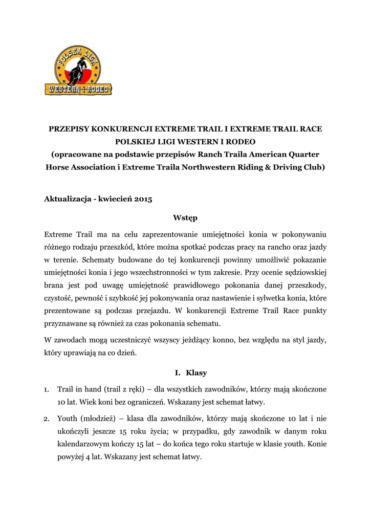 PRZEPISY KONKURENCJI EXTREME TRAIL I EXTREME TRAIL RACE POLSKIEJ LIGI WESTERN I RODEO (opracowane na podstawie przepisów Ranch Traila American Quarter Horse Association i Extreme Traila Northwestern Riding & Driving Club) Aktualizacja - kwiecień 2015 Wstęp Extreme Trail ma na celu zaprezentowanie umiejętności konia w pokonywaniu różnego rodzaju przeszkód, które można spotkać podczas pracy na rancho oraz jazdy w terenie. Schematy budowane do tej konkurencji powinny umożliwić pokazanie umiejętności konia i jego wszechstronności w tym zakresie. Przy ocenie sędziowskiej brana jest pod uwagę umiejętność prawidłowego pokonania danej przeszkody, czystość, pewność i szybkość jej pokonywania oraz nastawienie i sylwetka konia, które prezentowane są podczas przejazdu. W konkurencji Extreme Trail Race punkty przyznawane są również za czas pokonania schematu. W zawodach mogą uczestniczyć wszyscy jeżdżący konno, bez względu na styl jazdy, który uprawiają na co dzień. I. Klasy 1. Trail in hand (trail z ręki) – dla wszystkich zawodników, którzy mają skończone 10 lat. Wiek koni bez ograniczeń. Wskazany jest schemat łatwy. 2. Youth (młodzież) – klasa dla zawodników, którzy mają skończone 10 lat i nie ukończyli jeszcze 15 roku życia; w przypadku, gdy zawodnik w danym roku kalendarzowym kończy 15 lat – do końca tego roku startuje w klasie youth. Konie powyżej 4 lat. Wskazany jest schemat łatwy. 3. Amateur (amator) – klasa dla zawodników, którzy mają skończone 15 lat (nie spełniających już założeń klasy youth), nie zajmujących się zawodowo jazdą konną, treningiem, itp. i nie czerpiącym z tego tytułu korzyści finansowych. Konie powyżej 4 lat. Wskazany jest schemat łatwy i średni. 4. Open – klasa otwarta dla wszystkich zawodników. Konie powyżej 4 lat. Wskazany jest schemat średni i trudny. Minimalny wiek zawodnika to ukończone 10 lat. 5. Konkurencja Extreme Trail Race rozgrywana jest wyłącznie w kategorii Open, a minimalny wiek zawodnika startującego w tej konkurencji to ukończone 15 lat. II. Przepisy ogólne 1. Przed rozpoczęciem zawodów powinno odbyć się spotkanie dla zawodników, podczas którego mogą oni zadawać pytania dotyczące schematu i przepisów konkurencji Extreme Trail oraz Extreme Trail Race. Na spotkaniu takim obecni są sędziowie oraz osoba/osoby odpowiedzialne za schemat. Obowiązkiem zawodników jest wyjaśnienie wszystkich problemowych kwestii na tym spotkaniu, nie mogą natomiast tego robić w trakcie trwania zawodów. Zakończenie odprawy jest równoznaczne z potwierdzeniem zrozumienia zasad przez uczestników zawodów. 2. Przed rozpoczęciem każdego konkursu w zawodach, zawodnicy biorący w nim udział muszą mieć możliwość obejścia toru, na którym ułożony jest schemat (podczas obchodzenia toru mogą oni zadawać pytania dotyczące schematu sędziom oraz osobie/osobom odpowiedzialnym za tor). 3. Sędziowie i/lub powołana komisja mogą zdyskwalifikować - na czas całych zawodów - zawodnika za jakikolwiek przejaw zachowania w stosunku do konia, który uznany zostanie za niewłaściwy, w tym np. za: a. nadmierne używanie ostróg, b. nadmierne używanie wodzy, c. nadmierne używanie bata, d. nieprzestrzeganie zasad zawartych w niniejszych przepisach. 4. Jeżeli koń nabawi się kontuzji podczas trwania konkursu, zawodnik ma obowiązek przerwania przejazdu i wycofania się na tym koniu z zawodów. Jeżeli zawodnik nie zauważy takiej kontuzji konia przejazd przerywa sędzia. 5. Podczas pokonywania toru koń może być prowadzony jedną ręką lub oburącz niezależnie od używanego kiełzna – w czasie przejazdu możliwa jest zmiana ręki (rąk) prowadzącej. 6. Podczas pokonywania schematu jeździec może anglezować, stać w strzemionach lub trzymać się hornu, tak jak to może mieć miejsce podczas jazdy w terenie. 7. Publiczność jest uznawana za “element trasy” i zawodnicy startujący w zawodach akceptują fakt, że może ona rozpraszać ich konia podczas pokonywania trasy. Jednocześnie organizator/osoba odpowiedzialna za tor ma obowiązek zapewnienia bezpiecznego miejsca, w którym ma przebywać publiczność podczas trwania zawodów. III. 1. Ubiór jeźdźca Zawodników obowiązuje strój odświętny, schludny i jednorodny, utrzymany w stylu np. westernowym, angielskim lub historycznym. 2. Jeźdźcy prezentujący styl angielski obowiązkowo startują w kaskach ochronnych. 3. Jeźdźcy prezentujący styl westernowy obowiązkowo startują w kapeluszach lub kaskach ochronnych. 4. Jeźdźcy prezentujący styl historyczny na głowie mają stylowe nakrycie głowy. 5. Wszyscy zawodnicy niepełnoletni (niezależnie od stylu jazdy, który reprezentują) zobowiązani są do startowania w kaskach i kamizelkach ochronnych. 6. Wszystkich zawodników startujących w konkurencji Extreme Trail zachęca się do używania kasków ochronnych oraz kamizelek ochronnych. 7. Obowiązkowe dla wszystkich zawodników jest obuwie przystosowane do jazdy konnej, zakrywające kostkę. 8. W klasie Trail in Hand (trail z ręki) obowiązkowe są rękawiczki. 9. W konkurencji Extreme Trail Race kask ochronny jest obowiązkowy. IV. 1. Rząd koński Zawodnicy zobowiązani są do użytkowania sprzętu (ogłowie, siodło, wodze) uznanego za bezpieczny i humanitarny dla konia. Sędzia ma prawo nie dopuścić do startu zawodnika, jeżeli sprzęt, którego używa zostanie uznany przez niego za niebezpieczny lub niehumanitarny dla konia. 3. Wszelkie wypinacze oraz pomoce sztuczne ograniczające ruchy głowy konia (oprócz wodzy, romala, mecate itp.) są niedozwolone. 4. Obowiązkowe są ochraniacze i/lub owijki na nogi dla koni. Przepisy dotyczące toru 1. Organizator musi dostosować poziom trudności schematu do klasy konkursów (tor zatwierdza sędzia zawodów). 2. Jeżeli to jest możliwe, do budowy schematu powinny zostać wykorzystane przeszkody naturalne lub realistycznie imitujące naturalne. 3.