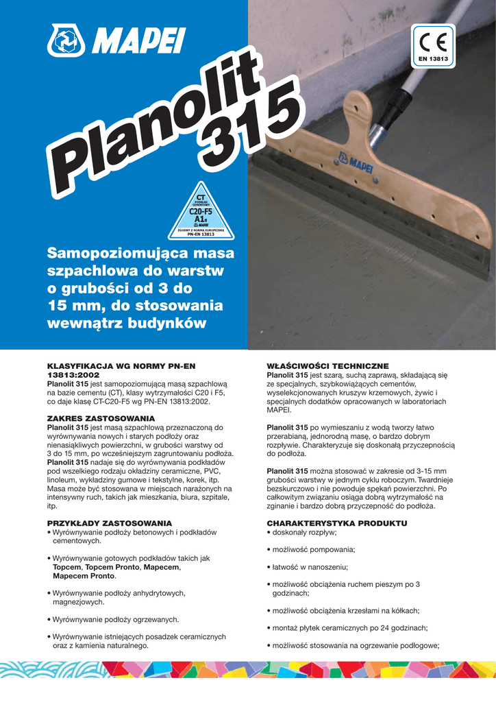 t i l o 5 n 1 a 3 l P EN 13813 C20-F5 Samopoziomująca masa szpachlowa do warstw o grubości od 3 do 15 mm, do stosowania wewnątrz budynków KLASYFIKACJA WG NORMY PN-EN 13813:2002 Planolit 315 jest samopoziomującą masą szpachlową na bazie cementu (CT), klasy wytrzymałości C20 i F5, co daje klasę CT-C20-F5 wg PN-EN 13813:2002. ZAKRES ZASTOSOWANIA Planolit 315 jest masą szpachlową przeznaczoną do wyrównywania nowych i starych podłoży oraz nienasiąkliwych powierzchni, w grubości warstwy od 3 do 15 mm, po wcześniejszym zagruntowaniu podłoża. Planolit 315 nadaje się do wyrównywania podkładów pod wszelkiego rodzaju okładziny ceramiczne, PVC, linoleum, wykładziny gumowe i tekstylne, korek, itp. Masa może być stosowana w miejscach narażonych na intensywny ruch, takich jak mieszkania, biura, szpitale, itp. PRZYKŁADY ZASTOSOWANIA • Wyrównywanie podłoży betonowych i podkładów cementowych. WŁAŚCIWOŚCI TECHNICZNE Planolit 315 jest szarą, suchą zaprawą, składającą się ze specjalnych, szybkowiążących cementów, wyselekcjonowanych kruszyw krzemowych, żywic i specjalnych dodatków opracowanych w laboratoriach MAPEI. Planolit 315 po wymieszaniu z wodą tworzy łatwo przerabianą, jednorodną masę, o bardzo dobrym rozpływie. Charakteryzuje się doskonałą przyczepnością do podłoża. Planolit 315 można stosować w zakresie od 3-15 mm grubości warstwy w jednym cyklu roboczym. Twardnieje bezskurczowo i nie powoduje spękań powierzchni. Po całkowitym związaniu osiąga dobrą wytrzymałość na zginanie i bardzo dobrą przyczepność do podłoża. CHARAKTERYSTYKA PRODUKTU • doskonały rozpływ; • możliwość pompowania; • Wyrównywanie gotowych podkładów takich jak Topcem, Topcem Pronto, Mapecem, Mapecem Pronto. • Wyrównywanie podłoży anhydrytowych, magnezjowych. • łatwość w nanoszeniu; • możliwość obciążenia ruchem pieszym po 3 godzinach; • możliwość obciążenia krzesłami na kółkach; • Wyrównywanie podłoży ogrzewanych. • montaż płytek ceramicznych po 24 godzinach; • Wyrównywanie istniejących posadzek ceramicznych oraz z kamienia naturalnego. • możliwość stosowania na ogrzewanie podłogowe; [sche1] 500_planolit 315_pl (11.07.2006 - 6ª Bozza/Ciano/PDF) t i l no315 a l P • bardzo dobra przyczepność do podłoża; • szybki czas wiązania; • schnie bezskurczowo; • dobrze wyrównuje powierzchnię. ZALECENIA • Nie należy dodawać wody do zaprawy, która zaczęła już wiązać. • Nie dodawać do zaprawy wapnia, cementu i gipsu. • Nie stosować na zewnątrz pomieszczeń oraz wewnątrz przy stałym podciąganiu wilgoci. Mieszanie masy Planolit 315 • W przypadku wykonywania drugiej warstwy Planolit 315, pierwsza warstwa powinna być całkowicie wyschnięta (ok. 24 godziny) i zagruntowana środkiem Primer G rozcieńczonym z wodą w stosunku 1:3. Istnieje również możliwość wykonania drugiej warstwy Planolit 315 po ok. 3-4 godzinach po wykonaniu pierwszej i bez aplikacji środka gruntującego (“świeże na świeże”). • Nie stosować w temperaturach poniżej +5°C oraz powyżej +30°C. • Nie nanosić w warstwie mniejszej niż 3 mm. • Nie stosować do wyrównywania podłoży drewnianych, metalowych oraz innych podłoży odkształcalnych. Wylewanie masy Planolit 315 na podłoże zagruntowane preparatem Primer G SPOSÓB UŻYCIA Przygotowanie podłoża Podłoże powinno być suche, mocne i wolne od kurzu, olejów, tłuszczu, powłok malarskich i gipsu oraz luźnych części, które mogą obniżyć przyczepność masy do podłoża. Słabe podłoża cementowe należy wzmocnić odpowiednim środkiem takim jak Prosfas, Primer EP, Primer MF, itp. Rysy i pęknięcia należy naprawić za pomocą żywicy Eporip, Eporip Turbo. Podłoża betonowe należy wcześniej zagruntować środkiem Primer G rozcieńczonym z wodą w stosunku 1:1. Wilgotność końcowa podkładów anhydrytowych nie powinna przekraczać 0,5% a ich powierzchnia musi być dokładnie oczyszczona i zagruntowana środkiem Mapeprim SP lub Primer EP. Przygotowanie zaprawy W czystym mieszalniku wolnoobrotowym umieścić 5,5 l czystej wody, a następnie wsypać worek 23 kg Planolit 315. Wymieszać, aż do uzyskania jednorodnej, płynnej masy bez grudek. Tak przygotowaną zaprawę pozostawić na kilka minut, po czym ponownie wymieszać. Planolit 315 zachowuje swoją urabialność przez 30 minut (w temperaturze +23°C). Odpowietrzanie masy Planolit 315 rulonem kolczastym Nanoszenie masy Przygotowaną masę nakłada się na przygotowane podłoże przy użyciu dużej szpachli metalowej lub rakli, w zakresie pojedynczej grubości warstwy od 3 do 15 mm. W przypadku dużych powierzchni Planolit 315 może być nanoszony przy użyciu odpowiedniej pompy. Wykonanie posadzki Do montażu okładzin można przystąpić po całkowitym wyschnięciu zaprawy Planolit 315 (24-72 godz.). Czas oczekiwania zależy od chłonności podłoża, temperatury, grubości wylewanej masy oraz od rodzaju montowanej okładziny. W przypadku podłoży nie chłonnych czas schnięcia może się wydłużyć. Do montażu płytek ceramicznych i innych okładzin podłogowych, stosować odpowiedni klej MAPEI. CZYSZCZENIE Sprzęt użyty do pracy, natychmiast po użyciu oczyścić wodą. Stwardniały materiał można usuwać tylko mechanicznie. ZUŻYCIE 1,6 kg/m2 na mm grubości warstwy. OPAKOWANIE Planolit 315 jest pakowany w worki papierowe 23 kg. PRZECHOWYWANIE Planolit 315 może być przechowywany przez 12 miesięcy w oryginalnie zamkniętym opakowaniu i suchym miejscu. Dłuższe przechowywanie może wydłużyć czas wiązania zaprawy jednak nie ma to wpływu na parametry końcowe. ŚRODKI OSTROŻNOŚCI I BEZPIECZEŃSTWA Produkt zawiera cement, który w kontakcie z potem lub innymi wydzielinami ciała może powodować reakcje alergiczne u osób wrażliwych. Stosować rękawiczki i okulary ochronne. Więcej informacji w karcie bezpieczeństwa produktu. PRODUKT DLA PROFESJO
