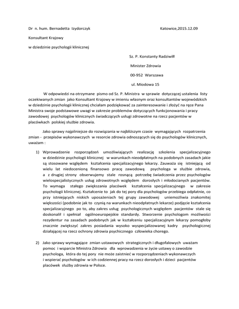 Dr n. hum. Bernadetta Izydorczyk Katowice,2015.12.09 Konsultant Krajowy w dziedzinie psychologii klinicznej Sz. P. Konstanty Radziwiłł Minister Zdrowia 00-952 Warszawa ul. Miodowa 15 W odpowiedzi na otrzymane pismo od Sz. P. Ministra w sprawie dotyczącej ustalenia listy oczekiwanych zmian jako Konsultant Krajowy w imieniu własnym oraz konsultantów wojewódzkich w dziedzinie psychologii klinicznej chciałam podziękować za zainteresowanie i złożyć na ręce Pana Ministra swoje podstawowe uwagi w zakresie problemów dotyczących funkcjonowania i pracy zawodowej psychologów klinicznych świadczących usługi zdrowotne na rzecz pacjentów w placówkach polskiej służbie zdrowia. Jako sprawy najpilniejsze do rozwiązania w najbliższym czasie wymagających rozpatrzenia zmian - przepisów wykonawczych w resorcie zdrowia odnoszących się do psychologów klinicznych, uważam : 1) Wprowadzenie rozporządzeń umożliwiających realizację szkolenia specjalizacyjnego w dziedzinie psychologii klinicznej w warunkach nieodpłatnych na podobnych zasadach jakie są stosowane względem kształcenia specjalizacyjnego lekarzy. Zauważa się istniejącą od wielu lat niedocenioną finansowo pracę zawodową psychologa w służbie zdrowia, a z drugiej strony obserwujemy stale rosnącą potrzebę świadczenia przez psychologów wielospecjalistycznych usług zdrowotnych względem dorosłych i młodocianych pacjentów. To wymaga stałego zwiększania placówek kształcenia specjalizacyjnego w zakresie psychologii klinicznej. Kształcenie to jak do tej pory dla psychologów przebiega odpłatnie, co przy istniejących niskich uposażeniach tej grupy zawodowej uniemożliwia znakomitej większości (podobnie jak to czynią na warunkach nieodpłatnych lekarze) podjęcie kształcenia specjalizacyjnego po to, aby zakres usług psychologicznych względem pacjentów stale się doskonalił i spełniał ogólnoeuropejskie standardy. Stworzenie psychologom możliwości rezydentur na zasadach podobnych jak w kształceniu specjalizacyjnym lekarzy pomogłoby znacznie zwiększyć zakres posiadania wysoko wyspecjalizowanej kadry psychologicznej działającej na rzecz ochrony zdrowia psychicznego człowieka chorego. 2) Jako sprawy wymagające zmian ustawowych strategicznych i długofalowych uważam pomoc i wsparcie Ministra Zdrowia dla wprowadzenia w życie ustawy o zawodzie psychologa, która do tej pory nie może zaistnieć w rozporządzeniach wykonawczych i wspierać psychologów w ich codziennej pracy na rzecz dorosłych i dzieci pacjentów placówek służby zdrowia w Polsce. 3) Sprawą ,która wymagałyby moim zdaniem wsparcia Ministra Zdrowia jest dokonanie doprecyzowania i wyjaśnienia (w formie odrębnego rozporządzenia ?) procedury prowadzenia i archiwizacji dokumentacji psychologicznej wobec pacjentów znajdujących się pod opieką placówek służby zdrowia. Ustalanie prawnych kryteriów dotyczących organizacji dokumentacji psychologicznej w ramach dokumentacji medycznej wykracza poza kompetencje konsultanta krajowego w dziedzinie, którą reprezentuję. Kodeks etyczny psychologa oraz obowiązująca od 1994 roku Ustawa o Ochronie Zdrowia Psychicznego zobowiązuje jedynie w sposób jasny i klarowny do zachowania zasady tajemnicy w procedurze prowadzonej dokumentacji. Art. 50. 1. Ustawy o Ochronie Zdrowia Psychicznego mówi, że osoby wykonujące czynności wynikające z niniejszej ustawy są obowiązane do zachowania w tajemnicy wszystkiego, o czym powezmą wiadomość w związku z wykonywaniem tych czynności, stosownie do odrębnych przepisów, a nadto z zachowaniem przepisów niniejszego rozdziału. 2. Od obowiązku zachowania tajemnicy osoba wymieniona w ust. 1 jest zwolniona w stosunku do: 1) lekarza sprawującego opiekę nad osobą z zaburzeniami psychicznymi, 2) właściwych organów administracji rządowej lub samorządowej co do okoliczności, których ujawnienie jest niezbędne do wykonywania zadań z zakresu pomocy społecznej, 3) osób współuczestniczących w wykonywaniu czynności w ramach pomocy społecznej, w zakresie, w jakim to jest niezbędne, 4) służb ochrony państwa i ich upoważnionych pisemnie funkcjonariuszy lub żołnierzy w zakresie niezbędnym do przeprowadzenia postępowania sprawdzającego na podstawie przepisów o ochronie informacji niejawnych. Art. 51. W dokumentacji dotyczącej badań lub przebiegu leczenia osoby, wobec której podjęto czynności wynikające z niniejszej ustawy, nie utrwala się oświadczeń obejmujących przyznanie się do popełnienia czynu zabronionego pod groźbą kary. Zasadę tę stosuje się również do dokumentacji dotyczącej badań przeprowadzonych na żądanie uprawnionego organu. Art. 52. 1. Nie wolno przesłuchiwać osób obowiązanych do zachowania tajemnicy, stosownie do przepisów niniejszego rozdziału, jako świadków na okoliczność wypowiedzi osoby, wobec której podjęto czynności wynikające z niniejszej ustawy, co do popełnienia przez nią czynu zabronionego pod groźbą kary. 2. Zakaz określony w ust. 1 stosuje się odpowiednio do lekarzy wykonujących czynności biegłego. Przepisy powyższe poza jasno sprecyzowaną zasadą tajemnicy nie regulują precyzyjnie kryteriów i standardów wymaganych przy sporządzaniu dokumentacji psychologicznej pacjenta w służbie zdrowia. Badanie psychologiczne i otrzymane w jego wyniku dane mogą zostać zdefiniowane jako tzw. „dane intymne”, wymagające szczególnej ochrony i zachowania tajemnicy , z drugiej zaś strony są często niezbędne do postawienia diagnozy psychologicznej stanowiącej komplementarny element diagnozy medycznej i leczenia pacjenta. Ustawa o zawodzie psychologa nie funkcjonuje - brak uregulowań i rozporządzeń wykonawczych, pozostaje w toku nowelizacji pod kierunkiem Ministra Pracy i Polityki Społecznej). Brak jest jasnych regulacji prawnych (rozporządzeń) wyjaśniających procedury prowadzenia i archiwizacji dokumentacji psychologicznej w ramach dokumen