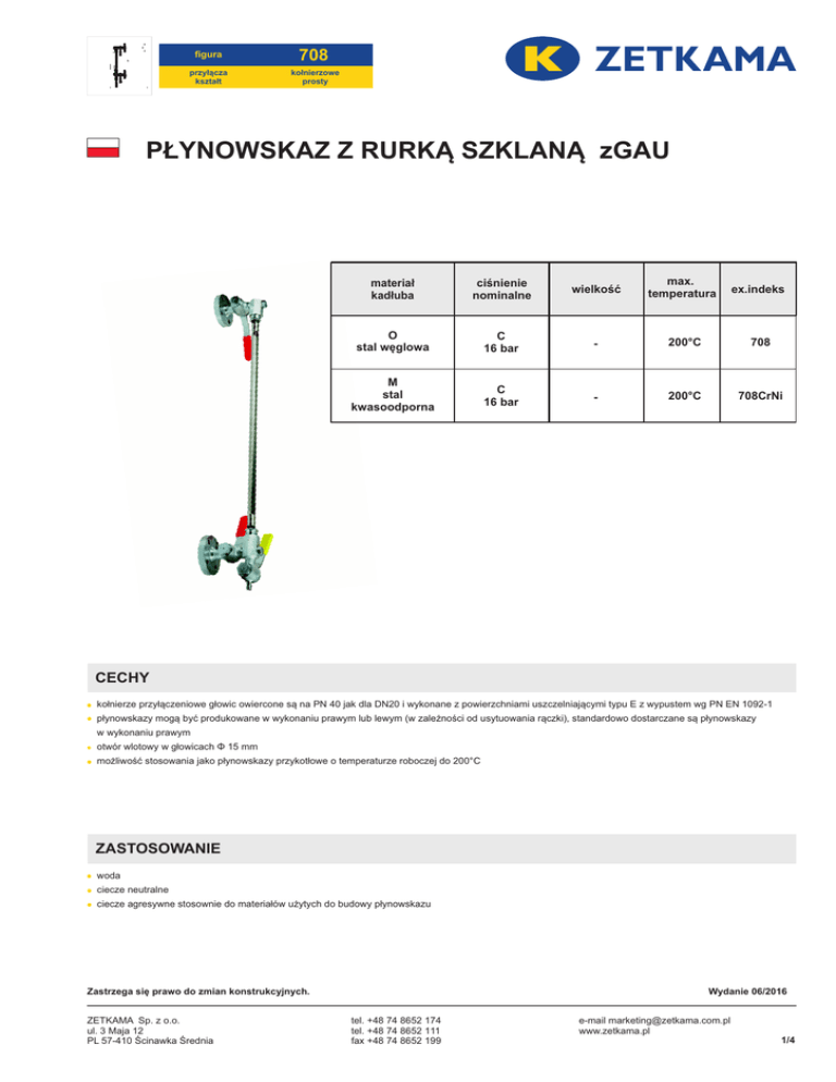 figura 708 przyłącza kształt kołnierzowe prosty PŁYNOWSKAZ Z RURKĄ SZKLANĄ zGAU materiał kadłuba ciśnienie nominalne wielkość max. temperatura ex.indeks O stal węglowa C 16 bar - 200°C 708 M stal kwasoodporna C 16 bar - 200°C 708CrNi CECHY kołnierze przyłączeniowe głowic owiercone są na PN 40 jak dla DN20 i wykonane z powierzchniami uszczelniającymi typu E z wypustem wg PN EN 1092-1 płynowskazy mogą być produkowane w wykonaniu prawym lub lewym (w zależności od usytuowania rączki), standardowo dostarczane są płynowskazy w wykonaniu prawym otwór wlotowy w głowicach Φ 15 mm możliwość stosowania jako płynowskazy przykotłowe o temperaturze roboczej do 200°C ZASTOSOWANIE woda ciecze neutralne ciecze agresywne stosownie do materiałów użytych do budowy płynowskazu Zastrzega się prawo do zmian konstrukcyjnych. ZETKAMA Sp. z o.o. ul. 3 Maja 12 PL 57-410 Ścinawka Średnia Wydanie 06/2016 tel. +48 74 8652 174 tel. +48 74 8652 111 fax +48 74 8652 199 e-mail [email protected] www.zetkama.pl 1/4 figura 708 przyłącza kształt kołnierzowe prosty MATERIAŁY 3 2 1 6 5 4 materiał kadłuba O M wykonanie 02, 03 02, 03 1 rurka szklana 2 głowica płynowskazowa 3 4 3 4 łącznik dławicowy kurek spustowy śruba wkrętka szkło S275JR X6CrNiTi18-10 1.0044 1.4541 11SMn30 X6CrNiTi18-10 1.0715 1.4541 S275JR X6CrNiTi18-10 1.0044 1.4541 11SMn30 X6CrNiTi18-10 1.0715 1.4541 S275JR X6CrNiTi18-10 1.0044 max. temperatura 1.4541 o 200 C Na życzenie zamawiającego może być dostarczony tylko komplet głowic płynowskazowych. Masa głowic płynowskazowych - ok.5,3 kg Długość rurki należy dobrać wg następującego wzoru: Rozstaw osi [L] - 28 mm = długość rurki Maksymalny rozstaw osi [L] - 2000 mm Powyżej L - 1000 mm wymagany dodatkowy punkt podparcia Zastrzega się prawo do zmian konstrukcyjnych. ZETKAMA Sp. z o.o. ul. 3 Maja 12 PL 57-410 Ścinawka Średnia Wydanie 06/2016 tel. +48 74 8652 174 tel. +48 74 8652 111 fax +48 74 8652 199 e-mail [email protected] www.zetkama.pl 2/4 figura 708 przyłącza kształt kołnierzowe prosty ZMIANA WYKONANIA Zmianę wykonania płynowskazu z prawego na lewy (lub odwrotnie) uzyskuje się poprzez poluzowanie śrub [5] i obrót głowic kołnierzowych o 180°C oraz obrót kurka spustowego [4] WYKONANIE Z ZABEZPIECZENIEM PRZECIWWYPŁYWOWYM W przypadku pęknięcia szkła kulki odcinają wypływ czynnika ZALEŻNOŚĆ TEMPERATURY OD CIŚNIENIA Ciśnienie (bar) Obszar dopuszczalnych parametrów pracy PN16 S275JR 1.0044 Temperatura (C) Zastrzega się prawo do zmian konstrukcyjnych. ZETKAMA Sp. z o.o. ul. 3 Maja 12 PL 57-410 Ścinawka Średnia Wydanie 06/2016 tel. +48 74 8652 174 tel. +48 74 8652 111 fax +48 74 8652 199 e-mail [email protected] www.zetkama.pl 3/4 figura 708 przyłącza kształt kołnierzowe prosty WYKONANIA figura materiał kadłuba wielkość O - 708 stal węglowa S275JR ciśnienie nominalne PN C wykonanie 02 Tmax 200 °C 03 Tmax 200 °C wykonanie standardowe z rurką szklaną 16bar wykonanie standardowe z zabezpieczeniem przeciwwypływowym z rurką szklaną M stal kwasoodporna X6CrNiTi18-10 C - 02 Tmax 200 °C 03 Tmax 200 °C wykonanie standardowe z rurką szklaną 16bar wykonanie standardowe z zabezpieczeniem przeciwwypływowym z rurką szklaną ZAMAWIANIE Uprasza się o zamawianie produktu wg indeksu figura materiał kadłuba wielkość ciśnienie nominalne PN wykonanie 708 O - C 02 708 PRZYKŁAD ZAMÓWIENIA - C 02 708 płynowskaz z rurką szklaną, przyłącze kołnierzowe, kształt prosty O stal węglowa S275JR - wielkość - C ciśnienie nominalne PN16 02 wykonanie standardowe z rurką szklaną Zastrzega się prawo do zmian konstrukcyjnych. ZETKAMA Sp. z o.o. ul. 3 Maja 12 PL 57-410 Ścinawka Średnia O Wydanie 06/2016 tel. +48 74 8652 174 tel. +48 74 8652 111 fax +48 74 8652 199 e-mail [email protected] www.zetkama.pl 4/4