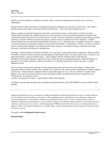 newss.pl Dbaj o ciśnienie Właściwy poziom ciśnienia w oponach ma istotny wpływ zarówno na bezpieczeństwo jazdy, jak też na koszty eksploatacji. Poziom ciśnienia należy sprawdzać i ewentualnie korygować regularnie raz na miesiąc, tymczasem – jak wynika z badania przeprowadzonego na zlecenie Szkoły Jazdy Renault* – wie o tym tylko co drugi kierowca. Opony są jedynym elementem łączącym samochód z nawierzchnią drogi i w dużej mierze od ich stanu zależy bezpieczeństwo podróżnych. Dlatego kluczowe jest, aby pamiętać o sezonowej zmianie ogumienia, kontrolowaniu wysokości bieżnika (nie może być ona mniejsza niż 1,6 mm), a przede wszystkim o regularnym sprawdzaniu poziomu ciśnienia w oponach. Wiedza na temat tej ostatniej czynności nie jest u polskich kierowców najlepsza – badanie przeprowadzone na zlecenie Szkoły Jazdy Renault wykazało, że aż co dziesiąty kierowca błędnie twierdzi, że ciśnienie w oponach powinno się sprawdzać średnio raz na pół roku lub rzadziej, a co dwudziesty twierdzi, że wystraczy robić to podczas cyklicznych przeglądów auta! Regularna kontrola ciśnienia w oponach jest jedną z podstawowych zasad eko-jazdy, czyli jazdy ekonomicznej i ekologicznej. Ciśnienie w oponach należy sprawdzać regularnie, raz w miesiącu, a także przed każdym wyjazdem w dłuższą podróż. Prawidłowy poziom ciśnienia zalecany przez producenta bezpośrednio wpływa na przyczepność auta i zwiazaną z tym drogę hamowania, a także na komfort jazdy – mówi Zbigniew Weseli, dyrektor Szkoły Jazdy Renault. – Nieodpowiedni poziom ciśnienia w oponach to także zwiększone koszty eksploatacji pojazdu. Samochód jadący na oponach ze zbyt niskim ciśnieniem spala więcej paliwa a i żywotność takich opon znacznie się skraca – dodaje Zbigniew Weseli. Coraz częściej o konieczności regulacji ciśnienia przypominają kierowcom montowane seryjnie w wielu autach specjalne systemy kontroli ciśnienia. Bez względu na to ważne jest, aby samą czynność sprawdzenia i korekty ciśnienia wykonywać w odpowiednich warunkach. Podczas jazdy koło nagrzewa się, a wówczas ciśnienie w oponie rośnie, dlatego zaleca się, aby pomiaru ciśnienia i jego ewentualnej korekty nie dokonywać zaraz po zatrzymaniu auta. Wskazane jest, aby odczekać chwilę i zrobić to, gdy opona jest zimna – radzą trenerzy Szkoły Jazdy Renault. * Badanie na temat jazdy ekologicznej i ekonomicznej przeprowadzone przez TNS OBOP na zlecenie Szkoły Jazdy Renault. Szkoła Jazdy Renault to pierwsza markowa szkoła doskonalenia techniki jazdy Renault na świecie. Szkoła działa na terenie lotniska Warszawa-Bemowo. W ofercie szkoły znajdują się kursy dla klientów indywidualnych i flotowych, program dla kierowców samochodów dostawczych, defensive driving, czyli ćwiczenie techniki jazdy po mieście, kompletne audyty flot samochodowych, kurs eko-jazdy, wykłady z psychologii i bezpieczeństwa ruchu drogowego oraz szkolenia z zakresu pierwszej pomocy. Szkoła dysponuje 50 000 m² powierzchni do ćwiczeń, tym płytą poślizgową o długości 120 m oraz kręgiem poślizgowym o średnicy 60 m, a także płytami betonowymi do jazdy na trolejach i torem do jazdy terenowej. Szczegóły: www.szkolajazdyrenault.com.pl Renault Polska strona 1 / 1