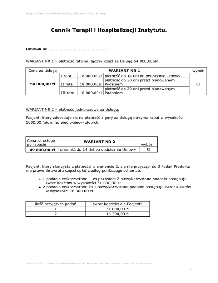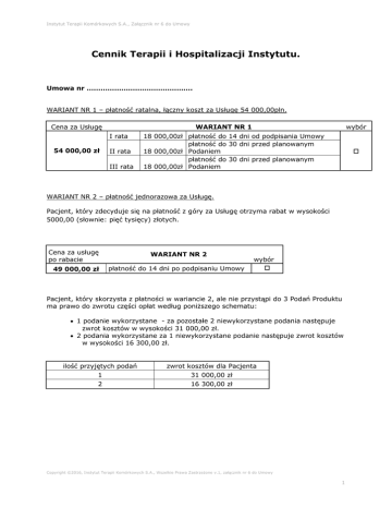 Instytut Terapii Komórkowych S.A., Załącznik nr 6 do Umowy Cennik Terapii i Hospitalizacji Instytutu. Umowa nr ………………………………………. WARIANT NR 1 – płatność ratalna, łączny koszt za Usługę 54 000,00pln. Cena za Usługę WARIANT NR 1 I rata 54 000,00 zł II rata III rata wybór 18 000,00zł płatność do 14 dni od podpisania Umowy płatność do 30 dni przed planowanym 18 000,00zł Podaniem płatność do 30 dni przed planowanym 18 000,00zł Podaniem WARIANT NR 2 – płatność jednorazowa za Usługę. Pacjent, który zdecyduje się na płatność z góry za Usługę otrzyma rabat w wysokości 5000,00 (słownie: pięć tysięcy) złotych. Cena za usługę po rabacie 49 000,00 zł WARIANT NR 2 płatność do 14 dni po podpisaniu Umowy wybór Pacjent, który skorzysta z płatności w wariancie 2, ale nie przystąpi do 3 Podań Produktu ma prawo do zwrotu części opłat według poniższego schematu: 1 podanie wykorzystane - za pozostałe 2 niewykorzystane podania następuje zwrot kosztów w wysokości 31 000,00 zł. 2 podania wykorzystane za 1 niewykorzystane podanie następuje zwrot kosztów w wysokości 16 300,00 zł. ilość przyjętych podań 1 zwrot kosztów dla Pacjenta 31 000,00 zł 2 16 300,00 zł Copyright ©2016, Instytut Terapii Komórkowych S.A., Wszelkie Prawa Zastrzeżone v.1, załącznik nr 6 do Umowy 1