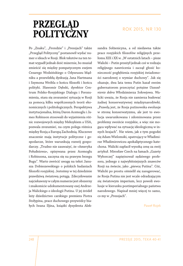 ROK 2015, NR 130 Po „Znaku”, „Frondzie” i „Pressjach” także „Przegląd Polityczny” postanowił wydać numer o ideach w Rosji. Blok tekstów na ten temat wypadł jednak dość mizernie, bo musiał zmieścić się między pompatycznym esejem Cezarego Wodzińskiego o Odyseuszu błądniku a przewlekłą dyskusją Jana Hartmana i Szymona Wróbla o końcu filozofii i końcu polityki. Sławomir Dębski, dyrektor Centrum Polsko-Rosyjskiego Dialogu i Porozumienia, stara się zrozumieć sytuację w Rosji za pomocą kilku współczesnych teorii ekonomicznych i politologicznych. Perspektywa instytucjonalna, którą Daron Acemoglu i James Robinson stosowali do wyjaśnienia różnic rozwojowych między Meksykiem a USA, pozwala zrozumieć, na czym polega różnica między Rosją a Europą Zachodnią. Kluczowe znaczenie mają instytucje polityczne i gospodarcze, które warunkują rozwój gospodarczy. „Trudno nie zauważyć, że «Ameryka Południowa», opisywana przez Acemoglu i Robinsona, zaczyna się na prawym brzegu Bugu”. Warto zwrócić uwagę na tekst Janusza Dobieszewskiego o polskich badaniach filozofii rosyjskiej. Jesteśmy w tej dziedzinie prawdziwą światową potęgą. Zdecydowanie najciekawszy w całym numerze jest obszerny i znakomicie udokumentowany esej Andrzeja Walickiego o ideologii Putina. U jej źródeł leży dziedzictwo carskiego premiera Piotra Stołypina, prace duchowego przywódcy białych Iwana Iljina, książki dysydenta Alek- 248 sandra Sołżenicyna, a od niedawna także prace rosyjskich filozofów religijnych przełomu XIX i XX w. „W ostatnich latach – pisze Walicki – Putin przeżył jednak coś w rodzaju religijnego nawrócenia i zaczął głosić konieczność pogłębienia rosyjskiej świadomości narodowej o wymiar duchowy”. Jak się okazuje, dwa lata temu Putin kazał swoim gubernatorom przeczytać potężne Uzasadnienie dobra Włodzimierza Sołowjowa. Walicki uważa, że Rosja nie zamierza budować żadnej konserwatywnej międzynarodówki. „Prawdą jest, że Rosja putinowska ewoluuje w stronę konserwatyzmu, ale jest to ewolucja uwarunkowana i zdominowana przez problemy swoiście rosyjskie, a więc nie mogąca wpływać na sytuację ideologiczną w innych krajach”. Nie wiem, jak z tym pogodzi się Adam Wielomski, upatrujący w Władimirze Władimirowiczu apokaliptycznego katechona. Walicki zapłacił wysoką cenę za swój artykuł. Mirosław Czech na łamach „Gazety Wyborczej” napiętnował sędziwego profesora, jednego z najwybitniejszych znawców Rosji na świecie, jako „piewcę Putina”. Cóż, Walicki po prostu ośmielił się zasugerować, że Rosja Putina nie jest wcale odradzającym się światowym imperium, lecz powoli ewoluuje w kierunku postimperialnego państwa narodowego. Napisał mniej więcej to samo, co my w „Pressjach”. Paweł Rojek PRESSJE 2015, TEKA 40-41