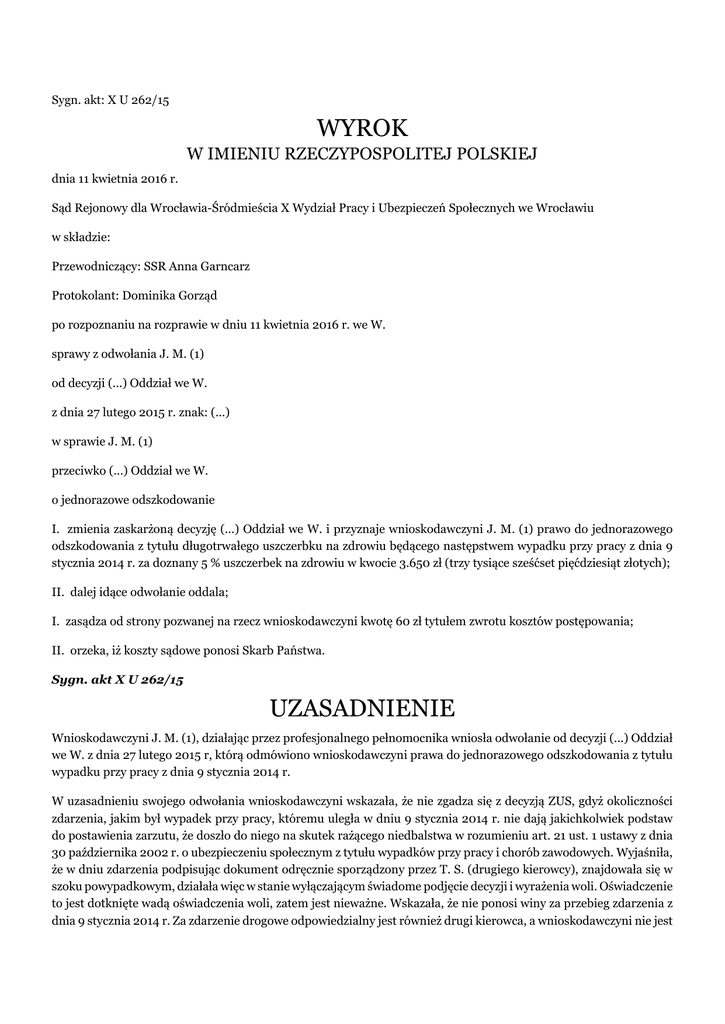 Sygn. akt: X U 262/15 WYROK W IMIENIU RZECZYPOSPOLITEJ POLSKIEJ dnia 11 kwietnia 2016 r. Sąd Rejonowy dla Wrocławia-Śródmieścia X Wydział Pracy i Ubezpieczeń Społecznych we Wrocławiu w składzie: Przewodniczący: SSR Anna Garncarz Protokolant: Dominika Gorząd po rozpoznaniu na rozprawie w dniu 11 kwietnia 2016 r. we W. sprawy z odwołania J. M. (1) od decyzji (...) Oddział we W. z dnia 27 lutego 2015 r. znak: (...) w sprawie J. M. (1) przeciwko (...) Oddział we W. o jednorazowe odszkodowanie I. zmienia zaskarżoną decyzję (...) Oddział we W. i przyznaje wnioskodawczyni J. M. (1) prawo do jednorazowego odszkodowania z tytułu długotrwałego uszczerbku na zdrowiu będącego następstwem wypadku przy pracy z dnia 9 stycznia 2014 r. za doznany 5 % uszczerbek na zdrowiu w kwocie 3.650 zł (trzy tysiące sześćset pięćdziesiąt złotych); II. dalej idące odwołanie oddala; I. zasądza od strony pozwanej na rzecz wnioskodawczyni kwotę 60 zł tytułem zwrotu kosztów postępowania; II. orzeka, iż koszty sądowe ponosi Skarb Państwa. Sygn. akt X U 262/15 UZASADNIENIE Wnioskodawczyni J. M. (1), działając przez profesjonalnego pełnomocnika wniosła odwołanie od decyzji (...) Oddział we W. z dnia 27 lutego 2015 r, którą odmówiono wnioskodawczyni prawa do jednorazowego odszkodowania z tytułu wypadku przy pracy z dnia 9 stycznia 2014 r. W uzasadnieniu swojego odwołania wnioskodawczyni wskazała, że nie zgadza się z decyzją ZUS, gdyż okoliczności zdarzenia, jakim był wypadek przy pracy, któremu uległa w dniu 9 stycznia 2014 r. nie dają jakichkolwiek podstaw do postawienia zarzutu, że doszło do niego na skutek rażącego niedbalstwa w rozumieniu art. 21 ust. 1 ustawy z dnia 30 października 2002 r. o ubezpieczeniu społecznym z tytułu wypadków przy pracy i chorób zawodowych. Wyjaśniła, że w dniu zdarzenia podpisując dokument odręcznie sporządzony przez T. S. (drugiego kierowcy), znajdowała się w szoku powypadkowym, działała więc w stanie wyłączającym świadome podjęcie decyzji i wyrażenia woli. Oświadczenie to jest dotknięte wadą oświadczenia woli, zatem jest nieważne. Wskazała, że nie ponosi winy za przebieg zdarzenia z dnia 9 stycznia 2014 r. Za zdarzenie drogowe odpowiedzialny jest również drugi kierowca, a wnioskodawczyni nie jest odpowiedzialna za zdarzenie, skoro nie wykazano jej winy umyślnej, ani też rażącego niedbalstwa. Po wypadku stan zdrowia wnioskodawczyni pogarszał się, straciła przytomność. Cały prawie rok 2014 wnioskodawczyni poświęciła na ratowanie zdrowia na skutek wypadku, który miał miejsce w pracy. W odpowiedzi na odwołanie organ rentowy wniósł o jego oddalenie z uwagi na brak podstaw prawnych do jego uwzględnienia. W uzasadnieniu wskazał, że, wnioskodawczyni wniosła o przyznanie prawa do jednorazowego odszkodowania z tytułu wypadku przy pracy, lecz zdaniem strony pozwanej, na podstawie zgromadzonej dokumentacji wypadku i oświadczenia spisanego i podpisanego przez uczestników zdarzenia w dniu 9 stycznia 2014 r., ustalono, że wyłączną przyczyną wypadku było nieudzielanie pierwszeństwa przejazdu, a więc nie zastosowanie się przez wnioskodawczynię do przepisów ruchu drogowego. Zachowaniu wnioskodawczyni w ocenie strony pozwanej należy przypisać cechy rażącego niedbalstwa ponieważ niebezpieczeństwo kolizji na skrzyżowaniu podczas jazdy w ruchu okrężnym nie wymusiło zachowania należytej ostrożności, a to spowodowało zagrożenie skutkujące kolizję drogową. Sąd ustalił następujący stan faktyczny: Wnioskodawczyni J. M. (1) jest zatrudniona w (...)w T. na stanowisku referenta. W dniu 9 stycznia 2014 r. powódka rozpoczęła pracę o godzinie 7.30 i wykonywała swoje codzienne obowiązki. Około godziny 13-stej wnioskodawczyni otrzymała od przełożonego polecenie dostarczenia dokumentów służbowych do Starostwa Powiatowego w T.. Wnioskodawczyni, aby wykonać polecenie przełożonego pojechała na miejsce złożenia dokumentów samochodem marki O. (...) nr rej (...). Wnioskodawczyni zdała wymagane dokumenty w Starostwie Powiatowym w T. i wracała do pracy samochodem. Dowód: - protokół ustalenia wypadku przy pracy (akta rentowe strony pozwanej) Wnioskodawczyni wracając do pracy ze Starostwa Powiatowego w T. samochodem marki O. (...) nr rejestr. (...) około godziny 14-stej jadąc ulicą (...) w kierunku skrzyżowania z ulicą (...) wjechała na skrzyżowanie – rondo, po którym jechał samochód V. (...) nr rejestr. (...) 84GT kierowanym przez T. S. nadjeżdżającym z lewej strony i na skrzyżowaniu tym wnioskodawczyni zderzyła się z samochodem prowadzonym przez T. S.. W wyniku zderzenia samochody zostały uszkodzone a wnioskodawczyni doznała obrażeń ciała. Zdarzenie drogowe – kolizja pomiędzy wnioskodawczynią a T. S., która miała miejsce w dniu 9 stycznia 2014 r. w T. na skrzyżowaniu ulic (...) - l M. miała miejsce na skrzyżowaniu - rondo oznakowane znakiem C-12 (ruch okrężny) występującym razem ze znakiem A-7( ustąp pierwszeństwa). Na kierunku jazdy wzdłuż ulicy (...) (kierunek jazdy samochodu V. (...) kierowanego przez T. S. ) prędkość ograniczona jest do 40 km/godz. Odległość, na jaką jest widoczność z wlotu ulicy (...) w kierunku ulicy (...)w stronę W., wynosi ponad 50 m. Odległość od wlotu na rondo z kierunku od W. do wyjazdu z ulicy l M. na rondo wynosi 16m. Takie oznakowanie skrzyżowania ulic (...) z ulicą l M. w T., zgodnie z zasadami ruchu drogowego zawartymi w „Prawie o ruchu drogowym" - „Rozporządzeniu o znakach i sygnałach drogowych", oznacza, że znak C-12 występujący łącznie ze znakiem A-7 wyznacza pierwszeństwo kierującemu znajdującemu się na skrzyżowaniu przed kierującym wjeżdżającym na to skrzyżowanie. Ponieważ wskazany na znaku C-12, kierunek jazdy po rondzie jest odwrotny do kierunku wskazówek zegara to w praktyce oznacza to, że kierujący nadjeżdżający po rondzie z lewej s