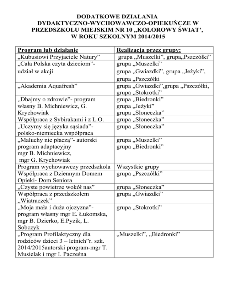 DODATKOWE DZIAŁANIA DYDAKTYCZNO-WYCHOWAWCZO-OPIEKUŃCZE W PRZEDSZKOLU MIEJSKIM NR 10 „KOLOROWY ŚWIAT’, W ROKU SZKOLNYM 2014/2015 Program lub działanie „Kubusiowi Przyjaciele Natury” „Cała Polska czyta dzieciom”udział w akcji „Akademia Aquafresh” „Dbajmy o zdrowie”- program własny B. Michniewicz, G. Krychowiak Współpraca z Sybirakami i z L.O. „Uczymy się języka sąsiada”polsko-niemiecka współpraca „Maluchy nie płaczą”- autorski program adaptacyjny mgr B. Michniewicz, mgr G. Krychowiak Program wychowawczy przedszkola Współpraca z Dziennym Domem Opieki- Dom Seniora „Czyste powietrze wokół nas” Współpraca z przedszkolem „Wiatraczek” „Moja mała i duża ojczyzna”program własny mgr E. Łukomska, mgr B. Dzierko, E.Pyzik, L. Sobczyk „Program Profilaktyczny dla rodziców dzieci 3 – letnich”r. szk. 2014/2015autorski program-mgr T. Musielak i mgr I. Pacześna Realizacja przez grupy: grupa „Muszelki”, grupa„Pszczółki” grupa „Muszelki” grupa „Gwiazdki”, grupa „Jeżyki”, grupa „Pszczółki grupa „Gwiazdki”,grupa „Pszczółki, grupa „Stokrotki” grupa „Biedronki” grupa „Jeżyki” grupa „Słoneczka” grupa „Słoneczka” grupa „Słoneczka” grupa „Muszelki” grupa „Biedronki” Wszystkie grupy grupa „Pszczółki” grupa „Słoneczka” grupa „Gwiazdki” grupa „Stokrotki” „Muszelki”, „Biedronki”