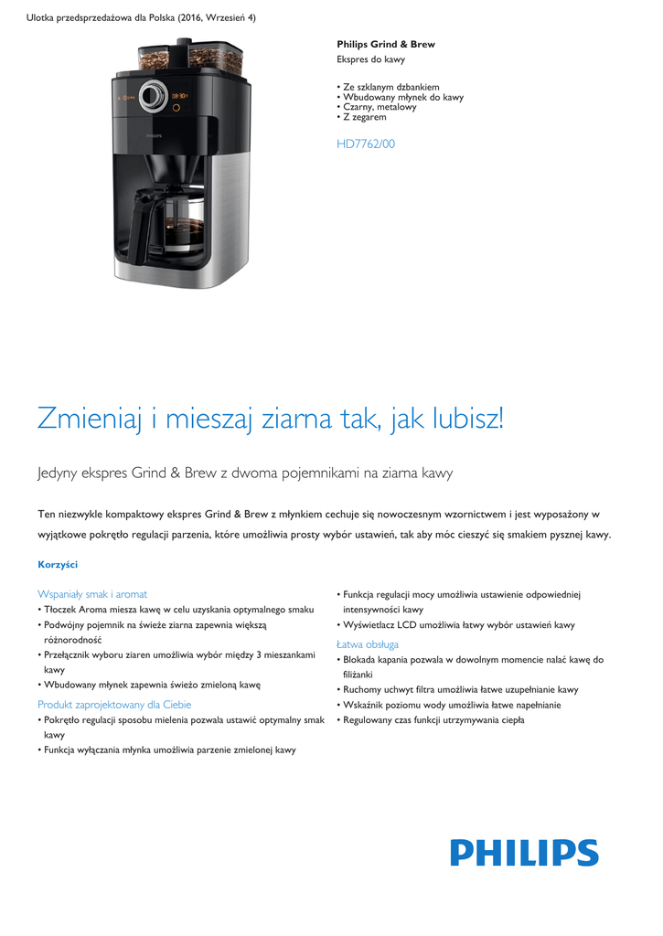 Ulotka przedsprzedażowa dla Polska (2016, Wrzesień 4) Philips Grind & Brew Ekspres do kawy • Ze szklanym dzbankiem • Wbudowany młynek do kawy • Czarny, metalowy • Z zegarem HD7762/00 Zmieniaj i mieszaj ziarna tak, jak lubisz! Jedyny ekspres Grind & Brew z dwoma pojemnikami na ziarna kawy Ten niezwykle kompaktowy ekspres Grind & Brew z młynkiem cechuje się nowoczesnym wzornictwem i jest wyposażony w wyjątkowe pokrętło regulacji parzenia, które umożliwia prosty wybór ustawień, tak aby móc cieszyć się smakiem pysznej kawy. Korzyści Wspaniały smak i aromat • Tłoczek Aroma miesza kawę w celu uzyskania optymalnego smaku • Podwójny pojemnik na świeże ziarna zapewnia większą różnorodność • Przełącznik wyboru ziaren umożliwia wybór między 3 mieszankami kawy • Wbudowany młynek zapewnia świeżo zmieloną kawę Produkt zaprojektowany dla Ciebie • Pokrętło regulacji sposobu mielenia pozwala ustawić optymalny smak kawy • Funkcja wyłączania młynka umożliwia parzenie zmielonej kawy • Funkcja regulacji mocy umożliwia ustawienie odpowiedniej intensywności kawy • Wyświetlacz LCD umożliwia łatwy wybór ustawień kawy Łatwa obsługa • Blokada kapania pozwala w dowolnym momencie nalać kawę do filiżanki • Ruchomy uchwyt filtra umożliwia łatwe uzupełnianie kawy • Wskaźnik poziomu wody umożliwia łatwe napełnianie • Regulowany czas funkcji utrzymywania ciepła Grind & Brew Cechy Tłoczek Aroma Parzenie zmielonej kawy Wyjątkowa dysza zamontowana w dzbanku równomiernie miesza spływającą kawę, aby zapewnić jej optymalny, jednolity aromat od pierwszej do ostatniej filiżanki. Można także użyć zmielonej kawy zamiast ziaren. Funkcja wyłączania młynka umożliwia napełnienie filtra zmieloną kawą. Podwójny pojemnik na świeże ziarna W podwójnym pojemniku można przechowywać dwa rodzaje świeżych ziaren. Dzięki temu można cieszyć się większą różnorodnością. Przełącznik wyboru ziaren Ciesz się 3 rodzajami mieszanek kawy i wybieraj ziarna, których użyjesz podczas parzenia. Można wybierać między dwoma rodzajami ziaren kawy lub stworzyć z nich własną mieszankę. Możliwość wybrania mocy Można dostosować intensywność kawy i wybrać przygotowanie naparu o małej, średniej lub dużej mocy. Blokada kapania Blokada kapania umożliwia nalanie kawy do filiżanki przed zakończeniem pełnego cyklu parzenia. Ruchomy uchwyt filtra Wbudowany młynek do kawy Aby uzyskać wspaniały smak świeżo zmielonej kawy, ziarna są mielone przed parzeniem. Ekspres jest wyposażony w młynek z żarnami stożkowymi, który zapewnia optymalny stopień zmielenia i najlepszy smak. Uchwyt filtra można otworzyć poprzez przesunięcie go w bok, co ułatwia uzupełnianie kawy. Ponadto jest on odłączany, co zapewnia łatwość czyszczenia. Łatwe wybieranie ustawień Pokrętło regulacji sposobu mielenia Dostosuj smak kawy, wybierając między trzema sposobami mielenia. Możesz wybrać drobne mielenie w celu uzyskania mocniejszego smaku kawy lub grube mielenie, aby uzyskać delikatny smak kawy przelewowej. Dzięki wyświetlaczowi LCD i wyjątkowemu pokrętłu regulacji parzenia można z łatwością wybierać preferowane ustawienia kawy, np. liczbę filiżanek, moc i czas parzenia. Dane wkrótce ulegną zmianie 2016, Wrzesień 4 Grind & Brew Wskaźnik poziomu wody Regulowany czas funkcji utrzymywania ciepła Określ, jak długo kawa ma być gorąca po zaparzeniu. Można ustawić czas automatycznego wyłączania po upływie od 30 minut do 2 godzin. Wskaźnik poziomu wody umożliwia łatwe i precyzyjne napełnienie zbiornika wody. Specyfikacje Prosimy pamiętać, że jest to ulotka przedsprzedażowa. Treść ulotki jest zgodna z naszą najlepszą wiedzą w momencie publikacji i w odniesieniu do danego kraju (podane powyżej). Treść ulotki może ulec zmianie bez powiadomienia. Firma Philips nie ponosi odpowiedzialności za treść ulotki. Akcesoria W zestawie Zgodne sposoby podawania kawy Personalizacja poszczególnych napojów Łatwe czyszczenie i konserwacja Łatwość i komfort użytkowania Szklany dzbanek Zrównoważony rozwój Zużycie energii podczas parzenia 1000 W Waga i wymiary Wymiary produktu (S x G x W) Waga wraz z opakowaniem Waga produktu 212 × 277 × 440 mm 6,2 kg Ustawienia młynka Funkcje specjalne Typ wyświetlacza 4,6 kg Wzornictwo Kolor 2 lata gwarancji Wysokość Szerokość Głębokość Waga netto Waga brutto EAN Liczba produktów w zestawie Kraj pochodzenia Kod towaru według Systemu Zharmonizowanego (HS) 8–12 filiż. 1,2 L 80–85 stopnie 0,85 m Brak pompki bar Tak 50,50 cm 32,00 cm 28,00 cm 4,64 kg 6,18 kg 08710103632214 1 CN 851671 Karton zewnętrzny Chiny Długość Szerokość Wysokość Waga brutto EAN Liczba opakowań konsumenckich Wykończenie Materiał zbiornika wody Materiał korpusu Możliwość mycia części w zmywarce. Zdejmowany uchwyt filtra 2 pojemniki na ziarna Automatyczne wyłączanie Wyświetlacz Blokada kapania Wskaźnik poziomu wody 3 Młynek ceramiczny LCD Wymiary opakowania 0 230 V 50 Hz 10 min Kraj pochodzenia Miejsce produkcji Regulacja mocy kawy Serwis Czarny Srebrny Dane techniczne Bojlery wody Napięcie Częstotliwość Czas parzenia (dzbanek) Pojemność zbiornika wody Pojemność zbiornika wody Temperatura kawy Długość przewodu Ciśnienie pompki Całe ziarna kawy, kawa mielona Plastik Stal szlachetna i plastik 57,60 cm 33,60 cm 53,00 cm 13,30 kg 18710103632211 2 Informacje ogólne Napoje kawowe Kawa przelewowa Dane wkrótce ulegną zmianie 2016, Wrzesień 4 Version: 26.3.1 EAN: 08710103632214 © 2016 Koninklijke Philips Electronics N.V. Wszelkie prawa zastrzeżone Dane mogą ulec zmianie bez uprzedniego powiadomienia. Znak towarowy jest własnością Koninklijke Philips Electronics N.V. lub odpowiednich podmiotów . www.philips.com