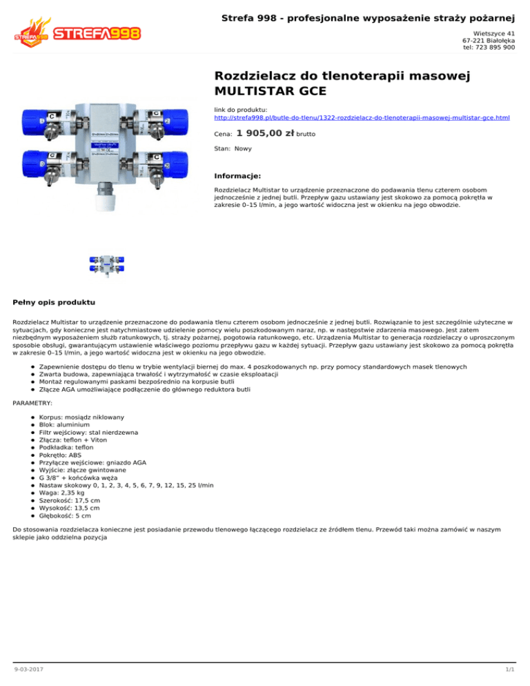 Strefa 998 - profesjonalne wyposażenie straży pożarnej Wietszyce 41 67-221 Białołęka tel: 723 895 900 Rozdzielacz do tlenoterapii masowej MULTISTAR GCE link do produktu: http://strefa998.pl/butle-do-tlenu/1322-rozdzielacz-do-tlenoterapii-masowej-multistar-gce.html Cena: 1 905,00 zł brutto Stan: Nowy Informacje: Rozdzielacz Multistar to urządzenie przeznaczone do podawania tlenu czterem osobom jednocześnie z jednej butli. Przepływ gazu ustawiany jest skokowo za pomocą pokrętła w zakresie 0–15 l/min, a jego wartość widoczna jest w okienku na jego obwodzie. Pełny opis produktu Rozdzielacz Multistar to urządzenie przeznaczone do podawania tlenu czterem osobom jednocześnie z jednej butli. Rozwiązanie to jest szczególnie użyteczne w sytuacjach, gdy konieczne jest natychmiastowe udzielenie pomocy wielu poszkodowanym naraz, np. w następstwie zdarzenia masowego. Jest zatem niezbędnym wyposażeniem służb ratunkowych, tj. straży pożarnej, pogotowia ratunkowego, etc. Urządzenia Multistar to generacja rozdzielaczy o uproszczonym sposobie obsługi, gwarantującym ustawienie właściwego poziomu przepływu gazu w każdej sytuacji. Przepływ gazu ustawiany jest skokowo za pomocą pokrętła w zakresie 0–15 l/min, a jego wartość widoczna jest w okienku na jego obwodzie. Zapewnienie dostępu do tlenu w trybie wentylacji biernej do max. 4 poszkodowanych np. przy pomocy standardowych masek tlenowych Zwarta budowa, zapewniająca trwałość i wytrzymałość w czasie eksploatacji Montaż regulowanymi paskami bezpośrednio na korpusie butli Złącze AGA umożliwiające podłączenie do głównego reduktora butli PARAMETRY: Korpus: mosiądz niklowany Blok: aluminium Filtr wejściowy: stal nierdzewna Złącza: teflon + Viton Podkładka: teflon Pokrętło: ABS Przyłącze wejściowe: gniazdo AGA Wyjście: złącze gwintowane G 3/8” + końcówka węża Nastaw skokowy 0, 1, 2, 3, 4, 5, 6, 7, 9, 12, 15, 25 l/min Waga: 2,35 kg Szerokość: 17,5 cm Wysokość: 13,5 cm Głębokość: 5 cm Do stosowania rozdzielacza konieczne jest posiadanie przewodu tlenowego łączącego rozdzielacz ze źródłem tlenu. Przewód taki można zamówić w naszym sklepie jako oddzielna pozycja 9-03-2017 1/1