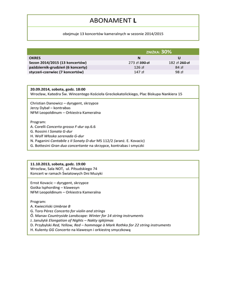 ABONAMENT L obejmuje 13 koncertów kameralnych w sezonie 2014/2015 ZNIŻKA: 30% OKRES Sezon 2014/2015 (13 koncertów) październik-grudzień (6 koncerty) styczeń-czerwiec (7 koncertów) N 273 zł 390 zł 126 zł 147 zł U 182 zł 260 zł 84 zł 98 zł 20.09.2014, sobota, godz. 18:00 Wrocław, Katedra Św. Wincentego Kościoła Greckokatolickiego, Plac Biskupa Nankiera 15 Christian Danowicz – dyrygent, skrzypce Jerzy Dybał – kontrabas NFM Leopoldinum – Orkiestra Kameralna Program: A. Corelli Concerto grosso F-dur op.6.6 G. Rossini I Sonata G-dur H. Wolf Włoska serenada G-dur N. Paganini Cantabile z II Sonaty D-dur MS 112/2 (aranż. E. Kovacic) G. Bottesini Gran duo concertante na skrzypce, kontrabas i smyczki 11.10.2013, sobota, godz. 19:00 Wrocław, Sala NOT, ul. Piłsudskiego 74 Koncert w ramach Światowych Dni Muzyki Ernst Kovacic – dyrygent, skrzypce Gośka Isphording – klawesyn NFM Leopoldinum – Orkiestra Kameralna Program: A. Kwieciński Umbrae B G. Toro Pérez Concerto for violin and strings Ő. Manav Countryside Landscape: Winter for 14 string instruments J. Janulyté Elongation of Nights – Nakty igléjimas D. Przybylski Red, Yellow, Red – hommage à Mark Rothko for 22 string instruments H. Kulenty GG Concerto na klawesyn i orkiestrę smyczkową 25.10.2014, sobota, godz. 18:00 Wrocław, sala koncertowa Filharmonii Nicolas Krauze – dyrygent Galya Bisengalieva – skrzypce Charlotte Bonneton – skrzypce Anna Rutkowska-Schock – klawesyn i fortepian preparowany Mischa Kozłowski – fortepian Igor Cecocho – trąbka NFM Leopoldinum – Orkiestra Kameralna Program: A. Schnittke I Concerto grosso na dwoje skrzypiec, klawesyn, preparowany fortepian i 21 smyczków D. Szostakowicz I Koncert na fortepian, trąbkę i smyczki c-moll op. 35 P. Czajkowski Serenada C-dur op. 48 30.11.2014, niedziela, godz. 18:00 Wrocław, sala koncertowa Filharmonii Hartmut Rohde – dyrygent, altówka NFM Leopoldinum – Orkiestra Kameralna Program: G.Ph. Telemann Koncert G-dur na altówkę i smyczki TWV 51:G9 A. Schnittke Monolog na altówkę i orkiestrę smyczkową T. Takemitsu Requiem na smyczki P. Czajkowski Sekstet smyczkowy op. 70 „Souvenir de Florence” 6.12.2014, sobota, godz. 18:00 Wrocław, sala koncertowa Filharmonii Koncert z okazji 35-lecia NFM Leopoldinum – Orkiestra Kameralna Andrzej Kosendiak – dyrygent Arkady Shilkloper – waltornia Soliści Chóru Filharmonii Wrocławskiej Chór Filharmonii Wrocławskiej Agnieszka Franków-Żelazny – kierownictwo artystyczne NFM Leopoldinum – Orkiestra Kameralna Program: A. Shilkloper Alpine Trail J. Haydn Missa Sankti Nicolai G-dur Hob. XXII:6, I Koncert na waltornię D-dur Hob. VIId:3, Symfonia fis-moll nr 45 Hob. I:45 „Pożegnalna” 20.12.2014, sobota, godz. 18:00 Wrocław, sala koncertowa Filharmonii Ian Brown – dyrygent, fortepian NFM Leopoldinum – Orkiestra Kameralna Program: J. Haydn Symfonia D-dur nr 4 Hob. I:4 W.A. Mozart Koncert fortepianowy Es-dur nr 14, KV 449 A. Corelli Concerto grosso op. 6 nr 8 „Na Boże Narodzenie“ J. Suk Serenada Es-dur op.6 10.01.2015, sobota, godz. 18:00 Wrocław, sala koncertowa Filharmonii Christian Danowicz – dyrygent, skrzypce Marcelo Nisinman – bandoneon NFM Leopoldinum – Orkiestra Kameralna Program: A. Piazzolla Las Cuatros Estaciones Porteñas na bandoneon, skrzypce, wiolonczelę i fortepian (aranż. M. Nisinman) M. Nisinman Hombre Tango na bandoneon, skrzypce, wiolonczelę, fortepian i contrabajo A. Piazzolla Concierto de Nacar neva M. Nisinman Tango na bandoneon, piano i smyczki Para los tangos – El enterriano (trad.) Ciudad Triste (trad.) El aeroplano (trad.) 14.02.2015, sobota, godz. 18:00 Wrocław, sala koncertowa Filharmonii Gil Colliard – dyrygent Helene Delalande – mezzosopran Anthony Leroy – wiolonczela NFM Leopoldinum – Orkiestra Kameralna Program: Ch.W. Gluck O del mio amor z opery Parys i Helena P.A. Cesti Intorno all’idol mio dolce ardor z opery L’Orontea A. Vivaldi Sposa son disprezziata z opery Bajazet G.F. Händel Ombra mai fu z opery Xerxes G.F. Händel Cara sposa z opery Rinaldo G.F. Händel Qui d'amor nel suo linguaggie z opery Ariodante R. Schumann Koncert wiolonczelowy a-moll op.129 (aranż. G. Colliard) 7.03.2015, sobota, godz. 18:00 Wrocław, sala koncertowa Filharmonii Giovanni Sollima – dyrygent, wiolonczela NFM Leopoldinum – Orkiestra Kameralna Program: O. Respighi Antiche danze ed arie per liuto L. Boccherini Koncert wiolonczelowy G-dur G 480 L. Boccherini Ritirata Notturna da Madrid G. Sollima LB Files (Luigi Boccherini) 28.03.2015, sobota, godz. 18:00 Wrocław, sala koncertowa Filharmonii Ernst Kovacic – dyrygent, skrzypce NFM Leopoldinum – Orkiestra Kameralna Program: W.A. Mozart III Koncert skrzypcowy G-dur KV 216, IV Koncert skrzypcowy D-dur KV 218, V Koncert skrzypcowy A-dur KV 219 18.04.2015, sobota, godz. 18:00 Wrocław, sala koncertowa Filharmonii Rudi De Beuw – dyrygent Yin Chiang – fortepian Michel Berns – trąbka NFM Leopoldinum – Orkiestra Kameralna Program: E. Elgar Serenada e-moll op. 20 D. Szostakowicz I Koncert na fortepian, trąbkę i smyczki c-moll op. 35 G. Bacewicz Koncert na orkiestrę P. Czajkowski Serenada C-dur op. 48 25.04.2015, sobota, godz. 18:00 Wrocław, sala koncertowa Filharmonii Christian Danowicz – dyrygent Agata Szymczewska – skrzypce NFM Leopoldinum – Orkiestra Kameralna Program: H.M. Górecki Trzy utwory w dawnym stylu P. Vasks Koncert skrzypcowy„Distant Light” G. Rossini I Sonata G-dur, II Sonata A-dur, III Sonata C-dur – sonaty smyczkowe na dwoje skrzypiec, wiolonczelę i kontrabas 9.05.2015, sobota, godz. 18:00 Wrocław, sala koncertowa Filharmonii Hartmut Rohde – dyrygent NFM Leopoldinum – Orkiestra Kameralna Program: R. Fuchs III Symfonia S. Laks Symfonia na smyczki J. Brahms II Kwintet smyczkowy G-dur op. 111 Narodowe Forum Muzyki zastrzega sobie prawo do wprowadzania zmian w programie.