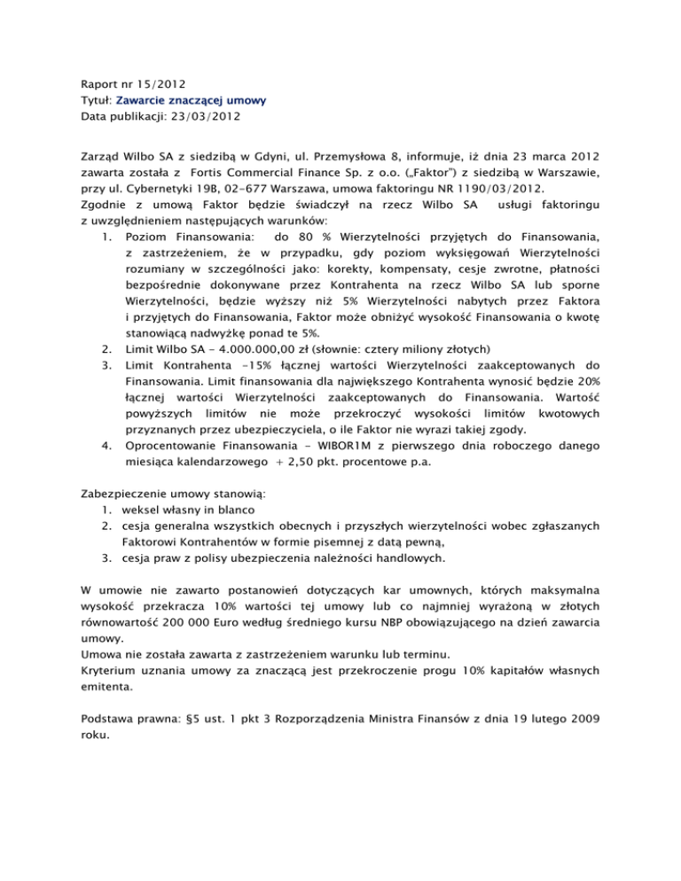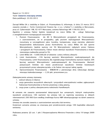Raport nr 15/2012 Tytuł: Zawarcie znaczącej umowy Data publikacji: 23/03/2012 Zarząd Wilbo SA z siedzibą w Gdyni, ul. Przemysłowa 8, informuje, iż dnia 23 marca 2012 zawarta została z Fortis Commercial Finance Sp. z o.o. („Faktor”) z siedzibą w Warszawie, przy ul. Cybernetyki 19B, 02-677 Warszawa, umowa faktoringu NR 1190/03/2012. Zgodnie z umową Faktor będzie świadczył na rzecz Wilbo SA usługi faktoringu z uwzględnieniem następujących warunków: 1. Poziom Finansowania: do 80 % Wierzytelności przyjętych do Finansowania, z zastrzeżeniem, że w przypadku, gdy poziom wyksięgowań Wierzytelności rozumiany w szczególności jako: korekty, kompensaty, cesje zwrotne, płatności bezpośrednie dokonywane przez Kontrahenta na rzecz Wilbo SA lub sporne Wierzytelności, będzie wyższy niż 5% Wierzytelności nabytych przez Faktora i przyjętych do Finansowania, Faktor może obniżyć wysokość Finansowania o kwotę stanowiącą nadwyżkę ponad te 5%. 2. Limit Wilbo SA - 4.000.000,00 zł (słownie: cztery miliony złotych) 3. Limit Kontrahenta -15% łącznej wartości Wierzytelności zaakceptowanych do Finansowania. Limit finansowania dla największego Kontrahenta wynosić będzie 20% łącznej wartości powyższych Wierzytelności limitów nie może zaakceptowanych przekroczyć do Finansowania. wysokości limitów Wartość kwotowych przyznanych przez ubezpieczyciela, o ile Faktor nie wyrazi takiej zgody. 4. Oprocentowanie Finansowania - WIBOR1M z pierwszego dnia roboczego danego miesiąca kalendarzowego + 2,50 pkt. procentowe p.a. Zabezpieczenie umowy stanowią: 1. weksel własny in blanco 2. cesja generalna wszystkich obecnych i przyszłych wierzytelności wobec zgłaszanych Faktorowi Kontrahentów w formie pisemnej z datą pewną, 3. cesja praw z polisy ubezpieczenia należności handlowych. W umowie nie zawarto postanowień dotyczących kar umownych, których maksymalna wysokość przekracza 10% wartości tej umowy lub co najmniej wyrażoną w złotych równowartość 200 000 Euro według średniego kursu NBP obowiązującego na dzień zawarcia umowy. Umowa nie została zawarta z zastrzeżeniem warunku lub terminu. Kryterium uznania umowy za znaczącą jest przekroczenie progu 10% kapitałów własnych emitenta. Podstawa prawna: §5 ust. 1 pkt 3 Rozporządzenia Ministra Finansów z dnia 19 lutego 2009 roku.
