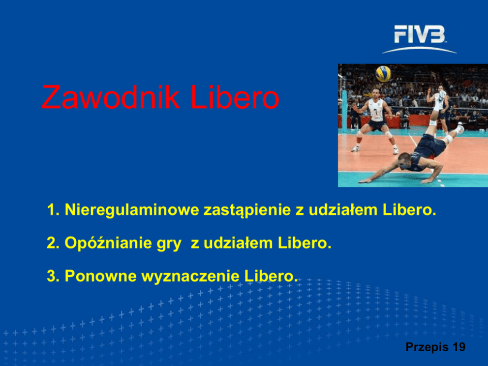 Zawodnik Libero 1. Nieregulaminowe zastąpienie z udziałem Libero. 2. Opóźnianie gry z udziałem Libero. 3. Ponowne wyznaczenie Libero. Przepis 19 Nieregulaminowe zastąpienie z udziałem Libero 19.3.2.9 Nieregulaminowe zastąpienie zawodnika Libero to między innymi: - pomiędzy dwoma zastąpieniami nie było wymiany zakończonej, - Libero został zastąpiony przez zawodnika innego niż Drugi Libero lub tego, którego zastępował. Przepis 19 Nieregulaminowe zastąpienie z udziałem Libero 6.1.3 Wymiana zakończona to ciąg zagrań, w wyniku którego przyznany jest punkt. 19.3.2.1 Liczba zastąpień jest nieograniczona, przy czym między dwoma zastąpieniami Libero musi być rozegrana wymiana zakończona (za wyjątkiem rotacji na pozycję nr 4 wymuszonej karą, lub gdy Libero Grający stając się niezdolnym do gry powoduje wymianę niezakończoną). Przepis 19 Nieregulaminowe zastąpienie z udziałem Libero 19.3.2.9 Konsekwencje nieregulaminowego zastąpienia z udziałem Libero są takie same jak zmiany nieregulaminowej. Przepis 19 Stwierdzenie nieregulaminowego zastąpienia z udziałem Libero wykryte: PRZED wykonaniem zagrywki PO wykonaniu zagrywki WYTYCZNE: Jeżeli zauważymy błąd, nie możemy dopuścić, aby zespół kontynuował grę w niewłaściwym ustawieniu! Przepis 19 Nieregulaminowe zastąpienie z udziałem Libero wykryte PRZED wykonaniem zagrywki Wykrycie błędu Asystent sekretarza: MUSI natychmiast uruchomić brzęczek Sędzia II: MUSI zagwizdać oraz odrzucić lub skorygować zastąpienie Sędzia I: stosuje UPOMNIENIE lub KARĘ za opóźnianie gry (prośba o zmianę nieregulaminową też podlega sankcjom za opóźnianie) Przepis 19 Nieregulaminowe zastąpienie z udziałem Libero wykryte PO wykonaniu zagrywki Zespół karany jest przyznaniem punktu i zagrywki przeciwnikowi Zastąpienie jest wycofywane Punkty zdobyte przez zespół popełniający błąd w okresie trwania błędu są anulowane. Punkty zdobyte przez przeciwnika są zachowane. (tak jak w przypadku zmiany nieregulaminowej po wznowieniu gry, nia ma sankcji za opóźnianie!) Przepis 19 Opóźnianie gry z udziałem Libero. 19.3.2.5 Zastąpienie wykonane po gwizdku sędziego na zagrywkę, lecz przed wykonaniem zagrywki, nie jest wycofywane, ale po zakończeniu wymiany kapitan zespołu musi być poinformowany, że jest to nieprawidłowe postępowanie i jej ponowne wykonanie będzie podstawą do udzielenia sankcji za opóźnianie. Przepis 19 Opóźnianie gry z udziałem Libero. 19.3.2.6 Każde kolejne spóźnione zastąpienie powoduje natychmiastowe przerwanie gry i sankcjonowanie zespołu za opóźnianie. W zależności od nałożonej sankcji za opóźnianie gry, sędziowie wskazują zespół, który będzie zagrywał. Przepis 19 Ponowne wyznaczenie Libero Przepis 19.4.1 Zawodnik Libero jest niezdolny do gry w przypadku kontuzji, choroby, wykluczenia lub dyskwalifikacji. czytaj: jeżeli coś się stało z Libero, poza wolą i decyzją trenera Trener lub w przypadku nieobecności trenera grający kapitan może zgłosić niezdolność zawodnika Libero do gry bez podania jakiejkolwiek przyczyny. czytaj: niezdolność wynika z decyzji trenera Przepis 19 Ponowne wyznaczenie Libero W oparciu o co podjąć decyzję, czy zespołowi przysługuje możliwość ponownego wyznaczenia Libero ? Pytanie: Ilu zawodników Libero posiada do dyspozycji zespół w momencie prośby o ponowne wyznaczenie Libero ? JEDNEGO = Wyznaczenie możliwe DWÓCH = Wyznaczenie niemożliwe Przepis 19 Ponowne wyznaczenie Libero W przypadku wykluczenia lub dyskwalifikacji Libero: Przepis 19.5.1 Wykluczony lub zdyskwalifikowany zawodnik Libero może zostać zastąpiony przez drugiego Libero. Jeśli w zespole jest tylko jeden zawodnik Libero, zespół ma prawo do wyznaczenia nowego Libero. Możliwości: - zastąpienie przez zawodnika podstawowego ALBO - zastąpienie przez drugiego Libero (jeśli dostępny) ALBO - zastąpienie przez nowo wyznaczonego Libero Przepis 19 Ponowne wyznaczenie Libero Przepis 19.4.2.2 Jeśli Grający Libero jest niezdolny do gry, może zostać zastąpiony przez zawodnika ustawienia początkowego lub bezpośrednio i natychmiast przez nowo wyznaczonego zawodnika Libero. Utrata zdolności do gry może nastąpić także poza boiskiem! Przepis 19 Przykłady wyznaczania Libero (1/2) Libero 1 (zdarzenie pierwotne) Libero 2 (zdarzenie wtórne) Prawo do wyznaczenia Libero (w miejsce Libero 2) Kontuzja* Kontuzja* TAK Wyznaczenie możliwe dopiero po kontuzji Libero 2 (w zespole pozostał tylko 1 Libero). Uwagi Wykluczenie Kontuzja* TAK Od początku kolejnego seta zespół ma do dyspozycji znowu dwóch Libero (Libero 2 nie gra do końca meczu). Dyskwalifikacja Kontuzja* TAK Zespół kontynuuje grę tylko z jednym Libero. TAK Libero 2 nie może wrócić do gry do końca meczu, ponieważ w jego miejsce został wyznaczony nowy Libero. W zespole pozostał tylko jeden Libero. Kontuzja* Wykluczenie Wykluczenie Wykluczenie TAK Libero 2 nie może wrócić do gry do końca meczu ale Libero 1 wróci do gry w kolejnym secie. Zespół będzie więc posiadał znowu dwóch Libero. Dyskwalifikacja Wykluczenie TAK Libero 2 nie może wrócić do gry do końca meczu. Zespół kontynuuje grę tylko z jednym Libero. * Niezdolny do gry do końca meczu Przepis 19 Przykłady wyznaczania Libero (2/2) Libero 1 (zdarzenie pierwotne) Libero 2 (zdarzenie wtórne) Prawo do wyznaczenia Libero (w miejsce Libero 2) Kontuzja* Dyskwalifikacja TAK Zespół kontynuuje grę tylko z jednym Libero. Uwagi Wykluczenie Dyskwalifikacja TAK Od początku kolejnego seta zespół ma do dyspozycji znowu dwóch Libero (wykluczony Libero powróci do gry). Dyskwalifikacja Dyskwalifikacja TAK Zespół kontynuuje grę tylko z jednym Libero Kontuzja* Niezdolny do gry** TAK Trener może wpływać na jakość gry zespołu poprzez wykorzystanie innego Libero. Zespół kontynuuje grę tylko z jednym Libero. Wykluczenie Niezdolny do gry** TAK Od początku kolejnego seta zespół ma do dyspozycji