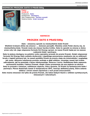 Informacje o produkcie Utworzono 09-03-2017 NIEMIECKI PROSZEK DATO 8 PRAŃ/580g Cena : 13,99 zł Producent : Dato Dostępność : Dostępny Stan magazynowy : bardzo wysoki Średnia ocena : brak recenzji NIEMIECKI PROSZEK DATO 8 PRAŃ/580g Dato – wiosenny sposób na nieskazitelnie białe firanki Wielkimi krokami zbliża się wiosna i ... domowe porządki. Niestety wiele Polek skarży się, że nieskazitelną bielą firanek może się cieszyć bardzo krótko. Dato to sposób na wiosnę w domu przez cały rok. Jego ulepszona formuła Oxi Energy sprawi, że nasze firanki będą już na zawsze cudownie białe i pachnące. Dato to jedyny dostępny na polskim rynku specjalny proszek do prania firanek. Dzięki ulepszonej formule Oxi Energy Dato wybiela skutecznie i zapobiega ponownemu osadzaniu się na włóknach brudu z kąpieli piorącej tak, że nawet pożółkłe firanki po praniu stają się śnieżnobiałe i wyglądają jak nowe. Aktywne substancje proszku wnikają w głąb włókien, usuwając nawet tak trudne zabrudzenia, jak te powstałe z dymu nikotynowego, tłuszczu i kurzu. Dodatkowo Dato zapewnia zachowanie kształtu i faktury firanek, dzięki czemu prezentują się one pięknie na oknach. Dato to proszek o świeżym, subtelnym zapachu, który sprawia, że firanki są fantastycznie białe i pachnące. Pierze doskonale nawet w temperaturze 30ºC, tworząc delikatną pianę, która osłania włókna i chroni nawet najcieńsze z nich przed zniszczeniem. Dato można stosować nie tylko do prania firanek, ale także białych tkanin z włókien syntetycznych, mieszanych i naturalnych. Wygenerowano w programie www.oscGold.com