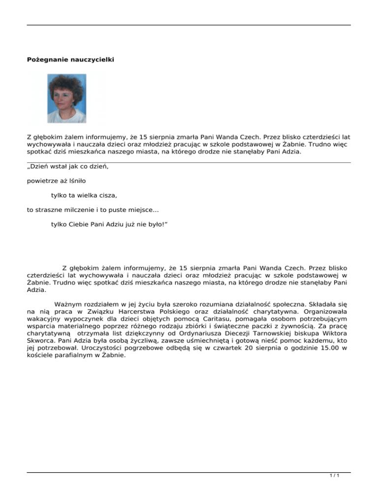 Pożegnanie nauczycielki Z głębokim żalem informujemy, że 15 sierpnia zmarła Pani Wanda Czech. Przez blisko czterdzieści lat wychowywała i nauczała dzieci oraz młodzież pracując w szkole podstawowej w Żabnie. Trudno więc spotkać dziś mieszkańca naszego miasta, na którego drodze nie stanęłaby Pani Adzia. „Dzień wstał jak co dzień, powietrze aż lśniło tylko ta wielka cisza, to straszne milczenie i to puste miejsce… tylko Ciebie Pani Adziu już nie było!” Z głębokim żalem informujemy, że 15 sierpnia zmarła Pani Wanda Czech. Przez blisko czterdzieści lat wychowywała i nauczała dzieci oraz młodzież pracując w szkole podstawowej w Żabnie. Trudno więc spotkać dziś mieszkańca naszego miasta, na którego drodze nie stanęłaby Pani Adzia. Ważnym rozdziałem w jej życiu była szeroko rozumiana działalność społeczna. Składała się na nią praca w Związku Harcerstwa Polskiego oraz działalność charytatywna. Organizowała wakacyjny wypoczynek dla dzieci objętych pomocą Caritasu, pomagała osobom potrzebującym wsparcia materialnego poprzez różnego rodzaju zbiórki i świąteczne paczki z żywnością. Za pracę charytatywną otrzymała list dziękczynny od Ordynariusza Diecezji Tarnowskiej biskupa Wiktora Skworca. Pani Adzia była osobą życzliwą, zawsze uśmiechniętą i gotową nieść pomoc każdemu, kto jej potrzebował. Uroczystości pogrzebowe odbędą się w czwartek 20 sierpnia o godzinie 15.00 w kościele parafialnym w Żabnie. 1/1 Powered by TCPDF (www.tcpdf.org)