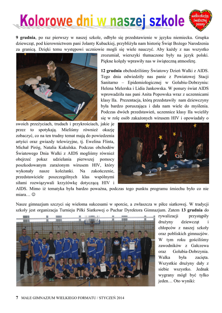 9 grudnia, po raz pierwszy w naszej szkole, odbyło się przedstawienie w języku niemiecku. Grupka dziewcząt, pod kierownictwem pani Jolanty Kubackiej, przybliżyła nam historię Świąt Bożego Narodzenia za granicą. Dzięki temu występowi uczniowie mogli się wiele nauczyć. Aby każdy z nas wszystko zrozumiał, wierszyki tłumaczone były na język polski. Piękne kolędy wprawiły nas w świąteczną atmosferę. 12 grudnia obchodziliśmy Światowy Dzień Walki z AIDS. Tego dnia odwiedziły nas panie z Powiatowej Stacji Sanitarno – Epidemiologicznej w Golubiu-Dobrzyniu: Helena Melerska i Lidia Jankowska. W ponury świat AIDS wprowadziła nas pani Anita Popowska wraz z uczennicami klasy IIa. Prezentacja, którą przedstawiły nam dziewczyny była bardzo poruszająca i dała nam wiele do myślenia. Podczas dwóch przedstawień, uczennice klasy IIa wcieliły się w rolę osób zakażonych wirusem HIV i opowiadały o swoich przeżyciach, trudach i przykrościach, jakie je przez to spotykają. Mieliśmy również okazję zobaczyć, co na ten trudny temat mają do powiedzenia artyści oraz gwiazdy telewizyjne, tj. Ewelina Flinta, Michał Piróg, Natalia Kukulska. Podczas obchodów Światowego Dnia Walki z AIDS mogliśmy również obejrzeć pokaz udzielania pierwszej pomocy poszkodowanym zarażonym wirusem HIV, który wykonały nasze koleżanki. Na zakończenie, przedstawiciele poszczególnych klas wspólnymi siłami rozwiązywali krzyżówkę dotyczącą HIV i AIDS. Mimo iż tematyka była bardzo poważna, podczas tego punktu programu śmiechu było co nie miara… Nasze gimnazjum szczyci się wieloma sukcesami w sporcie, a zwłaszcza w piłce siatkowej. W tradycji szkoły jest organizacja Turnieju Piłki Siatkowej o Puchar Dyrektora Gimnazjum. Zatem 13 grudnia do rywalizacji przystąpiły drużyny dziewcząt i chłopców z naszej szkoły oraz pobliskich gimnazjów. W tym roku gościliśmy zawodników z Gałczewa oraz Golubia-Dobrzynia. Walka była zacięta. Wszystkie drużyny dały z siebie wszystko. Jednak wygrany mógł być tylko jeden… Oto wyniki: 7 MAŁE GIMNAZJUM WIELKIEGO FORMATU / STYCZEŃ 2014