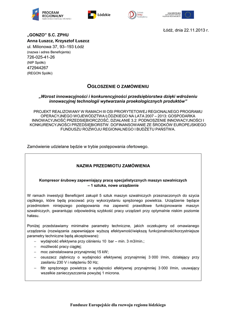 Łódź, dnia 22.11.2013 r. „GONZO” S.C. ZPHU Anna Łuszcz, Krzysztof Łuszcz ul. Milionowa 37, 93–193 Łódź (nazwa i adres Beneficjenta) 726-025-41-26 (NIP Spółki) 472944267 (REGON Spółki) OGŁOSZENIE O ZAMÓWIENIU „Wzrost innowacyjności i konkurencyjności przedsiębiorstwa dzięki wdrożeniu innowacyjnej technologii wytwarzania proekologicznych produktów” PROJEKT REALIZOWANY W RAMACH III OSI PRIORYTETOWEJ REGIONALNEGO PROGRAMU OPERACYJNEGO WOJEWÓDZTWA ŁÓDZKIEGO NA LATA 2007 – 2013: GOSPODARKA INNOWACYJNOŚĆ PRZEDSIĘBIORCZOŚĆ, DZIAŁANIE 3.2: PODNOSZENIE INNOWACYJNOŚCI I KONKURENCYJNOŚCI PRZEDSIĘBIORSTW. DOFINANSOWANIE ZE ŚRODKÓW EUROPEJSKIEGO FUNDUSZU ROZWOJU REGIONALNEGO I BUDŻETU PAŃSTWA. Zamówienie udzielane będzie w trybie postępowania ofertowego. NAZWA PRZEDMIOTU ZAMÓWIENIA Kompresor śrubowy zapewniający pracę specjalistycznych maszyn szwalniczych – 1 sztuka, nowe urządzenie W ramach inwestycji Beneficjent zakupił 5 sztuk maszyn szwalniczych przeznaczonych do szycia ciężkiego, które będą pracować przy wykorzystaniu sprężonego powietrza. Urządzenie będące przedmiotem niniejszego postępowania ma zapewnić prawidłowe funkcjonowanie maszyn szwalniczych, gwarantując odpowiednią szybkość pracy urządzeń przy optymalnie niskim poziomie hałasu. Poniżej przedstawiamy minimalne parametry techniczne, jakich oczekujemy od omawianego urządzenia (rozwiązania zapewniające wyższą efektywność/większą funkcjonalność/korzystniejsze parametry techniczne będą akceptowane): wydajność efektywna przy ciśnieniu 10 bar – min. 3 m3/min.; możliwość pracy ciągłej; moc zainstalowana przynajmniej 15 kW; osuszacz ziębniczy o wydajności efektywnej przynajmniej 3 000 l/min, działający przy zasilaniu 230 V i natężeniu 50 Hz; filtr sprężonego powietrza o wydajności efektywnej przynajmniej 3 000 l/min, usuwający wszelkie zanieczyszczenia powyżej 1 microna. Fundusze Europejskie dla rozwoju regionu łódzkiego Prosimy o przedstawienie ceny oferty w postaci tabeli: Lp. Przedmiot zamówienia Jednostka miary Ilość 1 Kompresor śrubowy zapewniający pracę specjalistycznych maszyn szwalniczych szt. 1 Cena jednostkowa netto Wartość netto Stawka VAT (%) Wartość VAT Wartość brutto Razem OPIS KRYTERIÓW, KTÓRYMI FIRMA BĘDZIE SIĘ KIEROWAŁA PRZY WYBORZE OFERTY ORAZ ZNACZENIE TYCH KRYTERIÓW Maksymalna liczba punktów możliwych do uzyskania – 100 Lp. 1 Rodzaj Kryterium Cena łączna oferty netto Punktacja Oferent proponujący najniższą cenę otrzyma maksymalną liczbę punktów tj. 60. Kolejnym oferentom będą przyznawane punkty w następujący sposób: Od 0 do 60 Gwarancja 2 (w miesiącach) Od 0 do 30 Oferent proponujący najdłuższy okres gwarancji otrzyma maksymalną liczbę punktów tj. 30. Kolejnym oferentom będą przyznawane punkty w następujący sposób: Oferent proponujący najkrótszy czas reakcji serwisowej otrzyma maksymalną liczbę punktów tj. 10. Kolejnym oferentom będą przyznawane punkty w następujący sposób: Od 0 do 10 (w dniach roboczych) Liczba punktów badanej oferty = stosunek ceny w ofercie z najniższą ceną do ceny badanej oferty mnożony przez 60 Liczba punktów badanej oferty = stosunek okresu gwarancji w badanej ofercie do okresu gwarancji w ofercie z najdłuższą gwarancją mnożony przez 30 Czas reakcji serwisowej 3 Sposób oceny Liczba punktów badanej oferty = stosunek czasu reakcji serwisowej z oferty z najkrótszym czasem reakcji serwisowej do czasu reakcji serwisowej badanej oferty mnożony przez 10 Brak informacji w zakresie rozważanego kryterium równoznaczny będzie z przyznaniem 0 ilości punktów w tymże kryterium. Fundusze Europejskie dla rozwoju regionu łódzkiego OPIS WARUNKÓW UDZIAŁU W POSTĘPOWANIU OFERTOWYM: W ramach postępowania nie dopuszcza się składania ofert wariantowych. Celem zapewnienia możliwości porównania ofert, prosimy by przesłana przez Państwa oferta zawierała Państwa dane rejestrowe oraz teleadresowe. Ponadto, prosimy o wskazanie okresu ważności oferty oraz o podanie terminu dostawy urządzenia. Dodatkowo prosimy wskazać również okres możliwej do udzielenia gwarancji dla omawianego urządzenia, oferowanego czasu reakcji serwisowej oraz określić warunki płatności. Przedmiotem zamówienia musi być urządzenie posiadające certyfikat zgodności CE. Miejsce realizacji zamówienia: Przedmiot zamówienia powinien zostać dostarczony pod następujący adres: „GONZO” S.C. ZPHU Anna Łuszcz, Krzysztof Łuszcz ul. Milionowa 37, 93–193 Łódź Termin realizacji zamówienia: Ostateczny termin realizacji zamówienia upływa w dniu 10.02.2014 r. Ostateczny termin składania ofert: 10.12.2013 r., godzina 15.00. Oferty wraz ze szczegółową specyfikacją należy składać osobiście lub listownie na adres: „GONZO” S.C. ZPHU Anna Łuszcz, Krzysztof Łuszcz, ul. Milionowa 37, 93–193 Łódź Oferty składane listownie lub osobiście prosimy umieścić w dwóch zaklejonych kopertach, z adnotacją na wewnętrznej kopercie: „Postępowanie na kompresor - Otworzyć dnia 10.12.2013 r.” Data i miejsce otwarcia ofert: 10.12.2013 r., godzina 15:30 r., ul. Milionowa 37, 93–193 Łódź Osoba do kontaktu w ramach zamówienia: Krzysztof Łuszcz, tel. +48 42 683 32 14, e-mail: [email protected], [email protected] Oferty, które wpłyną do Zamawiającego/Beneficjenta po upływie terminu na składanie ofert nie będą rozpatrywane. W przypadku podania wartości ofert w walucie obcej, wartość zamówienia będzie przeliczana na złotówki według średniego kursu NBP z dnia otwarcia ofert. Poprzez złożenie oferty Oferent wyraża zgodę na podanie do wiadomości pozostałych Oferentów szczegółów oferty. Oferent ma prawo nie wyrazić zgody na podanie do wiadomości szczegółów technicznych przedmiotu zamówienia poprzez zawarcie stosownej adnotacji w treści składanej oferty. Fundusze Europejskie dla rozwoju regionu łódzkiego