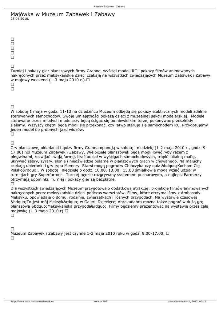Muzeum Zabawek i Zabawy Majówka w Muzeum Zabawek i Zabawy 28.04.2010. Turniej i pokazy gier planszowych firmy Granna, wyścigi modeli RC i pokazy filmów animowanych nakręconych przez meksykańskie dzieci czekają na wszystkich zwiedzających Muzeum Zabawek i Zabawy w majowy weekend (1-3 maja 2010 r.). W sobotę 1 maja w godz. 11-13 na dziedzińcu Muzeum odbędą się pokazy elektrycznych modeli zdalnie sterowanych samochodów. Swoje umiejętności pokażą dzieci z muzealnej sekcji modelarskiej. Modele sterowane przez młodych modelarzy będą ścigać się po niewielkim torze, pokonywać przeszkody i slalomy. Wszyscy chętni będą mogli się przekonać, czy łatwo steruje się samochodem RC. Przygotujemy jeden model do próbnych jazd widzów. Gry planszowe, układanki i quizy firmy Granna opanują w sobotę i niedzielę (1-2 maja 2010 r., godz. 917.00) hol Muzeum Zabawek i Zabawy. Wielbiciele planszówek będą mogli łowić ryby razem z pingwinami, rozwijać swoją farmę, brać udział w wyścigach samochodowych, tropić lokalną mafię, ukrywać zebry, żyrafy, słonie i niedźwiedzie polarne w planszowych grach w chowanego. Na maluchy czekają ubieranki i gry typu Memory. Starsi mogą pograć w Chińczyka czy quiz „Kocham Cię Polsko”. W sobotę i niedzielę o godz. 10.00, 13.00 i 15.00 śmiałkowie mogą wziąć udział w turniejach gry Superfarmer . Turniej będzie rozgrywany systemem pucharowym, a najlepsi Farmerzy otrzymają upominki. Turniej i pokazy gier są bezpłatne. Dla wszystkich zwiedzających Muzeum przygotowało dodatkową atrakcję: projekcję filmów animowanych nakręconych przez meksykańskie dzieci podczas warsztatów. Filmy, które otrzymaliśmy z Ambasady Meksyku, opowiadają o domu, rodzinie, zwierzątkach i różnych przygodach. Na wystawie czasowej „To jest mój Meksyk” w Galerii Dziecięcej Abrakadabra można także pograć w dużą grę planszową „Meksykańska przygoda”. Filmy będziemy prezentować na wystawie przez całą majówkę (1-3 maja 2010 r). Muzeum Zabawek i Zabawy jest czynne 1-3 maja 2010 roku w godz. 9.00-17.00. http://www.arch.muzeumzabawek.eu Kreator PDF Utworzono 9 March, 2017, 00:12