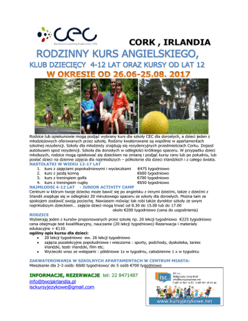 CORK , IRLANDIA Rodzice lub opiekunowie mogą podjąć wybrany kurs dla szkoły CEC dla dorosłych, a dzieci jeden z młodzieżowych oferowanych przez szkołę. Rodziny kwaterowane są wspólnie w apartamentach szkolnej rezydencji. Szkoły dla młodzieży znajdują się rezydencyjnych przedmieściach Corku. Dojazd autobusem spod rezydencji. Szkoła dla dorosłych w odległości krótkiego spaceru. W przypadku dzieci młodszych, rodzice mogą opiekować się dzieckiem na zmianę i podjąć kursy rano lub po południu, lub posłać dzieci na dzienne zajęcia dla najmłodszych – półkolonie dla dzieci irlandzkich i z całego świata. NASTOLATKI W WIEKU 12-17 LAT 1. kurs z zajęciami popołudniowymi i wycieczkami €475 tygodniowo 2. kurs z jazdą konną €600 tygodniowo 3. kurs z treningiem golfa €700 tygodniowo 4. kurs z treningiem rugby €650 tygodniowo NAJMŁODSI 4-12 LAT - JUNIOR ACTIVITY CAMP Centrum w którym twoje dziecko może bawić się po angielsku z innymi dziećmi, także z dziećmi z Irlandii znajduje się w odległości 20 minutowego spaceru ze szkoły dla dorosłych. Można tam ze spokojem zostawić swoją pociechę. Nawiasem mówiąc tak robi także dyrektor szkoły ze swym najmłodszym dzieckiem… zajęcia dzieci mogą trwać od 8.30 do 15.00 lub do 17.00 około €200 tygodniowo (cena do uzgodnienia) RODZICE Wybierają jeden z kursów proponowanych przez szkołę np. 20 lekcji tygodniowo €225 tygodniowo cena obejmuje test kwalifikacyjny, nauczanie (20 lekcji tygodniowo) Rezerwacja i materiały edukacyjne + €110. ogólny opis kursu dla dzieci: 20 lekcji tygodniowo ew. 26 lekcji tygodniowo zajęcia pozalekcyjne popołudniowe i wieczorne : sporty, podchody, dyskoteka, taniec irlandzki, teatr irlandzki, film etc. Wycieczki wraz ze wstępami : półdniowe 1x w tygodniu, całodzienne 1 x w tygodniu ZAKWATEROWANIA W SZKOLNYCH APARTAMENTACH W CENTRUM MIASTA: Mieszkanie dla 2-3 osób: €600 tygodniowo/ do 5 osób €700 tygodniowo INFORMACJE, REZERWACJE tel: 22 8471487 [email protected] [email protected]