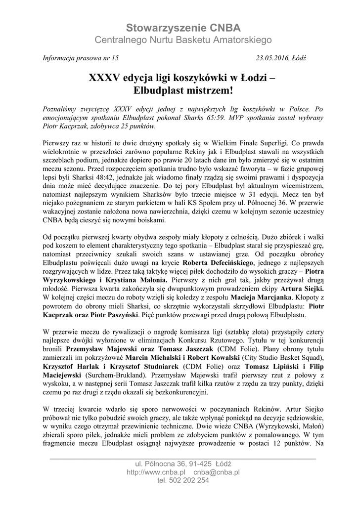 Stowarzyszenie CNBA Centralnego Nurtu Basketu Amatorskiego Informacja prasowa nr 15 23.05.2016, Łódź XXXV edycja ligi koszykówki w Łodzi – Elbudplast mistrzem! Poznaliśmy zwycięzcę XXXV edycji jednej z największych lig koszykówki w Polsce. Po emocjonującym spotkaniu Elbudplast pokonał Sharks 65:59. MVP spotkania został wybrany Piotr Kacprzak, zdobywca 25 punktów. Pierwszy raz w historii te dwie drużyny spotkały się w Wielkim Finale Superligi. Co prawda wielokrotnie w przeszłości zarówno popularne Rekiny jak i Elbudplast stawali na wszystkich szczeblach podium, jednakże dopiero po prawie 20 latach dane im było zmierzyć się w ostatnim meczu sezonu. Przed rozpoczęciem spotkania trudno było wskazać faworyta – w fazie grupowej lepsi byli Sharksi 48:42, jednakże jak wiadomo finały rządzą się swoimi prawami i dyspozycja dnia może mieć decydujące znaczenie. Do tej pory Elbudplast był aktualnym wicemistrzem, natomiast najlepszym wynikiem Sharksów było trzecie miejsce w 31 edycji. Mecz ten był niejako pożegnaniem ze starym parkietem w hali KS Społem przy ul. Północnej 36. W przerwie wakacyjnej zostanie nałożona nowa nawierzchnia, dzięki czemu w kolejnym sezonie uczestnicy CNBA będą cieszyć się nowymi boiskami. Od początku pierwszej kwarty obydwa zespoły miały kłopoty z celnością. Dużo zbiórek i walki pod koszem to element charakterystyczny tego spotkania – Elbudplast starał się przyspieszać grę, natomiast przeciwnicy szukali swoich szans w ustawianej grze. Od początku obrońcy Elbudplastu poświęcali dużo uwagi na krycie Roberta Defecińskiego, jednego z najlepszych rozgrywających w lidze. Przez taką taktykę więcej piłek dochodziło do wysokich graczy – Piotra Wyrzykowskiego i Krystiana Małonia. Pierwszy z nich grał tak, jakby przeżywał drugą młodość. Pierwsza kwarta zakończyła się dwupunktowym prowadzeniem ekipy Artura Siejki. W kolejnej części meczu do roboty wzięli się koledzy z zespołu Macieja Marcjanka. Kłopoty z powrotem do obrony mieli Sharksi, co skrzętnie wykorzystali skrzydłowi Elbudplastu: Piotr Kacprzak oraz Piotr Paszyński. Pięć punktów przewagi przed drugą połową Elbudplastu. W przerwie meczu do rywalizacji o nagrodę komisarza ligi (sztabkę złota) przystąpiły cztery najlepsze dwójki wyłonione w eliminacjach Konkursu Rzutowego. Tytułu w tej konkurencji bronili Przemysław Majewski oraz Tomasz Jaszczak (CDM Folie). Plany obrony tytułu zamierzali im pokrzyżować Marcin Michalski i Robert Kowalski (City Studio Basket Squad), Krzysztof Harlak i Krzysztof Studniarek (CDM Folie) oraz Tomasz Lipiński i Filip Maciejewski (Surchem-Brukland). Przemysław Majewski trafił pierwszy rzut z połowy z wyskoku, a w następnej serii Tomasz Jaszczak trafił kilka rzutów z rzędu za trzy punkty, dzięki czemu po raz drugi z rzędu okazali się bezkonkurencyjni. W trzeciej kwarcie wdarło się sporo nerwowości w poczynaniach Rekinów. Artur Siejko próbował nie tylko pobudzić swoich graczy, ale także wpłynąć poniekąd na decyzje sędziowskie, w wyniku czego otrzymał przewinienie techniczne. Dwie wieże CNBA (Wyrzykowski, Małoń) zbierali sporo piłek, jednakże mieli problem ze zdobyciem punktów z pomalowanego. W tym fragmencie meczu Elbudplast osiągnął najwyższe prowadzenie w postaci 12 punktów. Na __________________________________________________________________ ul. Północna 36, 91-425 Łódź http://www.cnba.pl [email protected] tel. 502 202 254 Stowarzyszenie CNBA Centralnego Nurtu Basketu Amatorskiego początku czwartej kwarty seria celnych rzutów zza łuku pozwoliła zbliżyć się Sharksom na cztery punkty (50:54), jednakże wtedy Michał Bieżyński i Piotr Kacprzak trafili swoje próby z półdystansu. W końcówce Rekiny miały jeszcze swoje szanse których nie udało im się wykorzystać. Po emocjonującym meczu, obfitującym w faule niesportowe, techniczne, wiele zbiórek i dobitek, a także efektownych bloków (jak chociażby „czapa” rozgrywającego Sharksów na graczu podkoszowym) Elbudplast odzyskał tytuł i został mistrzem XXXV edycji ligi koszykówki CNBA! MVP spotkania został wybrany Piotr Kacprzak z drużyny aktualnych mistrzów. Na swoim koncie zanotował 25 punktów (9/14 celnych rzutów za dwa), 5 zbiórek, 3 przechwyty i jeden blok. Dzielnie wspierał go Maciej Marcjanek, który mimo niskiej zdobyczy punktowej (7 oczek) może pochwalić się 11 zbiórkami, 5 asystami, 4 przechwytami i jednym blokiem. Po drugiej stronie parkietu błyszczał Piotr Wyrzykowski. Jego imponujące double double w postaci 22 punktów, 15 zbiórek to było za mało, aby cieszyć się z ewentualnego końcowego sukcesu. Robert Defeciński rzucił łącznie 15 punktów, jednakże mocno naciskany w ataku miał problem ze skutecznością z dystansu (jedna celna trójka na 11 prób). Elbudplast – Sharks 65:59 (12:14, 21:14, 17:11, 15:20) Punkty :(Elbudplast) Kacprzak 25, Bieżyński 10, Korpecki 9, Paszyński 9, Marcjanek 7, Solarek 3, Nowicki 2 (Sharks) Wyrzykowski 22, Defeciński 15, Małoń 7, Szczepaniak 7, Wypych 4, Głowacki 2, Grabowski 2. Sędziowie: Piotr Cyniak, Damian Wiaderny W przerwie meczu jak i tuż po jego zakończeniu odbyła się Ceremonia Wręczenia Nagród dla najlepszych drużyn i zawodników minionej edycji. Nagrody wręczał Michał Pietrakiewicz (komisarz ligi) w towarzystwie Michała Jarosławskiego (dyrektora KS Społem Łódź). Nagrodami w postaci m.in. efektownych dyplomów, nagród rzeczowych, statuetek, medali zostali nagrodzeni: najskuteczniejsi gracze (Tomasz Pietruszewski, Piotr Lewandowski, Mateusz Tylkowski) najlepsi obrońcy (Łukasz Sil, Dominik Kaczmarek, Aleksander Maj) najlepsi strzelcy (Maciej Morawski, Marcin Rydlewski, Dawid Strzelecki) mistrz I (Rozjuszone Leniwce) oraz II ligi (ŁKSG) Najlepsze trzy drużyny Superligi (Z Kimś, Sharks, Elbudplast) otrzymały dyplomy oraz statuetki specjalnie zaprojektowane i wykonane na to w