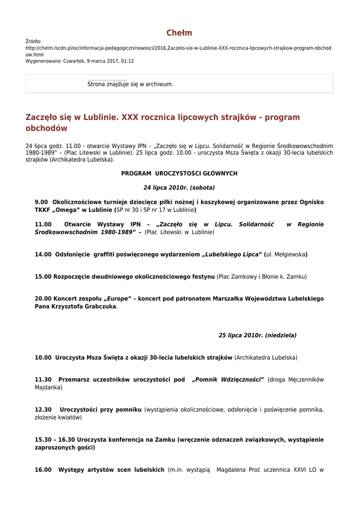 Chełm Źródło: http://chelm.lscdn.pl/oc/informacja-pedagogiczn/nowosci/2016,Zaczelo-sie-w-Lublinie-XXX-rocznica-lipcowych-strajkow-program-obchod ow.html Wygenerowano: Czwartek, 9 marca 2017, 01:12 Strona znajduje się w archiwum. Zaczęło się w Lublinie. XXX rocznica lipcowych strajków - program obchodów 24 lipca godz. 11.00 - otwarcie Wystawy IPN – „Zaczęło się w Lipcu. Solidarność w Regionie Środkowowschodnim 1980-1989” – (Plac Litewski w Lublinie). 25 lipca godz. 10.00 - uroczysta Msza Święta z okazji 30-lecia lubelskich strajków (Archikatedra Lubelska). PROGRAM UROCZYSTOŚCI GŁÓWNYCH 24 lipca 2010r. (sobota) 9.00 Okolicznościowe turnieje dziecięce piłki nożnej i koszykowej organizowane przez Ognisko TKKF „Omega” w Lublinie (SP nr 30 i SP nr 17 w Lublinie) 11.00 Otwarcie Wystawy IPN – „Zaczęło się w Lipcu. Środkowowschodnim 1980-1989” – (Plac Litewski w Lublinie) Solidarność w Regionie 14.00 Odsłonięcie graffiti poświęconego wydarzeniom „Lubelskiego Lipca” (ul. Mełgiewska) 15.00 Rozpoczęcie dwudniowego okolicznościowego festynu (Plac Zamkowy i Błonie k. Zamku) 20.00 Koncert zespołu „Europe” – koncert pod patronatem Marszałka Województwa Lubelskiego Pana Krzysztofa Grabczuka. 25 lipca 2010r. (niedziela) 10.00 Uroczysta Msza Święta z okazji 30-lecia lubelskich strajków (Archikatedra Lubelska) 11.30 Przemarsz uczestników uroczystości pod Majdanka) „Pomnik Wdzięczności” (droga Męczenników 12.30 Uroczystości przy pomniku (wystąpienia okolicznościowe, odsłonięcie i poświęcenie pomnika, złożenie kwiatów) 15.30 – 16.30 Uroczysta konferencja na Zamku (wręczenie odznaczeń związkowych, wystąpienie zaproszonych gości) 16.00 Występy artystów scen lubelskich (m.in. wystąpią Magdalena Proć uczennica XXVI LO w Lublinie, Zespół „Wiolinki” z Zespołu Szkół z Krężnicy Jarej, Agnieszka Chrząstowska i Agnieszka Dancewicz – uczennice Gimnazjum nr 9 w Lublinie, Zespół „Elita” z Gimnazjum nr 1 w Lublinie) 16.30 Występ lubelskiej młodzieży Elita Gimnazjum nr I w Lublinie 18.00 Koncert zespołu ROCK FM 20.00 Koncert okolicznościowy „W hołdzie Solidarności- drogi do wolności” z udziałem artystów scen polskich (występ zespołu „Lombard” - Plac Zamkowy)