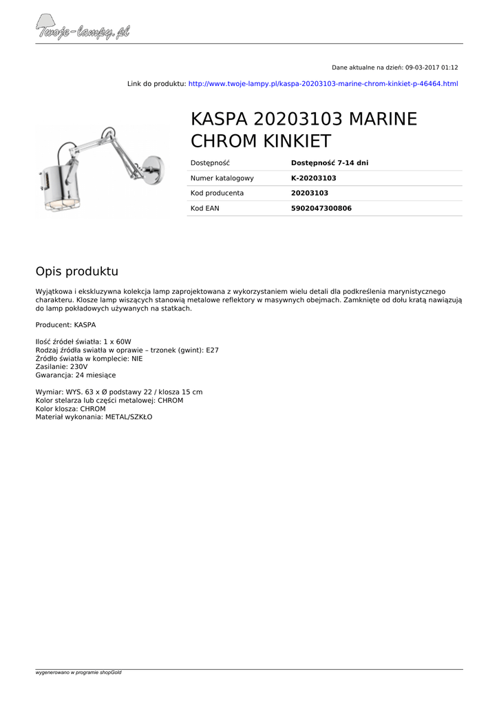 kaspa 20203103 marine chrom kinkiet - Twoje
