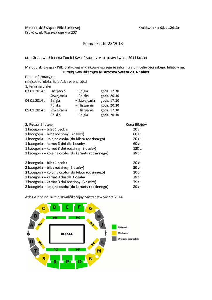Małopolski Związek Piłki Siatkowej Kraków, ul. Ptaszyckiego 4 p.207 Kraków, dnia 08.11.2013r Komunikat Nr 28/2013 dot: Grupowe Bilety na Turniej Kwalifikacyjny Mistrzostw Świata 2014 Kobiet Małopolski Związek Piłki Siatkowej w Krakowie uprzejmie informuje o możliwości zakupu biletów na: Turniej Kwalifikacyjny Mistrzostw Świata 2014 Kobiet Dane informacyjne miejsce turnieju: hala Atlas Arena Łódź 1. terminarz gier 03.01.2014 : Hiszpania – Belgia godz. 17.30 Szwajcaria – Polska godz. 20.30 04.01.2014 : Belgia – Szwajcaria godz. 17.30 Polska – Hiszpania godz. 20.30 05.01.2014 : Szwajcaria – Hiszpania godz. 17.30 Polska – Belgia godz. 20.30 2. Rodzaj Biletów 1 kategoria – bilet 1 osoba 1 kategoria – bilet rodzinny (3 osoby) 1 kategoria – kolejna osoba (do biletu rodzinnego) 1 kategoria – karnet 3 dni dla 1 osoby 1 kategoria – karnet 3 dni rodzinny (3 osoby) 1 kategoria – kolejna osoba (do karnetu rodzinnego) Cena Biletów 30 zł 60 zł 20 zł 60 zł 120 zł 39 zł 2 kategoria – bilet 1 osoba 2 kategoria – bilet rodzinny (3 osoby) 2 kategoria – kolejna osoba (do biletu rodzinnego) 2 kategoria – karnet 3 dni dla 1 osoby 2 kategoria – karnet 3 dni rodzinny (3 osoby) 2 kategoria – kolejna osoba (do karnetu rodzinnego) 20 zł 39 zł 10 zł 39 zł 79 zł 20 zł Atlas Arena na Turniej Kwalifikacyjny Mistrzostw Świata 2014 Zgłoszenia uprasza się o kierowanie w formie elektroniczne - [email protected] lub papierowej na adres Małopolski Związek Piłki Siatkowej 31-979 Kraków ul. Ptaszyckiego 4 / 207 w terminie do dnia 18.11.2013 Zgłoszenie winno zawierać dane: - Pieczątka firmowa - numer telefonu kontaktowego - ilość biletów z określeniem kategorii - zobowiązanie zamawiającego do wykupu zamówionych biletów Zamówienie na bilety winno być podpisane przez osoby upoważnione stosownie do Statut Klubu, Stowarzyszenia, Instytucji, Organizacji. Po zbilansowaniu zamówionych biletów w dniu 19.11.2013 zostaną przekazane zamówienia do Polskiego Związku Piłki Siatkowej – celem dalszego pilotowania. Wiceprezes /./ Dariusz Pomykalski