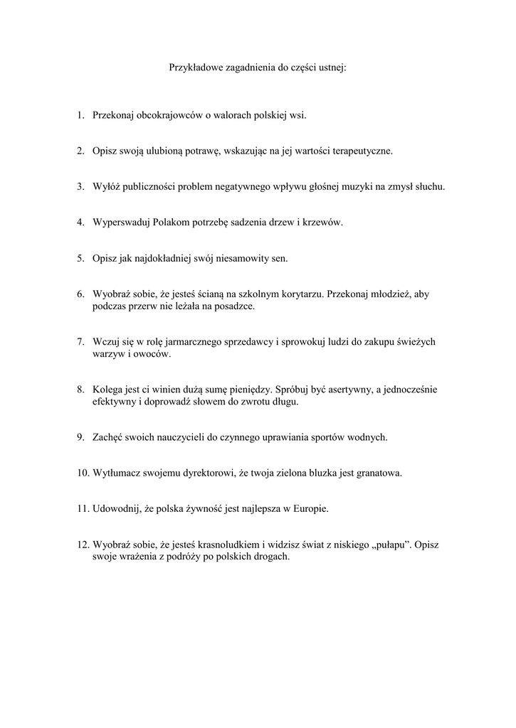 Przykładowe zagadnienia do części ustnej: 1. Przekonaj obcokrajowców o walorach polskiej wsi. 2. Opisz swoją ulubioną potrawę, wskazując na jej wartości terapeutyczne. 3. Wyłóż publiczności problem negatywnego wpływu głośnej muzyki na zmysł słuchu. 4. Wyperswaduj Polakom potrzebę sadzenia drzew i krzewów. 5. Opisz jak najdokładniej swój niesamowity sen. 6. Wyobraź sobie, że jesteś ścianą na szkolnym korytarzu. Przekonaj młodzież, aby podczas przerw nie leżała na posadzce. 7. Wczuj się w rolę jarmarcznego sprzedawcy i sprowokuj ludzi do zakupu świeżych warzyw i owoców. 8. Kolega jest ci winien dużą sumę pieniędzy. Spróbuj być asertywny, a jednocześnie efektywny i doprowadź słowem do zwrotu długu. 9. Zachęć swoich nauczycieli do czynnego uprawiania sportów wodnych. 10. Wytłumacz swojemu dyrektorowi, że twoja zielona bluzka jest granatowa. 11. Udowodnij, że polska żywność jest najlepsza w Europie. 12. Wyobraź sobie, że jesteś krasnoludkiem i widzisz świat z niskiego „pułapu”. Opisz swoje wrażenia z podróży po polskich drogach.