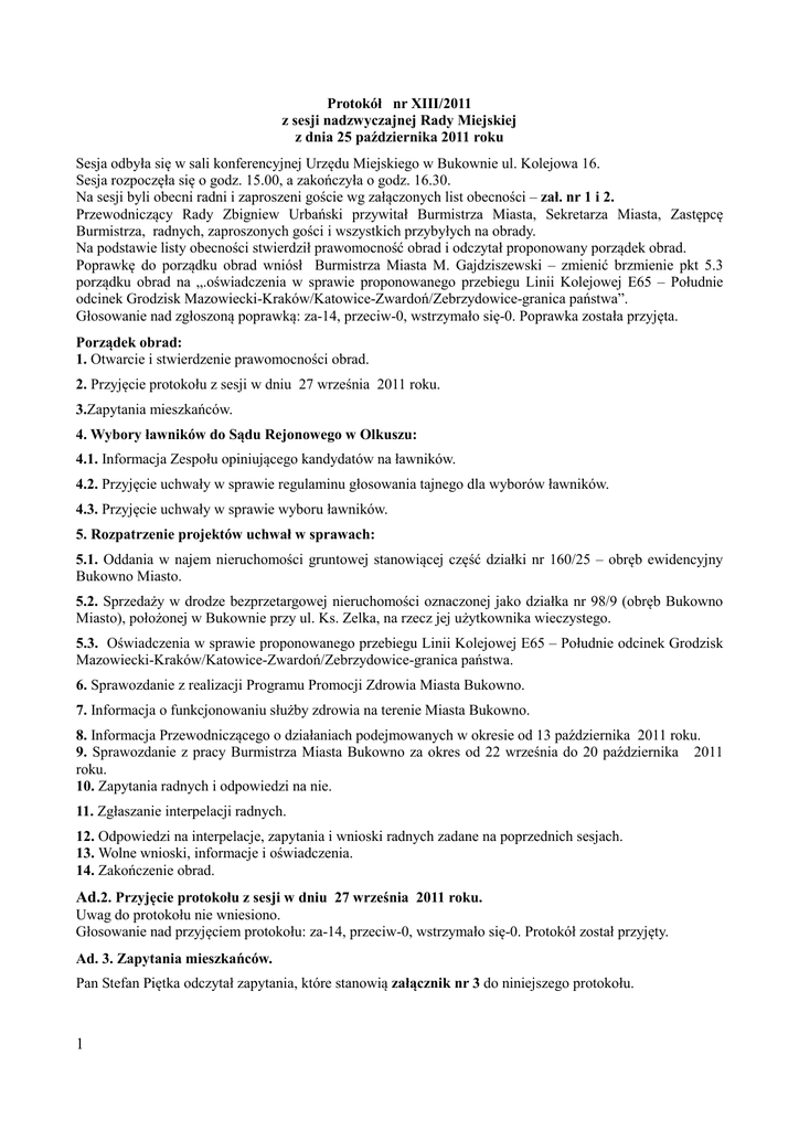 Protokół nr XIII/2011 z sesji nadzwyczajnej Rady Miejskiej z dnia 25 października 2011 roku Sesja odbyła się w sali konferencyjnej Urzędu Miejskiego w Bukownie ul. Kolejowa 16. Sesja rozpoczęła się o godz. 15.00, a zakończyła o godz. 16.30. Na sesji byli obecni radni i zaproszeni goście wg załączonych list obecności – zał. nr 1 i 2. Przewodniczący Rady Zbigniew Urbański przywitał Burmistrza Miasta, Sekretarza Miasta, Zastępcę Burmistrza, radnych, zaproszonych gości i wszystkich przybyłych na obrady. Na podstawie listy obecności stwierdził prawomocność obrad i odczytał proponowany porządek obrad. Poprawkę do porządku obrad wniósł Burmistrza Miasta M. Gajdziszewski – zmienić brzmienie pkt 5.3 porządku obrad na „.oświadczenia w sprawie proponowanego przebiegu Linii Kolejowej E65 – Południe odcinek Grodzisk Mazowiecki-Kraków/Katowice-Zwardoń/Zebrzydowice-granica państwa”. Głosowanie nad zgłoszoną poprawką: za-14, przeciw-0, wstrzymało się-0. Poprawka została przyjęta. Porządek obrad: 1. Otwarcie i stwierdzenie prawomocności obrad. 2. Przyjęcie protokołu z sesji w dniu 27 września 2011 roku. 3.Zapytania mieszkańców. 4. Wybory ławników do Sądu Rejonowego w Olkuszu: 4.1. Informacja Zespołu opiniującego kandydatów na ławników. 4.2. Przyjęcie uchwały w sprawie regulaminu głosowania tajnego dla wyborów ławników. 4.3. Przyjęcie uchwały w sprawie wyboru ławników. 5. Rozpatrzenie projektów uchwał w sprawach: 5.1. Oddania w najem nieruchomości gruntowej stanowiącej część działki nr 160/25 – obręb ewidencyjny Bukowno Miasto. 5.2. Sprzedaży w drodze bezprzetargowej nieruchomości oznaczonej jako działka nr 98/9 (obręb Bukowno Miasto), położonej w Bukownie przy ul. Ks. Zelka, na rzecz jej użytkownika wieczystego. 5.3. Oświadczenia w sprawie proponowanego przebiegu Linii Kolejowej E65 – Południe odcinek Grodzisk Mazowiecki-Kraków/Katowice-Zwardoń/Zebrzydowice-granica państwa. 6. Sprawozdanie z realizacji Programu Promocji Zdrowia Miasta Bukowno. 7. Informacja o funkcjonowaniu służby zdrowia na terenie Miasta Bukowno. 8. Informacja Przewodniczącego o działaniach podejmowanych w okresie od 13 października 2011 roku. 9. Sprawozdanie z pracy Burmistrza Miasta Bukowno za okres od 22 września do 20 października 2011 roku. 10. Zapytania radnych i odpowiedzi na nie. 11. Zgłaszanie interpelacji radnych. 12. Odpowiedzi na interpelacje, zapytania i wnioski radnych zadane na poprzednich sesjach. 13. Wolne wnioski, informacje i oświadczenia. 14. Zakończenie obrad. Ad.2. Przyjęcie protokołu z sesji w dniu 27 września 2011 roku. Uwag do protokołu nie wniesiono. Głosowanie nad przyjęciem protokołu: za-14, przeciw-0, wstrzymało się-0. Protokół został przyjęty. Ad. 3. Zapytania mieszkańców. Pan Stefan Piętka odczytał zapytania, które stanowią załącznik nr 3 do niniejszego protokołu. 1 Zastępca Burmistrz J. Paluch – pyt. 1 – wyjaśnił, że odcinek drogi od ul. Sławkowskiej do Ogranicznika w kierunku Podlipia będzie wyasfaltowany po ujęciu tego zadania w budżecie, dodał, że na części tego odcinku należy wykonać również podbudowę drogi. Jeżeli chodzi o szybką kolej to konsultacje społeczne nie są przewidywane, linia będzie przebiegać przez tereny Lasów Państwowych, Skarbu Państwa, gminy. Teraz opracowywane jest studium wykonalności. Pan S. Piętka – stwierdził, że odpowiedzi udzielone przez Pana Burmistrza nie są wystarczające i nie są merytoryczne, poprosił o udzielenie odpowiedzi na piśmie w trybie ustawy o dostępie do informacji publicznej z dnia 6 września 2001 roku, w terminie 14 dniowym. Natomiast przy konsultacjach własność terenu nie ma znaczenia, przeprowadza się je zgodnie z ustawą o konsultacjach społecznych i referendum, dodał, że droga w kierunku Podlipia powinna być wykonana ponieważ od kilku lat samochody nią już jeżdżą. Zastępca Burmistrza J. Paluch – powiedział, że udział społeczeństwa będzie zagwarantowany w momencie wydawania decyzji środowiskowych do realizacji inwestycji. Pan S. Piętka - powiedział, że nie wiedział, że na dzisiejszej sesji będzie podejmowane oświadczenie w sprawie szybkiej linii kolejowej, a zaproponowanie jej trasy po terenie byłej piaskowni jest najgorsze z możliwych. Burmistrz Miasta M. Gajdziszewski – stwierdził, że odpowiedzi na wszystkie pytania Pana Piętki będą udzielone na piśmie. Przewodniczący Rady Z. Urbański – odnosząc się do pytania dotyczącego degradacji Biura Rady wyjaśnił, że w strukturach i tak Biuro podlega pod Urząd Miasta. Dodał, że nikt z radnych jak na razie nie skarżył się na złe działanie Biura Rady i pracuje w nim Pani Majchrzak, a kierownikiem jest Pani Bargieł tak, że nadal są to 2 osoby. Na razie nie widzi złej pracy, nikt się nie skarżył. Tak praca wykonywana jest dopiero od lipca i należy dać sobie czas na ocenę pracy Biura. Pan S. Piętka – powiedział, że Przewodniczący nadaje tok pracy Biura i Rady i sam powinien dbać o powagę Rady i jej status odpowiedni. Organ stanowiący i kontrolny będzie obsługiwany jako swego rodzaju wyjątek w powiecie czy szerzej wśród innych gmin przez jedną tylko osobę. Przewodniczący Rady poprosił o zadawanie pytań. Pan S. Piętka – powiedział, że prawo ustosunkować się do odpowiedzi Pana Przewodniczącego, powiedział, że nie zgadza się z odpowiedzią Przewodniczącego, że nie jest to degradacja, ponieważ Biuro Rady nie jest podporządkowane nawet Panu Zastępcy Burmistrza czy Sekretarzowi tylko jednemu z kierowników to jest to degradacja. W razie wątpliwości to gdzie będzie można iść na skargę po drodze służbowej; najpierw do kierownika, później ewentualnie wyżej po szczeblach drabiny służbowej. To jest degradacja nie tylko Biura Rady Miejskiej, ale Rady Miejskie, poprosił o odpowiedź na piśmie. Ad.4. Wybory ławników do Sądu Rejonowego w