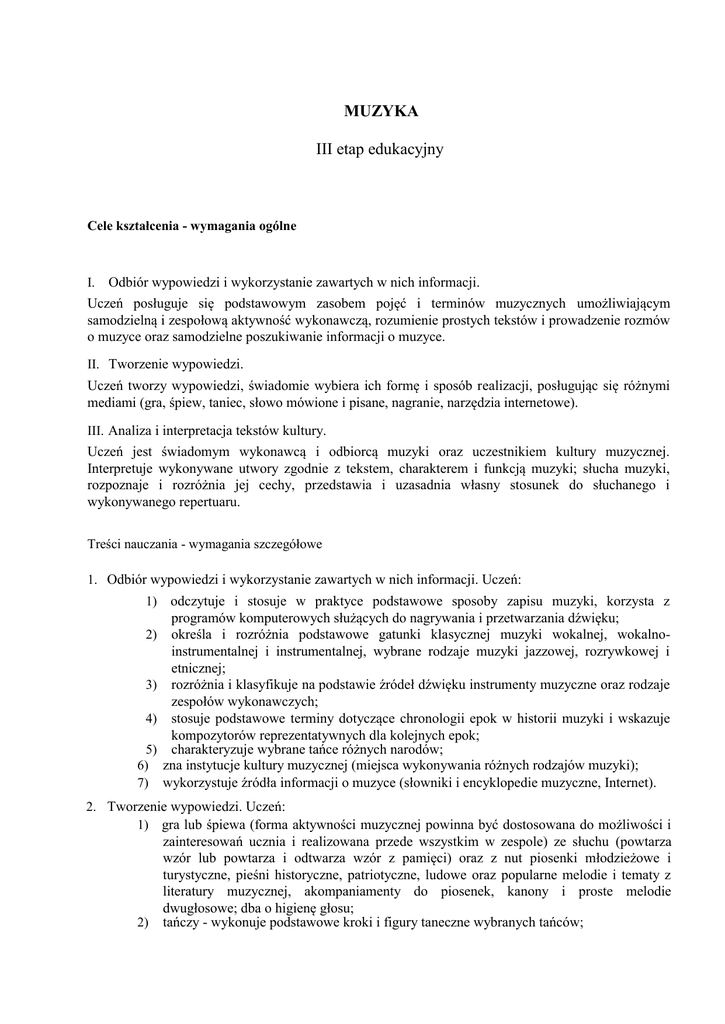 MUZYKA III etap edukacyjny Cele kształcenia - wymagania ogólne I. Odbiór wypowiedzi i wykorzystanie zawartych w nich informacji. Uczeń posługuje się podstawowym zasobem pojęć i terminów muzycznych umożliwiającym samodzielną i zespołową aktywność wykonawczą, rozumienie prostych tekstów i prowadzenie rozmów o muzyce oraz samodzielne poszukiwanie informacji o muzyce. II. Tworzenie wypowiedzi. Uczeń tworzy wypowiedzi, świadomie wybiera ich formę i sposób realizacji, posługując się różnymi mediami (gra, śpiew, taniec, słowo mówione i pisane, nagranie, narzędzia internetowe). III. Analiza i interpretacja tekstów kultury. Uczeń jest świadomym wykonawcą i odbiorcą muzyki oraz uczestnikiem kultury muzycznej. Interpretuje wykonywane utwory zgodnie z tekstem, charakterem i funkcją muzyki; słucha muzyki, rozpoznaje i rozróżnia jej cechy, przedstawia i uzasadnia własny stosunek do słuchanego i wykonywanego repertuaru. Treści nauczania - wymagania szczegółowe 1. Odbiór wypowiedzi i wykorzystanie zawartych w nich informacji. Uczeń: 1) 2) 3) 4) 5) 6) 7) odczytuje i stosuje w praktyce podstawowe sposoby zapisu muzyki, korzysta z programów komputerowych służących do nagrywania i przetwarzania dźwięku; określa i rozróżnia podstawowe gatunki klasycznej muzyki wokalnej, wokalnoinstrumentalnej i instrumentalnej, wybrane rodzaje muzyki jazzowej, rozrywkowej i etnicznej; rozróżnia i klasyfikuje na podstawie źródeł dźwięku instrumenty muzyczne oraz rodzaje zespołów wykonawczych; stosuje podstawowe terminy dotyczące chronologii epok w historii muzyki i wskazuje kompozytorów reprezentatywnych dla kolejnych epok; charakteryzuje wybrane tańce różnych narodów; zna instytucje kultury muzycznej (miejsca wykonywania różnych rodzajów muzyki); wykorzystuje źródła informacji o muzyce (słowniki i encyklopedie muzyczne, Internet). 2. Tworzenie wypowiedzi. Uczeń: 1) gra lub śpiewa (forma aktywności muzycznej powinna być dostosowana do możliwości i zainteresowań ucznia i realizowana przede wszystkim w zespole) ze słuchu (powtarza wzór lub powtarza i odtwarza wzór z pamięci) oraz z nut piosenki młodzieżowe i turystyczne, pieśni historyczne, patriotyczne, ludowe oraz popularne melodie i tematy z literatury muzycznej, akompaniamenty do piosenek, kanony i proste melodie dwugłosowe; dba o higienę głosu; 2) tańczy - wykonuje podstawowe kroki i figury taneczne wybranych tańców; 3) 4) tworzy wokalne i instrumentalne wypowiedzi dźwiękowe o różnych funkcjach (np. akompaniament instrumentalny do piosenek, ilustracje muzyczne do treści literackich i plastycznych, własne melodie), improwizuje (np. melodie do podanego tekstu samodzielnie lub pod kierunkiem nauczyciela, solowo lub w zespole); wypowiada się o muzyce - opisuje typowe cechy epok w dziejach muzyki i cechy słuchanych utworów, charakteryzuje estetykę utworu i jego wykonanie. 3. Analiza i interpretacja tekstów kultury. Uczeń: 1) świadomie odbiera muzykę - rozpoznaje cechy utworu muzycznego (rodzaje faktury muzycznej: jednogłosową i wielogłosową, wybrane formy muzyki wokalnej i instrumentalnej); 2) określa różnorodne funkcje muzyki użytkowej i artystycznej; 3) rozpoznaje w utworach rytmy polskich tańców narodowych oraz popularnych tańców towarzyskich; 4) rozpoznaje aparat wykonawczy muzyki wokalnej, instrumentalnej i wokalnoinstrumentalnej (orkiestra, zespół kameralny, solista, chór, rodzaje głosów żeńskich i męskich oraz instrumenty orkiestrowe); 5) ocenia i wartościuje muzykę oraz jej wykonanie, uzasadniając swoje poglądy, dostrzega wartość muzyki ludowej, wartościuje różne kierunki muzyki jazzowej i rozrywkowej młodzieżowej; 6) porządkuje chronologicznie epoki muzyczne, przyporządkowując im reprezentatywnych dla nich kompozytorów oraz utwory muzyczne wysłuchane i omówione na lekcjach;