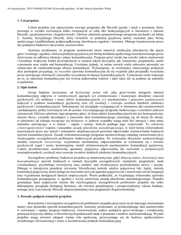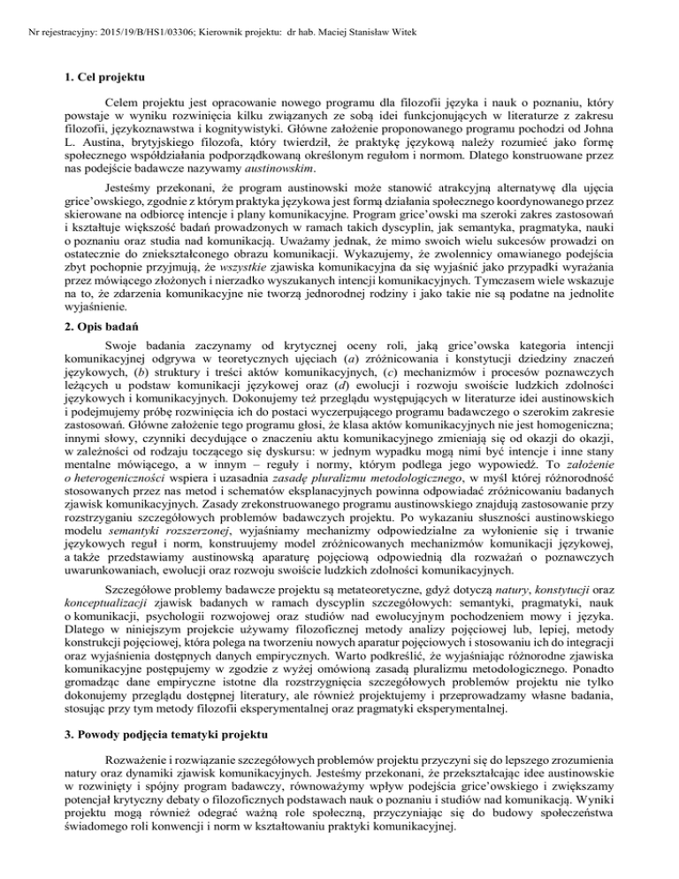 Nr rejestracyjny: 2015/19/B/HS1/03306; Kierownik projektu: dr hab. Maciej Stanisław Witek 1. Cel projektu Celem projektu jest opracowanie nowego programu dla filozofii języka i nauk o poznaniu, który powstaje w wyniku rozwinięcia kilku związanych ze sobą idei funkcjonujących w literaturze z zakresu filozofii, językoznawstwa i kognitywistyki. Główne założenie proponowanego programu pochodzi od Johna L. Austina, brytyjskiego filozofa, który twierdził, że praktykę językową należy rozumieć jako formę społecznego współdziałania podporządkowaną określonym regułom i normom. Dlatego konstruowane przez nas podejście badawcze nazywamy austinowskim. Jesteśmy przekonani, że program austinowski może stanowić atrakcyjną alternatywę dla ujęcia grice’owskiego, zgodnie z którym praktyka językowa jest formą działania społecznego koordynowanego przez skierowane na odbiorcę intencje i plany komunikacyjne. Program grice’owski ma szeroki zakres zastosowań i kształtuje większość badań prowadzonych w ramach takich dyscyplin, jak semantyka, pragmatyka, nauki o poznaniu oraz studia nad komunikacją. Uważamy jednak, że mimo swoich wielu sukcesów prowadzi on ostatecznie do zniekształconego obrazu komunikacji. Wykazujemy, że zwolennicy omawianego podejścia zbyt pochopnie przyjmują, że wszystkie zjawiska komunikacyjna da się wyjaśnić jako przypadki wyrażania przez mówiącego złożonych i nierzadko wyszukanych intencji komunikacyjnych. Tymczasem wiele wskazuje na to, że zdarzenia komunikacyjne nie tworzą jednorodnej rodziny i jako takie nie są podatne na jednolite wyjaśnienie. 2. Opis badań Swoje badania zaczynamy od krytycznej oceny roli, jaką grice’owska kategoria intencji komunikacyjnej odgrywa w teoretycznych ujęciach (a) zróżnicowania i konstytucji dziedziny znaczeń językowych, (b) struktury i treści aktów komunikacyjnych, (c) mechanizmów i procesów poznawczych leżących u podstaw komunikacji językowej oraz (d) ewolucji i rozwoju swoiście ludzkich zdolności językowych i komunikacyjnych. Dokonujemy też przeglądu występujących w literaturze idei austinowskich i podejmujemy próbę rozwinięcia ich do postaci wyczerpującego programu badawczego o szerokim zakresie zastosowań. Główne założenie tego programu głosi, że klasa aktów komunikacyjnych nie jest homogeniczna; innymi słowy, czynniki decydujące o znaczeniu aktu komunikacyjnego zmieniają się od okazji do okazji, w zależności od rodzaju toczącego się dyskursu: w jednym wypadku mogą nimi być intencje i inne stany mentalne mówiącego, a w innym – reguły i normy, którym podlega jego wypowiedź. To założenie o heterogeniczności wspiera i uzasadnia zasadę pluralizmu metodologicznego, w myśl której różnorodność stosowanych przez nas metod i schematów eksplanacyjnych powinna odpowiadać zróżnicowaniu badanych zjawisk komunikacyjnych. Zasady zrekonstruowanego programu austinowskiego znajdują zastosowanie przy rozstrzyganiu szczegółowych problemów badawczych projektu. Po wykazaniu słuszności austinowskiego modelu semantyki rozszerzonej, wyjaśniamy mechanizmy odpowiedzialne za wyłonienie się i trwanie językowych reguł i norm, konstruujemy model zróżnicowanych mechanizmów komunikacji językowej, a także przedstawiamy austinowską aparaturę pojęciową odpowiednią dla rozważań o poznawczych uwarunkowaniach, ewolucji oraz rozwoju swoiście ludzkich zdolności komunikacyjnych. Szczegółowe problemy badawcze projektu są metateoretyczne, gdyż dotyczą natury, konstytucji oraz konceptualizacji zjawisk badanych w ramach dyscyplin szczegółowych: semantyki, pragmatyki, nauk o komunikacji, psychologii rozwojowej oraz studiów nad ewolucyjnym pochodzeniem mowy i języka. Dlatego w niniejszym projekcie używamy filozoficznej metody analizy pojęciowej lub, lepiej, metody konstrukcji pojęciowej, która polega na tworzeniu nowych aparatur pojęciowych i stosowaniu ich do integracji oraz wyjaśnienia dostępnych danych empirycznych. Warto podkreślić, że wyjaśniając różnorodne zjawiska komunikacyjne postępujemy w zgodzie z wyżej omówioną zasadą pluralizmu metodologicznego. Ponadto gromadząc dane empiryczne istotne dla rozstrzygnięcia szczegółowych problemów projektu nie tylko dokonujemy przeglądu dostępnej literatury, ale również projektujemy i przeprowadzamy własne badania, stosując przy tym metody filozofii eksperymentalnej oraz pragmatyki eksperymentalnej. 3. Powody podjęcia tematyki projektu Rozważenie i rozwiązanie szczegółowych problemów projektu przyczyni się do lepszego zrozumienia natury oraz dynamiki zjawisk komunikacyjnych. Jesteśmy przekonani, że przekształcając idee austinowskie w rozwinięty i spójny program badawczy, równoważymy wpływ podejścia grice’owskiego i zwiększamy potencjał krytyczny debaty o filozoficznych podstawach nauk o poznaniu i studiów nad komunikacją. Wyniki projektu mogą również odegrać ważną role społeczną, przyczyniając się do budowy społeczeństwa świadomego roli konwencji i norm w kształtowaniu praktyki komunikacyjnej.