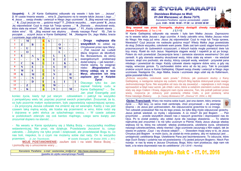 Uzupełnij: 1. „W Kanie Galilejskiej odbywało się wesele i była tam … Jezusa”. 2. W czasie trwania wesela … wina 3. „Zaproszono na to wesele także Jezusa i Jego …” 4. Jezus … swoją chwałę i uwierzyli w Niego Jego uczniowie”. 5. „Bóg wezwał nas przez …” 6. „Czyż jeszcze nie … godzina moja?” 7. „Zróbcie wszystko, … wam powie” 8. „Jezus Jej odpowiedział: Czyż to moja lub Twoja sprawa …” 9. „Starosta … skosztował wody, która stała się winem”. 10. „Stało zaś tam sześć stągwi …” 11. „Każdy człowiek stawia … dobre wino”. 12. „Bóg wezwał nas abyśmy … chwały naszego Pana” 13. „Taki to początek … uczynił Jezus w Kanie Galilejskiej”. 14. „Następnie On, Jego Matka, bracia i uczniowie Jego udali się do …”. 1 x x x x x - Droga najlepsza dla M K A x wszystkich to: oddać się 2 x x Z B A O x Chrystusowi przez ręce Maryi. 3 x x x U N W x – [Tak nauczał św. Ludwik 4 x x x O A Ł x Maria Grignion de Montfort]. 5 x E A G L Ę x Św. Bonawentura, do ośmiu 6 x x x N A E Z A ewangelicznych proklamacji dodał kolejną – i jak twierdził – 7 x C K L I K x równie ważną, by osiągnąć 8 x N E I S O x niebo: „Błogosławieni ci, 9 x x x W S L Y x którzy oddają się w ręce Maryi, albowiem ich imię 10 K M E N H x zapisane jest w Księdze 11 x x N J I W x Życia”. 12 x x 13 x Z K D S K A Ą W N I I Dlaczego tylko św. Jan zapisał historię cudu w 14 x M x Kanie Galilejskiej? -… Św. Jan pisał Ewangelię pod koniec życia, kiedy był już starym człowiekiem i patrzył na wszystko z perspektywy wielu lat, poprzez pryzmat swoich przemyśleń. Zrozumiał, że to, co było pozornie małym wydarzeniem, było zapowiedzią najważniejszej sprawy. – Za przyczyną Jezusa człowiek ma zmienić się od wewnątrz. Każdy z nas jest czasem taką mętną wodą, ale trzeba się przemienić w wino, które rodzi się i dojrzewa w pełni słońca ze szlachetnego owocu. – W czasie zabawy w podskokach zdarzyło się coś bardzo mądrego, czego sens święty Jan zrozumiał dopiero na starość. … x x x x - Na weselu w Kanie spotykamy się z Matką Bożą – nauczycielką modlitwy wstawienniczej. Nie prosi, nie dziękuje. Przedstawia Jezusowi to, czego zabrakło. – Żebyśmy nie tylko prosili i dziękowali, ale przedstawiali Bogu to, co nas boli, niepokoi, to z czym nie możemy sobie dać rady. On to wszystko przemieni. [x Jan Twardowski, W świetle Ewangelii, W drodze 2005, s 301]. MOJE POSTANOWIENIE: zaufam dziś i na wieki Matce Bożej … i pomodlę się o umocnienie wiary ... Kancelaria Parafialna e-mail : [email protected] http://www.stanislaw-bm.pl/ [gazetka do użytku wewnętrznego Parafii] . ‘ Stanisława Biskupa na Woli; 01-244 Warszawa; ul. Bema 73/75, Kancelaria Parafialna czynna: poniedziałek - piątek godz. 9:00 - 10:00; 16:00 - 17:30 ; tel. 22 632 38 00 Bóg wezwał nas przez Ewangelię, abyśmy dostąpili chwały naszego Pana, Jezusa Chrystusa. (2 Tes 2,14) J 2,1-12 W Kanie Galilejskiej odbywało się wesele i była tam Matka Jezusa. Zaproszono na to wesele także Jezusa i Jego uczniów. A kiedy zabrakło wina, Matka Jezusa mówi do Niego: Nie mają już wina. Jezus Jej odpowiedział: Czyż to moja lub Twoja sprawa, Niewiasto? Czyż jeszcze nie nadeszła godzina moja? Wtedy Matka Jego powiedziała do sług: Zróbcie wszystko, cokolwiek wam powie. Stało zaś tam sześć stągwi kamiennych przeznaczonych do żydowskich oczyszczeń, z których każda mogła pomieścić dwie lub trzy miary. Rzekł do nich Jezus: Napełnijcie stągwie wodą! I napełnili je aż po brzegi. Potem do nich powiedział: Zaczerpnijcie teraz i zanieście staroście weselnemu! Oni zaś zanieśli. A gdy starosta weselny skosztował wody, która stała się winem - nie wiedział bowiem, skąd ono pochodzi, ale słudzy, którzy czerpali wodę, wiedzieli - przywołał pana młodego i powiedział do niego: Każdy człowiek stawia najpierw dobre wino, a gdy się napiją, wówczas gorsze. Ty zachowałeś dobre wino aż do tej pory. Taki to początek znaków uczynił Jezus w Kanie Galilejskiej. Objawił swoją chwałę i uwierzyli w Niego Jego uczniowie. Następnie On, Jego Matka, bracia i uczniowie Jego udali się do Kafarnaum, gdzie pozostali kilka dni. „Zróbcie wszystko, cokolwiek wam powie.” Zróbcie, jak posłuszni słudzy z Kany Galilejskiej, a następnie radujcie się cudami, których Bóg będzie dokonywał przez swego Jednorodzonego Syna. Nie wszystkie od razu da się zauważyć – największe z nich mogą wprowadzić w błąd nasz wzrok, jak chleb i wino, które w ostatnim ziemskim cudzie Jezusa stały się Jego Ciałem i Krwią, dającymi nam życie wieczne. Ten, kto potrafi patrzeć przez wiarę, rozpozna je: zobaczy pod postacią chleba Ciało, a pod postacią wina Krew naszego Zbawcy . [o. Cezary Binkiewicz OP, „Oremus” 01. 2004, s. 69]. Ojciec Franciszek: Wiary nie można sobie kupić, jest ona darem, który zmienia życie … - Byli tacy, co serca mieli zamknięte, choć przyznawali – do pewnego stopnia – że Jezus jest uzdrowicielem. Ale odpuszczenie grzechów to co innego. Ten człowiek przesadza! Nie ma do tego prawa, bo tylko Bóg może odpuszczać grzechy. Jezus jednak wiedział, co myślą i odpowiada. A co mówi? Że jest Bogiem … Pan przychodzi … przede wszystkim zbawić nas z naszych grzechów i doprowadzić nas do Ojca. Po to został posłany, aby oddać życie dla naszego zbawienia. … To właśnie najtrudniej jest zrozumieć i to nie tylko uczonym w Piśmie. Kiedy Jezus ukazuje władzę większą niż ta, którą ma człowiek: władzę przebaczania, udzielania życia, odradzania naszego człowieczeństwa, wtedy również i Jego uczniowie zaczynają o Nim wątpić, tak że stawia im pytanie: „Czyż i wy chcecie odejść?... - Dowodem mojej wiary w to, że Jezus Chrystus jest Bogiem w moim życiu, że został do mnie posłany, aby mi wybaczyć jest … umiejętność 