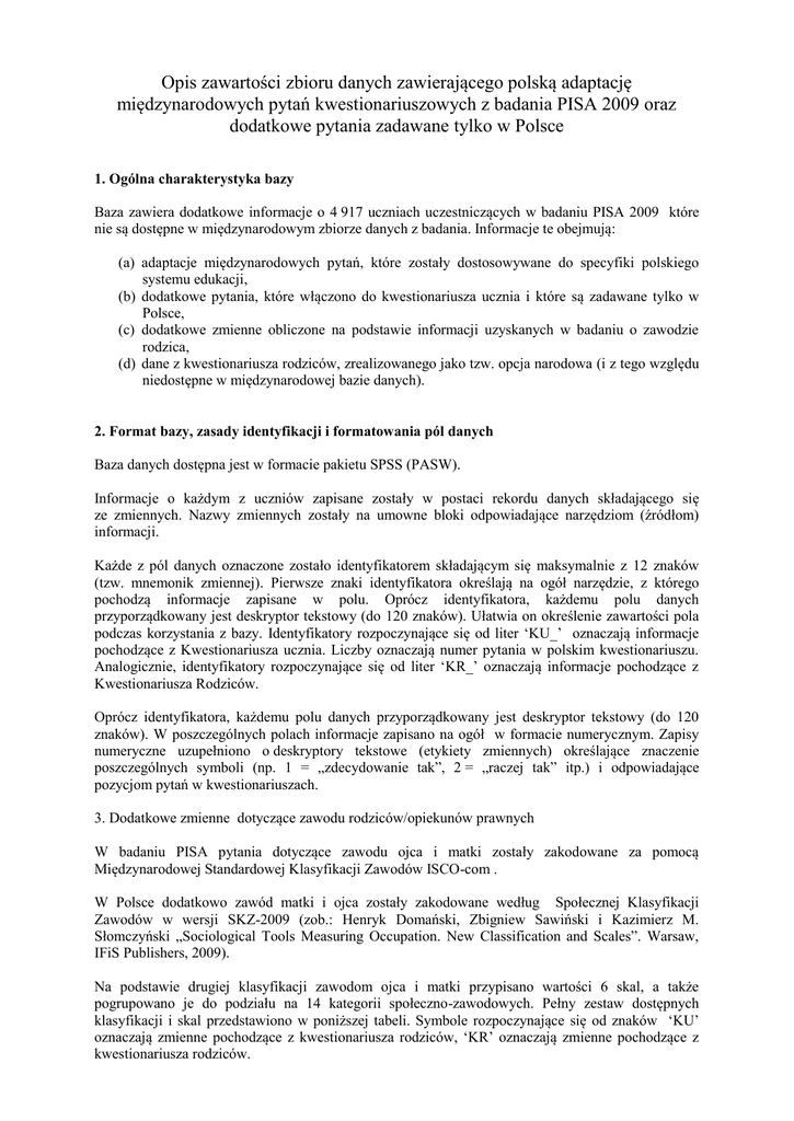 Opis zawartości zbioru danych zawierającego polską adaptację międzynarodowych pytań kwestionariuszowych z badania PISA 2009 oraz dodatkowe pytania zadawane tylko w Polsce 1. Ogólna charakterystyka bazy Baza zawiera dodatkowe informacje o 4 917 uczniach uczestniczących w badaniu PISA 2009 które nie są dostępne w międzynarodowym zbiorze danych z badania. Informacje te obejmują: (a) adaptacje międzynarodowych pytań, które zostały dostosowywane do specyfiki polskiego systemu edukacji, (b) dodatkowe pytania, które włączono do kwestionariusza ucznia i które są zadawane tylko w Polsce, (c) dodatkowe zmienne obliczone na podstawie informacji uzyskanych w badaniu o zawodzie rodzica, (d) dane z kwestionariusza rodziców, zrealizowanego jako tzw. opcja narodowa (i z tego względu niedostępne w międzynarodowej bazie danych). 2. Format bazy, zasady identyfikacji i formatowania pól danych Baza danych dostępna jest w formacie pakietu SPSS (PASW). Informacje o każdym z uczniów zapisane zostały w postaci rekordu danych składającego się ze zmiennych. Nazwy zmiennych zostały na umowne bloki odpowiadające narzędziom (źródłom) informacji. Każde z pól danych oznaczone zostało identyfikatorem składającym się maksymalnie z 12 znaków (tzw. mnemonik zmiennej). Pierwsze znaki identyfikatora określają na ogół narzędzie, z którego pochodzą informacje zapisane w polu. Oprócz identyfikatora, każdemu polu danych przyporządkowany jest deskryptor tekstowy (do 120 znaków). Ułatwia on określenie zawartości pola podczas korzystania z bazy. Identyfikatory rozpoczynające się od liter ‘KU_’ oznaczają informacje pochodzące z Kwestionariusza ucznia. Liczby oznaczają numer pytania w polskim kwestionariuszu. Analogicznie, identyfikatory rozpoczynające się od liter ‘KR_’ oznaczają informacje pochodzące z Kwestionariusza Rodziców. Oprócz identyfikatora, każdemu polu danych przyporządkowany jest deskryptor tekstowy (do 120 znaków). W poszczególnych polach informacje zapisano na ogół w formacie numerycznym. Zapisy numeryczne uzupełniono o deskryptory tekstowe (etykiety zmiennych) określające znaczenie poszczególnych symboli (np. 1 = „zdecydowanie tak”, 2 = „raczej tak” itp.) i odpowiadające pozycjom pytań w kwestionariuszach. 3. Dodatkowe zmienne dotyczące zawodu rodziców/opiekunów prawnych W badaniu PISA pytania dotyczące zawodu ojca i matki zostały zakodowane za pomocą Międzynarodowej Standardowej Klasyfikacji Zawodów ISCO-com . W Polsce dodatkowo zawód matki i ojca zostały zakodowane według Społecznej Klasyfikacji Zawodów w wersji SKZ-2009 (zob.: Henryk Domański, Zbigniew Sawiński i Kazimierz M. Słomczyński „Sociological Tools Measuring Occupation. New Classification and Scales”. Warsaw, IFiS Publishers, 2009). Na podstawie drugiej klasyfikacji zawodom ojca i matki przypisano wartości 6 skal, a także pogrupowano je do podziału na 14 kategorii społeczno-zawodowych. Pełny zestaw dostępnych klasyfikacji i skal przedstawiono w poniższej tabeli. Symbole rozpoczynające się od znaków ‘KU’ oznaczają zmienne pochodzące z kwestionariusza rodziców, ‘KR’ oznaczają zmienne pochodzące z kwestionariusza rodziców. 2 Symbole klasyfikacji dostępne są w polach oznaczonych KRZO_SKZ w wypadku zawodu ojca oraz KRZM_SKZ dla zawodu matki. Oprócz symboli klasyfikacyjnych, każdy zawód zrekodowano do podziału na 14 grup społeczno-zawodowych (pola KRZO_K14 oraz KRZM_K14), a także przypisano mu wartości podanych niżej 6 skal. Identyfikator Identyfikator w wypadku zawodu w wypadku zawodu ojca matki Nazwa klasyfikacji lub skali Dane z kwestionariusza ucznia Społeczna Klasyfikacja Zawodów SKZ-2009 KUZO_SKZ KUZM_SKZ podział na 14 kategorii społeczno-zawodowych KUZO_K14 KUZM_K14 skala wymogów kwalifikacyjnych KUZO_SRQ KUZM_SRQ skala złożoności pracy KUZO_CPX KUZM_CPX skala SES-1979 KUZO_S79 KUZM_S79 skala wynagrodzenia materialnego KUZO_MTR KUZM_MTR skala prestiżu 1979 KUZO_P79 KUZM_P79 skala prestiżu 2009 KUZO_PRS KUZM_PRS Skala wymogów kwalifikacyjnych KRZO_SRQ KRZM_SRQ Skala złożoności pracy KRZO_CPX KRZM_CPX Skala SES-1979 KRZO_S79 KRZM_S79 Skala wynagrodzenia materialnego KRZO_MTR KRZM_MTR Skala prestiżu 1979 KRZO_P79 KRZM_P79 Skala prestiżu 2009 KRZO_PRS KRZM_PRS Dane z kwestionariusza rodziców: Opis poszczególnych skal można znaleźć w podanym wyżej źródle. Ze względu na wymogi anonimizacji danych w bazie pominięto odpowiedzi rodziców na pytania o zawód w wersji tekstowej. Łączenie bazy z międzynarodową bazą zawierającą dane jednostkowe z badania PISA 2009 Baza jest uzupełnieniem międzynarodowego zbioru danych i zawiera zmienne umożliwiające połączenie danych dla Polski udostępnionych w międzynarodowej bazie danych dostępnymi na stronach OECD. Bazę można połączyć używając następujących identyfikatorów. Identyfikator cnt Deskryptor Country code 3-character country Country code ISO 3-digit Schoolid School ID 5-digit StIDStd Student ID 5-digit Opis Identyfikator kraju w międzynarodowej bazie danych PISA. Dla Polski przyjmuje wartość ‘POL’ Cyfrowy identyfikator kraju w międzynarodowej bazie danych PISA. Dla Polski przyjmuje wartość ‘616’ Identyfikator szkoły. Ciąg 5 cyfr oznaczających zanonimizowany symbol szkoły w międzynarodowej bazie danych z badania PISA 2009. Identyfikator ucznia. Ciąg 5 cyfr oznaczających zanonimizowany symbol ucznia w międzynarodowej bazie danych z badania PISA 2009