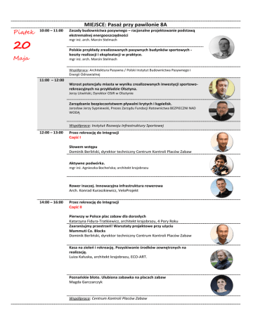 MIEJSCE: Pasaż przy pawilonie 8A Piątek 10:00 – 11:00 20 Zasady budownictwa pasywnego – racjonalne projektowanie podstawą ekstremalnej energooszczędności mgr inż. arch. Marcin Stelmach Polskie przykłady zrealizowanych pasywnych budynków sportowych koszty realizacji i eksploatacji w praktyce. Maja mgr inż. arch. Marcin Stelmach Współpraca: Architektura Pasywna / Polski Instytut Budownictwa Pasywnego i Energii Odnawialnej 11:00 – 12:00 Wzrost potencjału miasta w wyniku zrealizowanych inwestycji sportoworekreacyjnych na przykładzie Olsztyna. Jerzy Litwiński, Dyrektor OSiR w Olsztynie Zarządzanie bezpieczeństwem pływalni krytych i kąpielisk. Jarosław Jerzy Sypniewski, Prezes Zarządu Fundacji Ratownictwa BEZPIECZNI NAD WODĄ Współpraca: Instytut Rozwoju Infrastruktury Sportowej 12:00 – 13:00 Przez rekreację do Integracji Część I Słowem wstępu Dominik Berliński, dyrektor techniczny Centrum Kontroli Placów Zabaw Aktywne podwórka. mgr inż. Agnieszka Bocheńska; architekt krajobrazu Rower inaczej. Innowacyjna infrastruktura rowerowa Arch. Konrad Kuraszkiewicz, VeloProjekt 14:00 – 16:00 Przez rekreację do Integracji Część II Pierwszy w Polsce plac zabaw dla dorosłych Katarzyna Fidura-Tratkiewicz, architekt krajobrazu, 4 Pory Roku Zaaranżujmy przestrzeń! Warsztaty projektowe przy użyciu Mammuti Co. Blocks Dominik Berliński, dyrektor techniczny Centrum Kontroli Placów Zabaw Kasa na zieleń i rekreację. Pozyskiwanie środków zewnętrznych na realizację. Luiza Kałuska, architekt krajobrazu, ECO-ART. Poznańskie błoto. Ulubiona zabawka na placach zabaw Magda Garczarczyk Współpraca: Centrum Kontroli Placów Zabaw Sobota 10:30 – 12:00 21 Zasady głębokiej termomodernizacji na przykładzie budynku edukacyjnohotelowego zrealizowanego w Miękini pod Krakowem - faktor 1:10 mgr inż. arch. Marcin Stelmach Polskie przykłady zrealizowanych pasywnych budynków sportowych koszty realizacji i eksploatacji w praktyce. mgr inż. arch. Marcin Stelmach maja Pasywne budynki o funkcji sanatoryjno-hotelowej na przykładzie inwestycji ZOL w Krakowie. mgr inż. arch. Marcin Stelmach Współpraca: Architektura Pasywna / Pasywnego i Energii Odnawialnej 12:00-13:00 Polski Instytut Budownictwa Innowacyjny system uzdatniania wody basenowej, który generuje duże oszczędności. Atrakcje basenowe (zjeżdżalnie, minibaseny i in.) jako forma wzbogacania oferty obiektów – nowości. 13:00-14:30 Współpraca: Basenprof Bezpieczeństwo obiektów sportowych i rekreacyjnych Współpraca: Wydział Prewencji Komendy Wojewódzkiej Policji