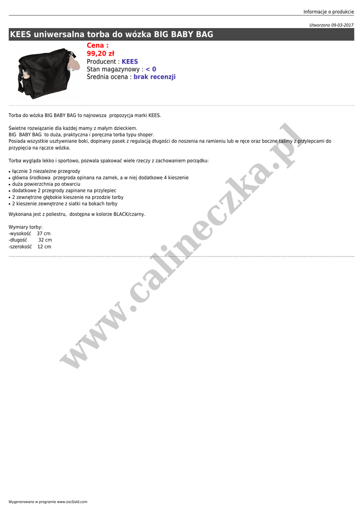 Informacje o produkcie Utworzono 09-03-2017 KEES uniwersalna torba do wózka BIG BABY BAG Cena : 99,20 zł Producent : KEES Stan magazynowy : < 0 Średnia ocena : brak recenzji Torba do wózka BIG BABY BAG to najnowsza propozycja marki KEES. ● ● ● ● ● łącznie 3 niezależne przegrody główna środkowa przegroda opinana na zamek, a w niej dodatkowe 4 kieszenie duża powierzchnia po otwarciu dodatkowe 2 przegrody zapinane na przylepiec 2 zewnętrzne głębokie kieszenie na przodzie torby 2 kieszenie zewnętrzne z siatki na bokach torby Wykonana jest z poliestru, dostępna w kolorze BLACK/czarny. w w w .c al in Wymiary torby: -wysokość 37 cm -długość 32 cm -szerokość 12 cm ec ● Wygenerowano w programie www.oscGold.com zk a. Torba wygląda lekko i sportowo, pozwala spakować wiele rzeczy z zachowaniem porządku: pl Świetne rozwiązanie dla każdej mamy z małym dzieckiem. BIG BABY BAG to duża, praktyczna i poręczna torba typu shoper. Posiada wszystkie usztywniane boki, dopinany pasek z regulacją długości do noszenia na ramieniu lub w ręce oraz boczne taśmy z przylepcami do przypięcia na rączce wózka.
