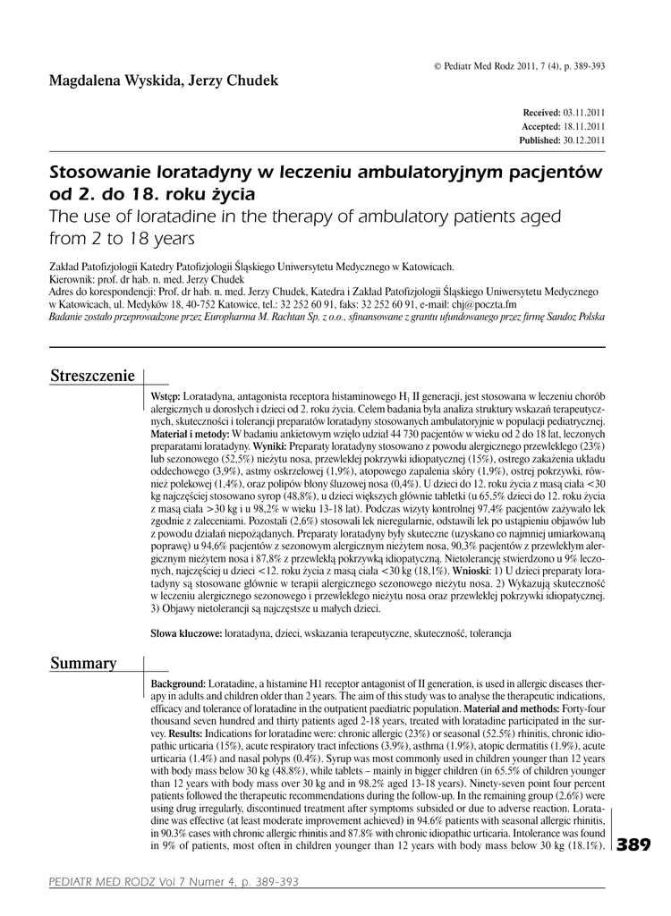 Magdalena Wyskida, Jerzy Chudek © Pediatr Med Rodz 2011, 7 (4), p. 389-393 Received: 03.11.2011 Accepted: 18.11.2011 Published: 30.12.2011 Stosowanie loratadyny w leczeniu ambulatoryjnym pacjentów od 2. do 18. roku życia The use of loratadine in the therapy of ambulatory patients aged from 2 to 18 years Zakład Patofizjologii Katedry Patofizjologii Śląskiego Uniwersytetu Medycznego w Katowicach. Kierownik: prof. dr hab. n. med. Jerzy Chudek Adres do korespondencji: Prof. dr hab. n. med. Jerzy Chudek, Katedra i Zakład Patofizjologii Śląskiego Uniwersytetu Medycznego w Katowicach, ul. Medyków 18, 40-752 Katowice, tel.: 32 252 60 91, faks: 32 252 60 91, e-mail: [email protected] Badanie zostało przeprowadzone przez Europharma M. Rachtan Sp. z o.o., sfinansowane z grantu ufundowanego przez firmę Sandoz Polska Streszczenie Wstęp: Loratadyna, antagonista receptora histaminowego H1 II generacji, jest stosowana w leczeniu chorób alergicznych u dorosłych i dzieci od 2. roku życia. Celem badania była analiza struktury wskazań terapeutycznych, skuteczności i tolerancji preparatów loratadyny stosowanych ambulatoryjnie w populacji pediatrycznej. Materiał i metody: W badaniu ankietowym wzięło udział 44 730 pacjentów w wieku od 2 do 18 lat, leczonych preparatami loratadyny. Wyniki: Preparaty loratadyny stosowano z powodu alergicznego przewlekłego (23%) lub sezonowego (52,5%) nieżytu nosa, przewlekłej pokrzywki idiopatycznej (15%), ostrego zakażenia układu oddechowego (3,9%), astmy oskrzelowej (1,9%), atopowego zapalenia skóry (1,9%), ostrej pokrzywki, również polekowej (1,4%), oraz polipów błony śluzowej nosa (0,4%). U dzieci do 12. roku życia z masą ciała <30 kg najczęściej stosowano syrop (48,8%), u dzieci większych głównie tabletki (u 65,5% dzieci do 12. roku życia z masą ciała >30 kg i u 98,2% w wieku 13-18 lat). Podczas wizyty kontrolnej 97,4% pacjentów zażywało lek zgodnie z zaleceniami. Pozostali (2,6%) stosowali lek nieregularnie, odstawili lek po ustąpieniu objawów lub z powodu działań niepożądanych. Preparaty loratadyny były skuteczne (uzyskano co najmniej umiarkowaną poprawę) u 94,6% pacjentów z sezonowym alergicznym nieżytem nosa, 90,3% pacjentów z przewlekłym alergicznym nieżytem nosa i 87,8% z przewlekłą pokrzywką idiopatyczną. Nietolerancję stwierdzono u 9% leczonych, najczęściej u dzieci <12. roku życia z masą ciała <30 kg (18,1%). Wnioski: 1) U dzieci preparaty loratadyny są stosowane głównie w terapii alergicznego sezonowego nieżytu nosa. 2) Wykazują skuteczność w leczeniu alergicznego sezonowego i przewlekłego nieżytu nosa oraz przewlekłej pokrzywki idiopatycznej. 3) Objawy nietolerancji są najczęstsze u małych dzieci. Słowa kluczowe: loratadyna, dzieci, wskazania terapeutyczne, skuteczność, tolerancja Summary Background: Loratadine, a histamine H1 receptor antagonist of II generation, is used in allergic diseases therapy in adults and children older than 2 years. The aim of this study was to analyse the therapeutic indications, efficacy and tolerance of loratadine in the outpatient paediatric population. Material and methods: Forty-four thousand seven hundred and thirty patients aged 2-18 years, treated with loratadine participated in the survey. Results: Indications for loratadine were: chronic allergic (23%) or seasonal (52.5%) rhinitis, chronic idiopathic urticaria (15%), acute respiratory tract infections (3.9%), asthma (1.9%), atopic dermatitis (1.9%), acute urticaria (1.4%) and nasal polyps (0.4%). Syrup was most commonly used in children younger than 12 years with body mass below 30 kg (48.8%), while tablets – mainly in bigger children (in 65.5% of children younger than 12 years with body mass over 30 kg and in 98.2% aged 13-18 years). Ninety-seven point four percent patients followed the therapeutic recommendations during the follow-up. In the remaining group (2.6%) were using drug irregularly, discontinued treatment after symptoms subsided or due to adverse reaction. Loratadine was effective (at least moderate improvement achieved) in 94.6% patients with seasonal allergic rhinitis, in 90.3% cases with chronic allergic rhinitis and 87.8% with chronic idiopathic urticaria. Intolerance was found in 9% of patients, most often in children younger than 12 years with body mass below 30 kg (18.1%). Pediatr Med rodz Vol 7 Numer 4, p. 389-393 389 prace oryginalne i poglądowe/Original contributions Conclusions: 1) Loratadine is mainly used in children for therapy of seasonal allergic rhinitis. 2) It is effective in seasonal and chronic allergic rhinitis and chronic idiopathic urticaria therapy. 3) The symptoms of intolerance are most common in young children. Key words: loratadine, children, therapeutic indications, efficacy, tolerance WSTĘP L oratadyna jest selektywnym antagonistą obwodowego receptora histaminowego H1 II generacji. W przeciwieństwie do I generacji leków antyhistaminowych nie wykazuje działania uspokajającego i jest pozbawiona działania antycholinolitycznego i przeciwserotoninowego(1,2). Wchłania się dobrze z przewodu pokarmowego, nie przenika do ośrodkowego układu nerwowego, jest metabolizowana przez wątrobę, a produkty przemiany, również aktywne farmakologicznie, są wydalane przez nerki(1,3,4). Lek może być stosowany raz na dobę, ponieważ jego czas połowiczej eliminacji wynosi 8-11 godzin, a czynnych metabolitów – 17-24 godzin(1). Preparaty loratadyny stosowane u dzieci nie powodują zaburzeń rytmu serca i przewodnictwa oraz nie upośledzają procesu uczenia się(5,6). Przeprowadzone badania kliniczne dowiodły skuteczności loratadyny w leczeniu alergicznego sezonowego(5,7) i przewlekłego nieżytu nosa u dzieci powyżej 2. roku życia(8). Skuteczność preparatów loratadyny w leczeniu przewlekłej pokrzywki idiopatycznej w populacji pediatrycznej nie została dotychczas poparta wynikami randomizowanych badań klinicznych. W porównaniu z innymi lek