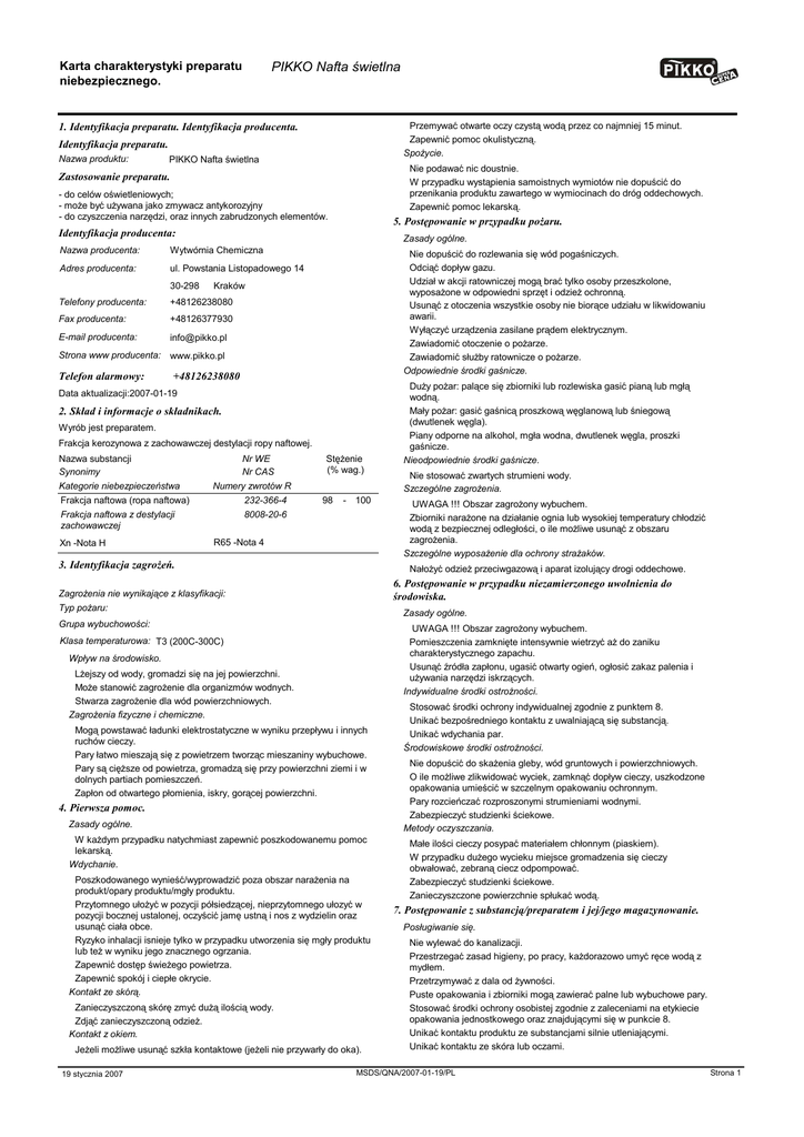 PIKKO Nafta świetlna Karta charakterystyki preparatu niebezpiecznego. Przemywać otwarte oczy czystą wodą przez co najmniej 15 minut. Zapewnić pomoc okulistyczną. SpoŜycie. 1. Identyfikacja preparatu. Identyfikacja producenta. Identyfikacja preparatu. Nazwa produktu: PIKKO Nafta świetlna Nie podawać nic doustnie. W przypadku wystąpienia samoistnych wymiotów nie dopuścić do przenikania produktu zawartego w wymiocinach do dróg oddechowych. Zapewnić pomoc lekarską. Zastosowanie preparatu. - do celów oświetleniowych; - moŜe być uŜywana jako zmywacz antykorozyjny - do czyszczenia narzędzi, oraz innych zabrudzonych elementów. 5. Postępowanie w przypadku poŜaru. Identyfikacja producenta: Zasady ogólne. Nazwa producenta: Wytwórnia Chemiczna Adres producenta: ul. Powstania Listopadowego 14 30-298 Nie dopuścić do rozlewania się wód pogaśniczych. Odciąć dopływ gazu. Udział w akcji ratowniczej mogą brać tylko osoby przeszkolone, wyposaŜone w odpowiedni sprzęt i odzieŜ ochronną. Usunąć z otoczenia wszystkie osoby nie biorące udziału w likwidowaniu awarii. Wyłączyć urządzenia zasilane prądem elektrycznym. Zawiadomić otoczenie o poŜarze. Zawiadomić słuŜby ratownicze o poŜarze. Odpowiednie środki gaśnicze. Kraków Telefony producenta: +48126238080 Fax producenta: +48126377930 E-mail producenta: [email protected] Strona www producenta: www.pikko.pl Telefon alarmowy: +48126238080 Data aktualizacji:2007-01-19 2. Skład i informacje o składnikach. Wyrób jest preparatem. Frakcja kerozynowa z zachowawczej destylacji ropy naftowej. Nr WE Nr CAS Nazwa substancji Synonimy Kategorie niebezpieczeństwa Frakcja naftowa (ropa naftowa) Numery zwrotów R 232-366-4 98 - 100 8008-20-6 Frakcja naftowa z destylacji zachowawczej Xn -Nota H StęŜenie (% wag.) R65 -Nota 4 3. Identyfikacja zagroŜeń. Nie stosować zwartych strumieni wody. Szczególne zagroŜenia. UWAGA !!! Obszar zagroŜony wybuchem. Zbiorniki naraŜone na działanie ognia lub wysokiej temperatury chłodzić wodą z bezpiecznej odległości, o ile moŜliwe usunąć z obszaru zagroŜenia. Szczególne wyposaŜenie dla ochrony straŜaków. NałoŜyć odzieŜ przeciwgazową i aparat izolujący drogi oddechowe. 6. Postępowanie w przypadku niezamierzonego uwolnienia do środowiska. ZagroŜenia nie wynikające z klasyfikacji: Typ poŜaru: Zasady ogólne. Grupa wybuchowości: UWAGA !!! Obszar zagroŜony wybuchem. Pomieszczenia zamknięte intensywnie wietrzyć aŜ do zaniku charakterystycznego zapachu. Usunąć źródła zapłonu, ugasić otwarty ogień, ogłosić zakaz palenia i uŜywania narzędzi iskrzących. Indywidualne środki ostroŜności. Klasa temperaturowa: T3 (200C-300C) Wpływ na środowisko. LŜejszy od wody, gromadzi się na jej powierzchni. MoŜe stanowić zagroŜenie dla organizmów wodnych. Stwarza zagroŜenie dla wód powierzchniowych. ZagroŜenia fizyczne i chemiczne. Mogą powstawać ładunki elektrostatyczne w wyniku przepływu i innych ruchów cieczy. Pary łatwo mieszają się z powietrzem tworząc mieszaniny wybuchowe. Pary są cięŜsze od powietrza, gromadzą się przy powierzchni ziemi i w dolnych partiach pomieszczeń. Zapłon od otwartego płomienia, iskry, gorącej powierzchni. 4. Pierwsza pomoc. Zasady ogólne. W kaŜdym przypadku natychmiast zapewnić poszkodowanemu pomoc lekarską. Wdychanie. Poszkodowanego wynieść/wyprowadzić poza obszar naraŜenia na produkt/opary produktu/mgły produktu. Przytomnego ułoŜyć w pozycji półsiedzącej, nieprzytomnego ułozyć w pozycji bocznej ustalonej, oczyścić jamę ustną i nos z wydzielin oraz usunąć ciała obce. Ryzyko inhalacji isnieje tylko w przypadku utworzenia się mgły produktu lub teŜ w wyniku jego znacznego ogrzania. Zapewnić dostęp świeŜego powietrza. Zapewnić spokój i ciepłe okrycie. Kontakt ze skórą. Zanieczyszczoną skórę zmyć duŜą ilością wody. Zdjąć zanieczyszczoną odzieŜ. Kontakt z okiem. JeŜeli moŜliwe usunąć szkła kontaktowe (jeŜeli nie przywarły do oka). 19 stycznia 2007 DuŜy poŜar: palące się zbiorniki lub rozlewiska gasić pianą lub mgłą wodną. Mały poŜar: gasić gaśnicą proszkową węglanową lub śniegową (dwutlenek węgla). Piany odporne na alkohol, mgła wodna, dwutlenek węgla, proszki gaśnicze. Nieodpowiednie środki gaśnicze. Stosować środki ochrony indywidualnej zgodnie z punktem 8. Unikać bezpośredniego kontaktu z uwalniającą się substancją. Unikać wdychania par. Środowiskowe środki ostroŜności. Nie dopuścić do skaŜenia gleby, wód gruntowych i powierzchniowych. O ile moŜliwe zlikwidować wyciek, zamknąć dopływ cieczy, uszkodzone opakowania umieścić w szczelnym opakowaniu ochronnym. Pary rozcieńczać rozproszonymi strumieniami wodnymi. Zabezpieczyć studzienki ściekowe. Metody oczyszczania. Małe ilości cieczy posypać materiałem chłonnym (piaskiem). W przypadku duŜego wycieku miejsce gromadzenia się cieczy obwałować, zebraną ciecz odpompować. Zabezpieczyć studzienki ściekowe. Zanieczyszczone powierzchnie spłukać wodą. 7. Postępowanie z substancją/preparatem i jej/jego magazynowanie. Posługiwanie się. Nie wylewać do kanalizacji. Przestrzegać zasad higieny, po pracy, kaŜdorazowo umyć ręce wodą z mydłem. Przetrzymywać z dala od Ŝywności. Puste opakowania i zbiorniki mogą zawierać palne lub wybuchowe pary. Stosować środki ochrony osobistej zgodnie z zaleceniami na etykiecie opakowania jednostkowego oraz znajdującymi się w punkcie 8. Unikać kontaktu produktu ze substancjami silnie utleniającymi. Unikać kontaktu ze skóra lub oczami. MSDS/QNA/2007-01-19/PL Strona 1 Karta charakterystyki preparatu niebezpiecznego. PIKKO Nafta świetlna Unikać rozlewania lub rozchlapywania produktu na rozgrzane lub znajdujące się pod napięciem części maszyn. UŜywać pojemników, połączeń i sprzętu odpornego na działanie produktu. UŜywać tylko urządzenia w wykonaniu przeciwwybuchowym, o odpowiednim zab