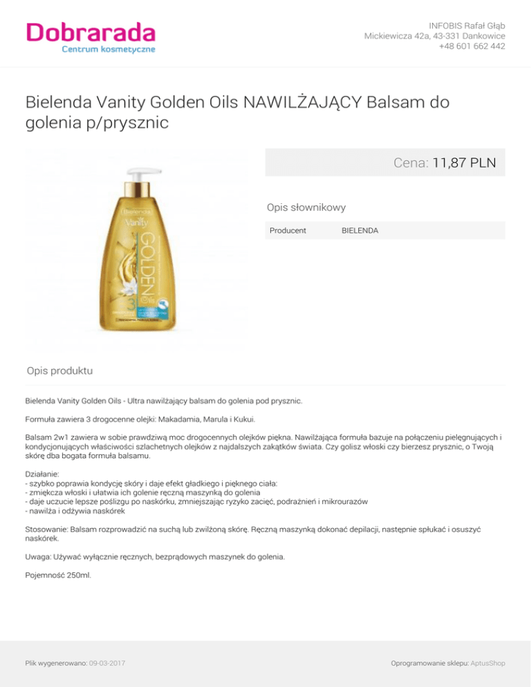 INFOBIS Rafał Głąb Mickiewicza 42a, 43-331 Dankowice +48 601 662 442 Bielenda Vanity Golden Oils NAWILŻAJĄCY Balsam do golenia p/prysznic Cena: 11,87 PLN Opis słownikowy Producent BIELENDA Opis produktu Bielenda Vanity Golden Oils - Ultra nawilżający balsam do golenia pod prysznic. Formuła zawiera 3 drogocenne olejki: Makadamia, Marula i Kukui. Balsam 2w1 zawiera w sobie prawdziwą moc drogocennych olejków piękna. Nawilżająca formuła bazuje na połączeniu pielęgnujących i kondycjonujących właściwości szlachetnych olejków z najdalszych zakątków świata. Czy golisz włoski czy bierzesz prysznic, o Twoją skórę dba bogata formuła balsamu. Działanie: - szybko poprawia kondycję skóry i daje efekt gładkiego i pięknego ciała: - zmiękcza włoski i ułatwia ich golenie ręczną maszynką do golenia - daje uczucie lepsze poślizgu po naskórku, zmniejszając ryzyko zacięć, podrażnień i mikrourazów - nawilża i odżywia naskórek Stosowanie: Balsam rozprowadzić na suchą lub zwilżoną skórę. Ręczną maszynką dokonać depilacji, następnie spłukać i osuszyć naskórek. Uwaga: Używać wyłącznie ręcznych, bezprądowych maszynek do golenia. Pojemność 250ml. Plik wygenerowano: 09-03-2017 Oprogramowanie sklepu: AptusShop INFOBIS Rafał Głąb Mickiewicza 42a, 43-331 Dankowice +48 601 662 442 Galeria Plik wygenerowano: 09-03-2017 Powered by TCPDF (www.tcpdf.org) Oprogramowanie sklepu: AptusShop
