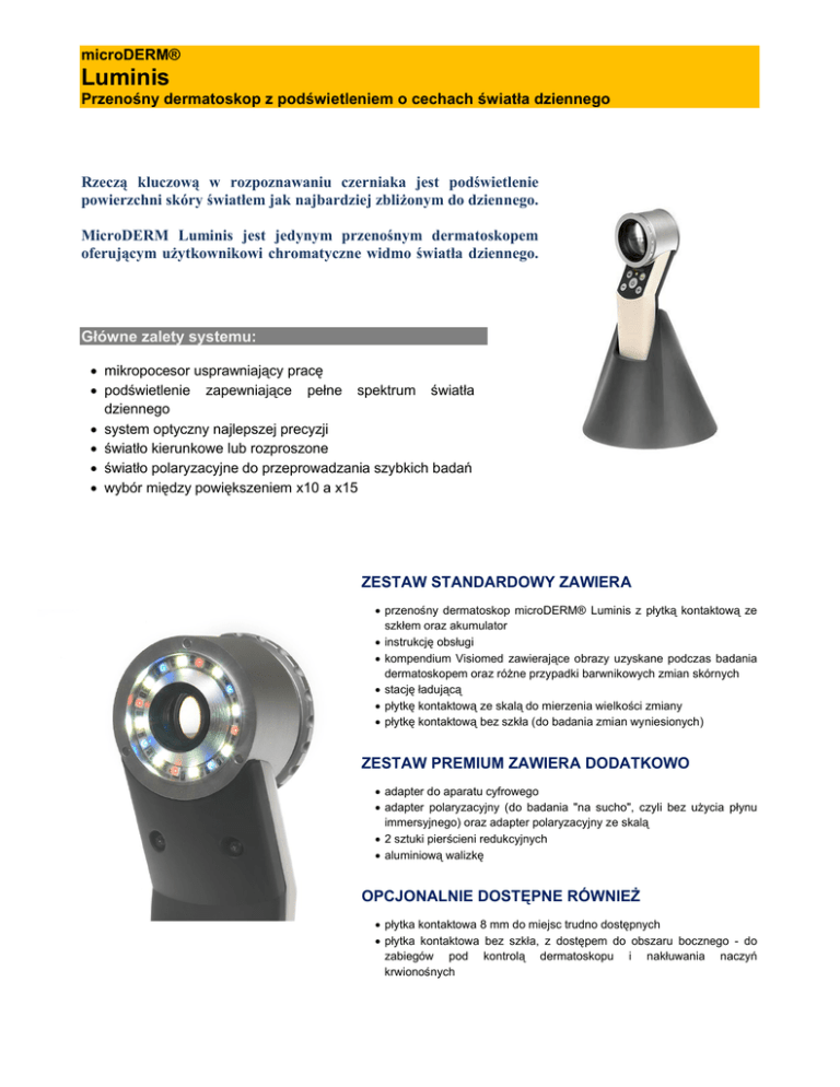 microDERM® Luminis Przenośny dermatoskop z podświetleniem o cechach światła dziennego Rzeczą kluczową w rozpoznawaniu czerniaka jest podświetlenie powierzchni skóry światłem jak najbardziej zbliżonym do dziennego. MicroDERM Luminis jest jedynym przenośnym dermatoskopem oferującym użytkownikowi chromatyczne widmo światła dziennego. Główne zalety systemu: mikropocesor usprawniający pracę podświetlenie zapewniające pełne spektrum światła dziennego system optyczny najlepszej precyzji światło kierunkowe lub rozproszone światło polaryzacyjne do przeprowadzania szybkich badań wybór między powiększeniem x10 a x15 ZESTAW STANDARDOWY ZAWIERA przenośny dermatoskop microDERM® Luminis z płytką kontaktową ze szkłem oraz akumulator instrukcję obsługi kompendium Visiomed zawierające obrazy uzyskane podczas badania dermatoskopem oraz różne przypadki barwnikowych zmian skórnych stację ładującą płytkę kontaktową ze skalą do mierzenia wielkości zmiany płytkę kontaktową bez szkła (do badania zmian wyniesionych) ZESTAW PREMIUM ZAWIERA DODATKOWO adapter do aparatu cyfrowego adapter polaryzacyjny (do badania "na sucho", czyli bez użycia płynu immersyjnego) oraz adapter polaryzacyjny ze skalą 2 sztuki pierścieni redukcyjnych aluminiową walizkę OPCJONALNIE DOSTĘPNE RÓWNIEŻ płytka kontaktowa 8 mm do miejsc trudno dostępnych płytka kontaktowa bez szkła, z dostępem do obszaru bocznego - do zabiegów pod kontrolą dermatoskopu i nakłuwania naczyń krwionośnych microDERM® Luminis nowoczesne urządzenie do profesjonalnego badania skóry Badania w pełnym spektrum światła dziennego Zróżnicowane rodzaje światła w urządzeniu micro-DERM Luminis sterowane są przez mikroprocesor i zapewniają ukazanie barwy prawie tak jak w świetle dziennym. Wysoce precyzyjny system optyczny i podświetlenie kierunkowe Duże powiększenie zapewnia doskonałą widoczność wszystkich szczegółów bez zniekształceń krawędziowych. Wciśnięcie przycisku światła kierunkowego znakomicie uwydatnia wszystkie cechy struktury powierzchni skóry. Filtr polaryzacyjny Skorzystanie z filtra polaryzacyjnego umożliwia przeprowadzenie badania skóry bez refleksów i bez potrzeby używania płynów immersyjnych. Korekcja dioptrażu Ostrość obrazu można łatwo i dokładnie wyregulować za pomocą pokrętła okularu. Odległość komfortowa dla pacjenta Bez bezpośredniego kontaktu okularu ze skórą, w odległości komfortowej dla pacjenta, każdy szczegół jest ostro widoczny nawet z odległości 20 cm. Ergonomiczny kształt… …urządzenia microDERM Luminis zapewnia wygodne używanie go przy pomocy jednej dłoni i operowanie wbudowanymi na płycie tylnej przyciskami sterującymi. Adaptery Praktyczny zamek magnetyczny pozwala z adapterów w ciągu zaledwie kilku sekund. na zmianę każdego Stała jakość podświetlenia Specjalny mikropocesor zapewnia stałą jakość podświetlenia, nawet przy wyczerpującym się akumulatorze. Ustawienia indywidualne Wszystkie indywidualne ustawienia użytkownika są łatwo programowalne i są automatycznie przywoływane przy następnym włączeniu dermatoskopu. Podświetlenie zgodne z normami Każde urządzenie microDERM Luminis zostało skalibrowane tak, aby spełniać najwyższe standardy jakości i pracować zgodnie z najsurowszymi normami. BECHTOLD & CO ul. Liściasta 17 91-357 Łódź [email protected] tel. 48 42 616 53 61 fax. 48 42 616 55 61 tel. kom. 501 546 461 www.bechtold.pl