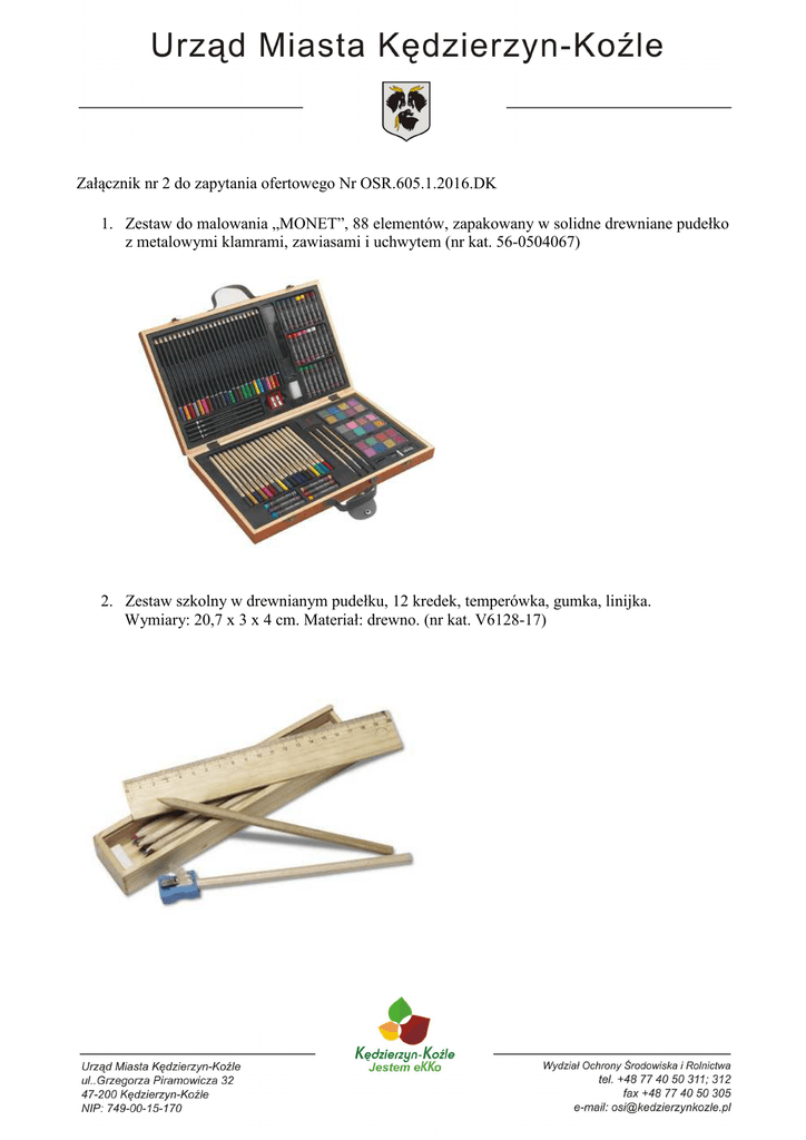 Załącznik nr 2 do zapytania ofertowego Nr OSR.605.1.2016.DK 1. Zestaw do malowania „MONET”, 88 elementów, zapakowany w solidne drewniane pudełko z metalowymi klamrami, zawiasami i uchwytem (nr kat. 56-0504067) 2. Zestaw szkolny w drewnianym pudełku, 12 kredek, temperówka, gumka, linijka. Wymiary: 20,7 x 3 x 4 cm. Materiał: drewno. (nr kat. V6128-17)