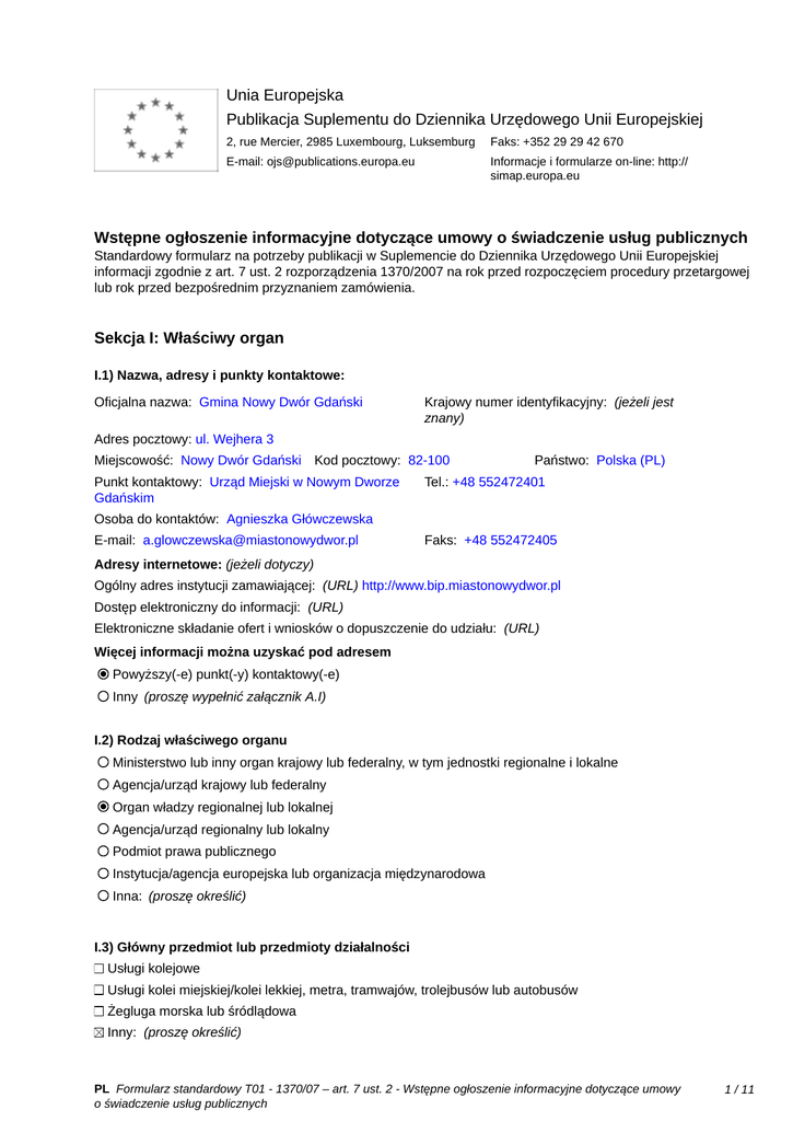 Unia Europejska Publikacja Suplementu do Dziennika Urzędowego Unii Europejskiej 2, rue Mercier, 2985 Luxembourg, Luksemburg Faks: +352 29 29 42 670 E-mail: [email protected] Informacje i formularze on-line: http:// simap.europa.eu Wstępne ogłoszenie informacyjne dotyczące umowy o świadczenie usług publicznych Standardowy formularz na potrzeby publikacji w Suplemencie do Dziennika Urzędowego Unii Europejskiej informacji zgodnie z art. 7 ust. 2 rozporządzenia 1370/2007 na rok przed rozpoczęciem procedury przetargowej lub rok przed bezpośrednim przyznaniem zamówienia. Sekcja I: Właściwy organ I.1) Nazwa, adresy i punkty kontaktowe: Oficjalna nazwa: Gmina Nowy Dwór Gdański Krajowy numer identyfikacyjny: (jeżeli jest znany) _____ Adres pocztowy: ul. Wejhera 3 Miejscowość: Nowy Dwór Gdański Kod pocztowy: 82-100 Punkt kontaktowy: Urząd Miejski w Nowym Dworze Gdańskim Państwo: Polska (PL) Tel.: +48 552472401 Osoba do kontaktów: Agnieszka Główczewska E-mail: [email protected] Faks: +48 552472405 Adresy internetowe: (jeżeli dotyczy) Ogólny adres instytucji zamawiającej: (URL) http://www.bip.miastonowydwor.pl Dostęp elektroniczny do informacji: (URL) _____ Elektroniczne składanie ofert i wniosków o dopuszczenie do udziału: (URL) _____ Więcej informacji można uzyskać pod adresem Powyższy(-e) punkt(-y) kontaktowy(-e) Inny (proszę wypełnić załącznik A.I) I.2) Rodzaj właściwego organu Ministerstwo lub inny organ krajowy lub federalny, w tym jednostki regionalne i lokalne Agencja/urząd krajowy lub federalny Organ władzy regionalnej lub lokalnej Agencja/urząd regionalny lub lokalny Podmiot prawa publicznego Instytucja/agencja europejska lub organizacja międzynarodowa Inna: (proszę określić) I.3) Główny przedmiot lub przedmioty działalności Usługi kolejowe Usługi kolei miejskiej/kolei lekkiej, metra, tramwajów, trolejbusów lub autobusów Żegluga morska lub śródlądowa Inny: (proszę określić) PL Formularz standardowy T01 - 1370/07 – art. 7 ust. 2 - Wstępne ogłoszenie informacyjne dotyczące umowy o świadczenie usług publicznych 1 / 11 ogólne usługi publiczne I.4) Udzielenie zamówienia w imieniu innych właściwych organów Właściwy organ dokonuje zakupu w imieniu innych właściwych organów: tak nie (jeżeli tak, więcej informacji o tych właściwych organach można podać w załączniku A.II) PL Formularz standardowy T01 - 1370/07 – art. 7 ust. 2 - Wstępne ogłoszenie informacyjne dotyczące umowy o świadczenie usług publicznych 2 / 11 Sekcja II: Przedmiot zamówienia II.1) Opis: II.1.1) Nazwa nadana zamówieniu: Wybór operatora publicznego transportu zbiorowego na obszarze Gminy Nowy Dwór Gdański II.1.2) Rodzaj zamówienia, dziedzina(-y), której(-ych) dotyczą usługi transportu publicznego: Kategoria usług: nr: T-05 (Zob. kategorie usług w załączniku B) Dziedziny, których dotyczą usługi transportu publicznego: Gmina Nowy Dwór Gdański Kod NUTS: PL634 II.1.3) Krótki opis zamówienia: Dokonanie wyboru operatora publicznego transportu zbiorowego w trybie bezpośredniego zawarcia umowy o świadczenie usług w zakresie publicznego transportu zbiorowego zgodnie z art. 22 ust. 1 pkt 1 ustawy z dnia 16 grudnia 2010 r. o publicznym transporcie zbiorowym (t.j. Dz. U. z 2011 r. nr 5, poz.13) II.1.4) Wspólny Słownik Zamówień (CPV) Główny przedmiot Słownik główny 60112000 Słownik uzupełniający (jeżeli dotyczy) II.1.5) Informacje na temat podwykonawstwa Przewidywane jest zlecenie podwykonawstwa: tak nie (jeżeli tak) Wartość lub część zamówienia, które prawdopodobnie będzie zlecone stronom trzecim: minimalny procent: _____ (%), maksymalny procent: _____ (%) wartości zamówienia albo Nieznana Krótki opis wartości/części zamówienia, które będzie zlecone podwykonawcom: _____ II.2) Ilość i/lub wartość usług Opis: _____ km usług publicznych w zakresie transportu pasażerskiego: _____ Szacunkowy koszt bez VAT: (proszę podać wyłącznie dane liczbowe) _____ albo Zakres: między _____ i _____ Waluta: Waluta: II.3) Planowana data rozpoczęcia i czas trwania zamówienia lub termin realizacji Rozpoczęcie: 01/01/2017 (dd/mm/rrrr) Okres w miesiącach: 24 albo w dniach: _____ (od udzielenia zamówienia) PL Formularz standardowy T01 - 1370/07 – art. 7 ust. 2 - Wstępne ogłoszenie informacyjne dotyczące umowy o świadczenie usług publicznych 3 / 11 Sekcja III: Informacje o charakterze prawnym, ekonomicznym, finansowym i technicznym III.1) Warunki dotyczące zamówienia: III.1.1) Parametry kosztów w celu obliczenia rekompensaty: _____ III.1.2) Informacje o wyłącznych prawach: Przyznano wyłączne prawa tak nie (jeżeli tak) Wyszczególnienie przyznanych wyłącznych praw: _____ III.1.3) Podział przychodów ze sprzedaży biletów: Odsetek przydzielony podmiotowi świadczącemu usługi publiczne: _____ (%) (uznaje się, że pozostała część jest przyznawana właściwemu organowi) III.1.4) Standardy socjalne: (przejęcie personelu zgodnie z dyrektywą 2001/23/WE) Wykaz wymaganych standardów (w tym lista pracowników, których to dotyczy, szczegółowe informacje na temat umownych praw i zobowiązań pracowników oraz warunków, na jakich pracowników uznaje się za związanych ze świadczonymi usługami): _____ III.1.5) Zobowiązania do świadczenia usług publicznych: Wyszczególnienie: _____ III.1.6) Inne szczególne warunki: Wykonanie zamówienia podlega szczególnym warunkom (jeżeli tak) Opis szczególnych warunków: _____ tak nie III.2) Warunki udziału: III.2.1) Zdolność ekonomiczna i finansowa: Informacje i formalności konieczne do dokonania oceny Minimalny poziom ewentualnie wymaganych spełniania wymogów: standardów: _____ _____ III.2.2) Wymagania techniczne: Informacje i formalności konieczne do dokonania oceny Minimalny poziom ewentualnie wymaganych spełniania wymogów: standardów: _____ _____ III.3) Cele w zakresie jakości dla umów o usługi: Opis: _____ Informacje i bi