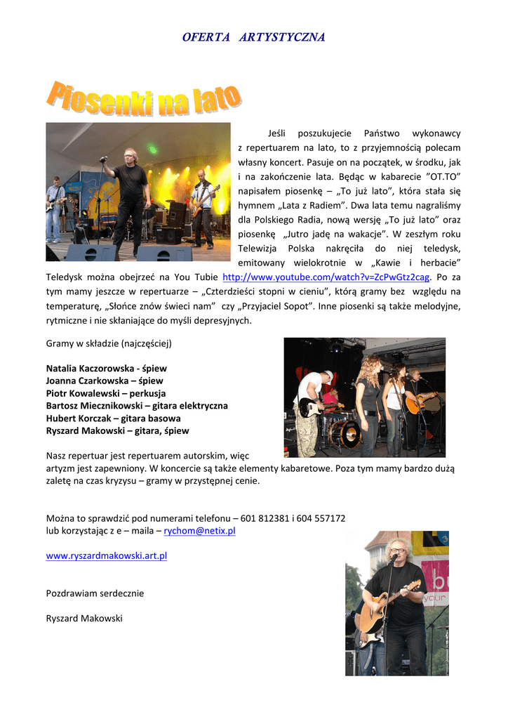 OFERTA ARTYSTYCZNA Jeśli poszukujecie Państwo wykonawcy z repertuarem na lato, to z przyjemnością polecam własny koncert. Pasuje on na początek, w środku, jak i na zakończenie lata. Będąc w kabarecie ”OT.TO” napisałem piosenkę – „To już lato”, która stała się hymnem „Lata z Radiem”. Dwa lata temu nagraliśmy dla Polskiego Radia, nową wersję „To już lato” oraz piosenkę „Jutro jadę na wakacje”. W zeszłym roku Telewizja Polska nakręciła do niej teledysk, emitowany wielokrotnie w „Kawie i herbacie” Teledysk można obejrzeć na You Tubie http://www.youtube.com/watch?v=ZcPwGtz2cag. Po za tym mamy jeszcze w repertuarze – „Czterdzieści stopni w cieniu”, którą gramy bez względu na temperaturę, „Słońce znów świeci nam” czy „Przyjaciel Sopot”. Inne piosenki są także melodyjne, rytmiczne i nie skłaniające do myśli depresyjnych. Gramy w składzie (najczęściej) Natalia Kaczorowska - śpiew Joanna Czarkowska – śpiew Piotr Kowalewski – perkusja Bartosz Miecznikowski – gitara elektryczna Hubert Korczak – gitara basowa Ryszard Makowski – gitara, śpiew Nasz repertuar jest repertuarem autorskim, więc artyzm jest zapewniony. W koncercie są także elementy kabaretowe. Poza tym mamy bardzo dużą zaletę na czas kryzysu – gramy w przystępnej cenie. Można to sprawdzić pod numerami telefonu – 601 812381 i 604 557172 lub korzystając z e – maila – [email protected] www.ryszardmakowski.art.pl Pozdrawiam serdecznie Ryszard Makowski