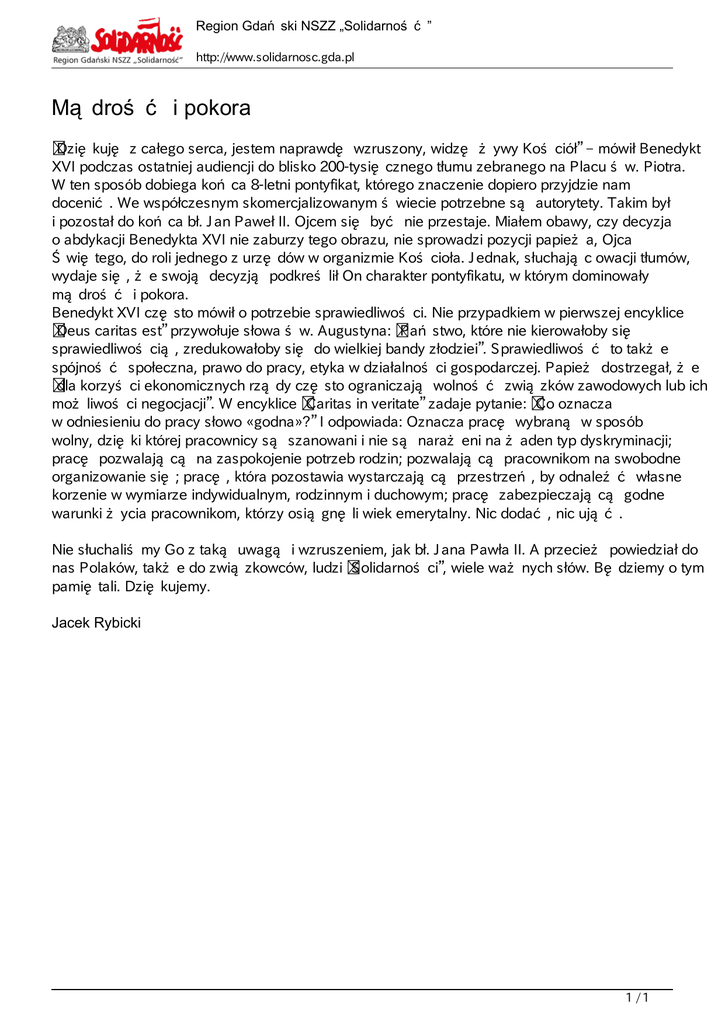 Region Gda ski NSZZ „Solidarno http://www.solidarnosc.gda.pl M dro i pokora „Dzi kuj z całego serca, jestem naprawd wzruszony, widz ywy Ko ciół ‒ mówił Benedykt XVI podczas ostatniej audiencji do blisko 200-tysi cznego tłumu zebranego na Placu w. Piotra. W ten sposób dobiega ko ca 8-letni pontyfikat, którego znaczenie dopiero przyjdzie nam doceni . We współczesnym skomercjalizowanym wiecie potrzebne s autorytety. Takim był i pozostał do ko ca bł. Jan Paweł II. Ojcem si by nie przestaje. Miałem obawy, czy decyzja o abdykacji Benedykta XVI nie zaburzy tego obrazu, nie sprowadzi pozycji papie a, Ojca wi tego, do roli jednego z urz dów w organizmie Ko cioła. Jednak, słuchaj c owacji tłumów, wydaje si , e swoj decyzj podkre lił On charakter pontyfikatu, w którym dominowały m dro i pokora. Benedykt XVI cz sto mówił o potrzebie sprawiedliwo ci. Nie przypadkiem w pierwszej encyklice „Deus caritas est przywołuje słowa w. Augustyna: „Pa stwo, które nie kierowałoby si sprawiedliwo ci , zredukowałoby si do wielkiej bandy złodziei . Sprawiedliwo to tak e spójno społeczna, prawo do pracy, etyka w działalno ci gospodarczej. Papie dostrzegał, e „dla korzy ci ekonomicznych rz dy cz sto ograniczaj wolno zwi zków zawodowych lub ich mo liwo ci negocjacji . W encyklice „Caritas in veritate zadaje pytanie: „Co oznacza w odniesieniu do pracy słowo «godna»? I odpowiada: Oznacza prac wybran w sposób wolny, dzi ki której pracownicy s szanowani i nie s nara eni na aden typ dyskryminacji; prac pozwalaj c na zaspokojenie potrzeb rodzin; pozwalaj c pracownikom na swobodne organizowanie si ; prac , która pozostawia wystarczaj c przestrze , by odnale własne korzenie w wymiarze indywidualnym, rodzinnym i duchowym; prac zabezpieczaj c godne warunki ycia pracownikom, którzy osi gn li wiek emerytalny. Nic doda , nic uj . Nie słuchali my Go z tak uwag i wzruszeniem, jak bł. Jana Pawła II. A przecie powiedział do nas Polaków, tak e do zwi zkowców, ludzi „Solidarno ci , wiele wa nych słów. B dziemy o tym pami tali. Dzi kujemy. Jacek Rybicki 1/1 Powered by TCPDF (www.tcpdf.org)