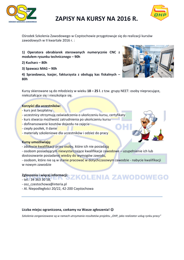 ZAPISY NA KURSY NA 2016 R. Ośrodek Szkolenia Zawodowego w Częstochowie przygotowuje się do realizacji kursów zawodowych w II kwartale 2016 r. : 1) Operatora obrabiarek sterowanych numerycznie CNC z modułem rysunku technicznego – 90h 2) Kucharz – 80h 3) Spawacz MAG – 90h 4) Sprzedawca, kasjer, fakturzysta z obsługą kas fiskalnych – 80h Kursy skierowane są do młodzieży w wieku 18 – 25 l. z tzw. grupy NEET: osoby niepracujące, niekształcące się i nieszkolące się. Korzyści dla uczestników: - kurs jest bezpłatny - uczestnicy otrzymują zaświadczenia o ukończeniu kursu, certyfikaty - kurs stwarza możliwość zatrudnienia po ukończeniu kursu - dofinansowanie kosztów dojazdu na zajęcia - ciepły posiłek, II danie - materiały szkoleniowe dla uczestników i odzież do pracy Kursy umożliwiają: - zdobycie kwalifikacji przez osoby, które ich nie posiadają - osobom posiadającym niewystarczające kwalifikacje zawodowe – uzupełnienie ich lub dostosowanie posiadanej wiedzy do wymogów zawodu, - osobom, które nie są w stanie pracować w dotychczasowym zawodzie - nabycie kwalifikacji w nowym zawodzie Zgłoszenia i więcej informacji: - tel.: 34 363 30 58, - [email protected] - Al. Niepodległości 20/22, 42-200 Częstochowa Liczba miejsc ograniczona, czekamy na Wasze zgłoszenia! Szkolenia zorganizowane są w ramach utrzymania rezultatów projektu „OHP, jako realizator usług rynku pracy”