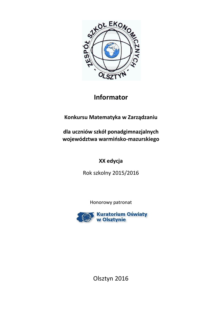 Informator Konkursu Matematyka w Zarządzaniu dla uczniów szkół ponadgimnazjalnych województwa warmińsko-mazurskiego XX edycja Rok szkolny 2015/2016 Honorowy patronat Olsztyn 2016 Wojewódzka Komisja Konkursowa: Przewodniczący: Stefan Procyk Zastępca przewodniczącego: Marcin Zajączkowski Członkowie: Beata Fanselau, Kamil Kopówka, Anna Kowalczyk, Leszek Życzko. Komitet naukowy: Przewodniczący: Leszek Życzko Członkowie: Beata Fanselau, Kamil Kopówka Komitet organizacyjny: Przewodniczący: Marcin Zajączkowski Członkowie: Beata Fanselau, Kamil Kopówka, Anna Kowalczyk, Leszek Życzko. XX EDYCJA KONKURSU MATEMATYKA W ZARZĄDZANIU dla uczniów szkół ponadgimnazjalnych województwa warmińsko-mazurskiego TERMINARZ KONKURSU do 26.02.2016 r. - przeprowadzenie eliminacji wewnątrzszkolnych do 4.03.2016 r. - rejestracja drużyn na stronie internetowej Zespołu Szkół Ekonomicznych /www.ekonomik.olsztyn.pl zakładka Matematyka w Zarządzaniu/ do 9.03.2016 r. - wysłanie potwierdzeń przyjęcia zgłoszenia /w przypadku nieotrzymania potwierdzenia, prosimy o kontakt telefoniczny lub pocztą elektroniczną/ 31.03.2016 r. godz. 10.00 – konkurs w Zespole Szkół Ekonomicznych w Olsztynie /organizator prosi o przybycie pół godziny przed rozpoczęciem konkursu/ 11.04.2016 r. – oficjalne ogłoszenie wyników konkursu na stronie internetowej organizatora www.ekonomik.olsztyn.pl zakładka Matematyka w Zarządzaniu Nagrody i dyplomy dla zwycięskich zespołów zostaną wysłane pocztą na adres szkoły podany w zgłoszeniu do konkursu. Każda szkoła biorąca udział w konkursie proszona jest o wpłacenie do dnia 18 marca 2016 r. składki na koszty organizacyjne konkursu w wysokości 10 zł za każdego ucznia z delegowanej drużyny na konto: Rada Rodziców w Zespole Szkół Ekonomicznych im. M. Kopernika w Olsztynie 10-144 Olsztyn, ul. Bałtycka 37 45885700024016080872610001 z dopiskiem „Matematyka w Zarządzaniu” Kontakt: Zespół Szkół Ekonomicznych w Olsztynie im. M. Kopernika w Olsztynie ul. Bałtycka 37, 10-144 Olsztyn, tel.(89)527-37-58, [email protected] Regulamin konkursu Matematyka w Zarządzaniu dla uczniów szkół ponadgimnazjalnych województwa warmińsko - mazurskiego § 1 Postanowienia ogólne 1. Podstawowe obowiązki organizatora i uczestników konkursu wynikają z niniejszego regulaminu. 2. Siedzibą konkursu jest Zespół Szkół Ekonomicznych im. Mikołaja Kopernika w Olsztynie ul. Bałtycka 37, 10-144 Olsztyn. § 2 Cele i zakres konkursu 1. Celem konkursu jest: a) rozwijanie zainteresowań i motywowanie uczniów do uczenia się matematyki, b) wspieranie uzdolnień matematycznych uczniów, c) promowanie uczniów posiadających ponadprzeciętną wiedzę i z stosowania zdolności matematyczne, d) dostarczenie młodzieży satysfakcji umiejętności wiedzy matematycznej w praktyce, e) matematyzowanie postaw i zachowań intelektualnych funkcjonujących poza aktywnością matematyczną, f) rozwijanie umiejętności kierowniczych uczniów, zwłaszcza dotyczących planowania, organizowania, kontrolowania oraz wykorzystywania matematyki w rozwiązywaniu określonych sytuacji problemowych, g) popularyzowanie zastosowań matematyki w różnych aspektach życia społecznego. 2. Zakres materiału konkursowego obejmuje w całości podstawę programową matematyki dla liceum i technikum - zakres podstawowy i rozszerzony oraz zagadnienia wymienione w programie konkursu stanowiącego załącznik do niniejszego regulaminu. 3. Konkurs adresowany jest do uczniów szkół ponadgimnazjalnych. 4. Konkurs ma zasięg wojewódzki i odbywa się w dwóch etapach: etap I – etap szkolny; etap II – etap wojewódzki. § 3 Organizator konkursu 1. Konkurs „Matematyka w Zarządzaniu” organizuje dyrektor Zespołu Szkół Ekonomicznych im. Mikołaja Kopernika w Olsztynie. 2. Patronat nad konkursem sprawuje Warmińsko – Mazurski Kurator Oświaty. 3. Organizację etapu szkolnego powierza się Szkolnej Komisji Konkursowej powołanej przez dyrektora szkoły. Za organizację etapu szkolnego konkursu odpowiada Dyrektor Szkoły. 4. Konkurs w etapie wojewódzkim organizuje Zespół Szkół Ekonomicznych im. M. Kopernika w Olsztynie. Etap wojewódzki przeprowadza Wojewódzka Komisja Konkursowa, powołana przez Dyrektora ZSE, którą tworzą przewodniczący oraz członkowie wojewódzkiego zespołu nadzorującego. Za organizację etapu wojewódzkiego odpowiada Przewodniczący Wojewódzkiej Komisji Konkursowej. 5. Komitet organizacyjny ma następujące zadania: a) ustala regulamin i harmonogram konkursu dla danego etapu, b) publikuje informacje o konkursie, c) dostosowuje warunki uczestnictwa w konkursie do specyficznych potrzeb dzieci niepełnosprawnych i przewlekle chorych, d) rozpatruje na każdym etapie konkursu indywidualne wydłużenia czasu trwania konkursu wynikającego ze szczególnych potrzeb dzieci niepełnosprawnych i przewlekle chorych, e) przyjmuje zgłoszenia szkół do udziału w konkursie, f) ustala listę uczestników konkursu, g) organizuje etap wojewódzki, h) publikuje informacje o wynikach konkursu, i) przygotowuje dyplomy i zaświadczenia, j) udziela niezbędnych wyjaśnień. 6. Komitet naukowy ma następujące zadania: a) ustala zakres wiedzy i umiejętności wymaganych na poszczególnych etapach konkursu, b) przekazuje wykaz literatury obowiązującej uczestników oraz stanowiącej pomoc dla nauczyciela, c) opracowuje zadania do etapu wojewódzkiego, d) ocenia prace konkursowe, e) ustala kolejność miejsc zajętych przez poszczególnych uczniów w etapie wojewódzkim, f) sporządza protokół z przebiegu etapu wojewódzkiego. 7. Przewodniczący i członkowie Szkolnych Komisji Konkursowych oraz Wojewódzkiej Komisji Konkursowej zobowiązani są do przestrzegania tajemnicy służbowej i regulaminu oraz zachowania bezstronności. 8. Przewodniczący Wojewódzkiej Komisji Konkursowej rozstrzyga sporne kwestie wynikające z organizacji i przebiegu konkursu. Decyzje Przewodnicz