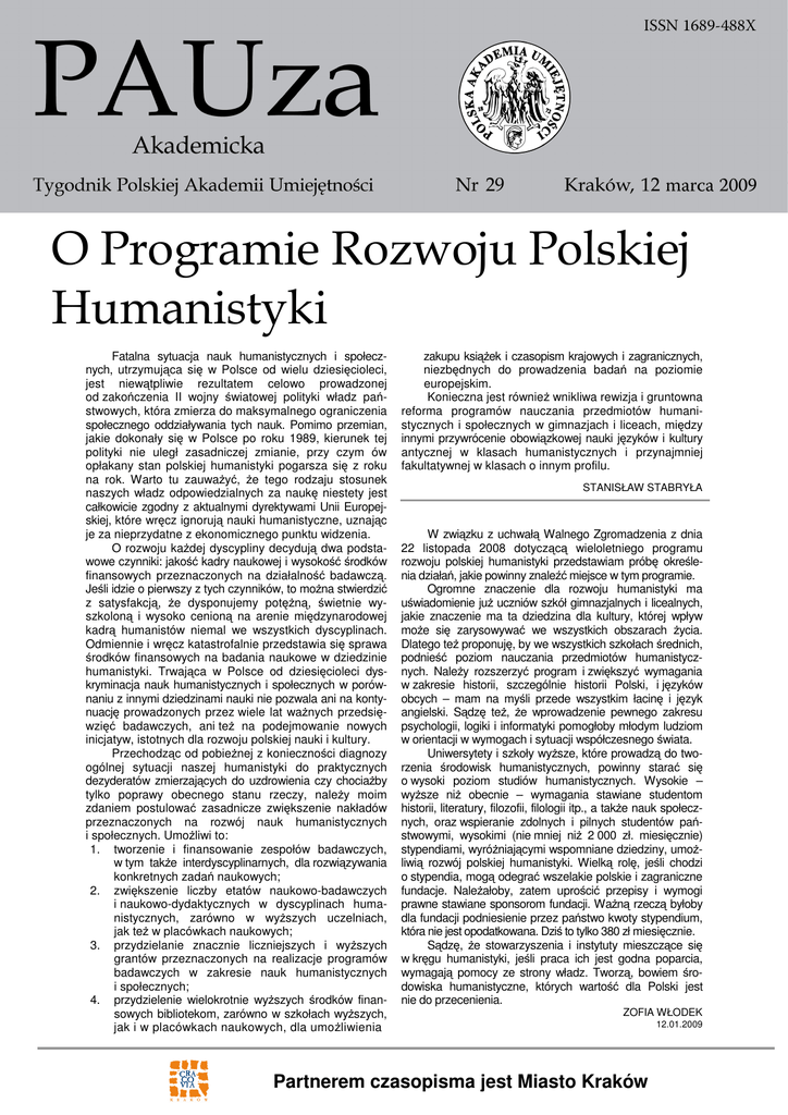 O Programie Rozwoju Polskiej Humanistyki Fatalna sytuacja nauk humanistycznych i społecznych, utrzymująca się w Polsce od wielu dziesięcioleci, jest niewątpliwie rezultatem celowo prowadzonej od zakończenia II wojny światowej polityki władz państwowych, która zmierza do maksymalnego ograniczenia społecznego oddziaływania tych nauk. Pomimo przemian, jakie dokonały się w Polsce po roku 1989, kierunek tej polityki nie uległ zasadniczej zmianie, przy czym ów opłakany stan polskiej humanistyki pogarsza się z roku na rok. Warto tu zauważyć, że tego rodzaju stosunek naszych władz odpowiedzialnych za naukę niestety jest całkowicie zgodny z aktualnymi dyrektywami Unii Europejskiej, które wręcz ignorują nauki humanistyczne, uznając je za nieprzydatne z ekonomicznego punktu widzenia. O rozwoju każdej dyscypliny decydują dwa podstawowe czynniki: jakość kadry naukowej i wysokość środków finansowych przeznaczonych na działalność badawczą. Jeśli idzie o pierwszy z tych czynników, to można stwierdzić z satysfakcją, że dysponujemy potężną, świetnie wyszkoloną i wysoko cenioną na arenie międzynarodowej kadrą humanistów niemal we wszystkich dyscyplinach. Odmiennie i wręcz katastrofalnie przedstawia się sprawa środków finansowych na badania naukowe w dziedzinie humanistyki. Trwająca w Polsce od dziesięcioleci dyskryminacja nauk humanistycznych i społecznych w porównaniu z innymi dziedzinami nauki nie pozwala ani na kontynuację prowadzonych przez wiele lat ważnych przedsięwzięć badawczych, ani też na podejmowanie nowych inicjatyw, istotnych dla rozwoju polskiej nauki i kultury. Przechodząc od pobieżnej z konieczności diagnozy ogólnej sytuacji naszej humanistyki do praktycznych dezyderatów zmierzających do uzdrowienia czy chociażby tylko poprawy obecnego stanu rzeczy, należy moim zdaniem postulować zasadnicze zwiększenie nakładów przeznaczonych na rozwój nauk humanistycznych i społecznych. Umożliwi to: 1. tworzenie i finansowanie zespołów badawczych, w tym także interdyscyplinarnych, dla rozwiązywania konkretnych zadań naukowych; 2. zwiększenie liczby etatów naukowo-badawczych i naukowo-dydaktycznych w dyscyplinach humanistycznych, zarówno w wyższych uczelniach, jak też w placówkach naukowych; 3. przydzielanie znacznie liczniejszych i wyższych grantów przeznaczonych na realizacje programów badawczych w zakresie nauk humanistycznych i społecznych; 4. przydzielenie wielokrotnie wyższych środków finansowych bibliotekom, zarówno w szkołach wyższych, jak i w placówkach naukowych, dla umożliwienia zakupu książek i czasopism krajowych i zagranicznych, niezbędnych do prowadzenia badań na poziomie europejskim. Konieczna jest również wnikliwa rewizja i gruntowna reforma programów nauczania przedmiotów humanistycznych i społecznych w gimnazjach i liceach, między innymi przywrócenie obowiązkowej nauki języków i kultury antycznej w klasach humanistycznych i przynajmniej fakultatywnej w klasach o innym profilu. STANISŁAW STABRYŁA W związku z uchwałą Walnego Zgromadzenia z dnia 22 listopada 2008 dotyczącą wieloletniego programu rozwoju polskiej humanistyki przedstawiam próbę określenia działań, jakie powinny znaleźć miejsce w tym programie. Ogromne znaczenie dla rozwoju humanistyki ma uświadomienie już uczniów szkół gimnazjalnych i licealnych, jakie znaczenie ma ta dziedzina dla kultury, której wpływ może się zarysowywać we wszystkich obszarach życia. Dlatego też proponuję, by we wszystkich szkołach średnich, podnieść poziom nauczania przedmiotów humanistycznych. Należy rozszerzyć program i zwiększyć wymagania w zakresie historii, szczególnie historii Polski, i języków obcych – mam na myśli przede wszystkim łacinę i język angielski. Sądzę też, że wprowadzenie pewnego zakresu psychologii, logiki i informatyki pomogłoby młodym ludziom w orientacji w wymogach i sytuacji współczesnego świata. Uniwersytety i szkoły wyższe, które prowadzą do tworzenia środowisk humanistycznych, powinny starać się o wysoki poziom studiów humanistycznych. Wysokie – wyższe niż obecnie – wymagania stawiane studentom historii, literatury, filozofii, filologii itp., a także nauk społecznych, oraz wspieranie zdolnych i pilnych studentów państwowymi, wysokimi (nie mniej niż 2 000 zł. miesięcznie) stypendiami, wyróżniającymi wspomniane dziedziny, umożliwią rozwój polskiej humanistyki. Wielką rolę, jeśli chodzi o stypendia, mogą odegrać wszelakie polskie i zagraniczne fundacje. Należałoby, zatem uprościć przepisy i wymogi prawne stawiane sponsorom fundacji. Ważną rzeczą byłoby dla fundacji podniesienie przez państwo kwoty stypendium, która nie jest opodatkowana. Dziś to tylko 380 zł miesięcznie. Sądzę, że stowarzyszenia i instytuty mieszczące się w kręgu humanistyki, jeśli praca ich jest godna poparcia, wymagają pomocy ze strony władz. Tworzą, bowiem środowiska humanistyczne, których wartość dla Polski jest nie do przecenienia. ZOFIA WŁODEK Partnerem czasopisma jest Miasto Kraków 12.01.2009 Str. 2 PAUza Akademicka Nr 29, 12 marca 2009 ________________________________________________________________________________________________________________ Bezsporna wersja polityki historycznej Raz po raz wydobywa się na powierzchnię publicznej debaty kwestia polityki historycznej. Zazwyczaj naznaczona ideowo lub zgoła ideologiczne – przez to nieustannie sporna. Na instytucje powołane do jej uprawiania, jak Muzeum Powstania Warszawskiego lub tworzone dopiero Muzeum Historii Polski, na rozmaite cykliczne bądź jednorazowe inicjatywy, patrzymy z niejaką nieufnością – zwłaszcza ludzie mojego pokolenia, które przeżyło wykreślanie z encyklopedii hasła „Katyń”. Polityka historyczna to jest troska o zbiorową pamięć, o trwanie w niej obrazów przeszłości narodowej ze wszystkim, co budzi dumę, zatem i chęć naślad