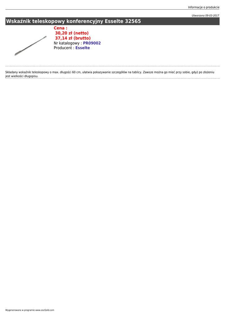 Informacje o produkcie Utworzono 09-03-2017 Wskaźnik teleskopowy konferencyjny Esselte 32565 Cena : 30,20 zł (netto) 37,14 zł (brutto) Nr katalogowy : PR09002 Producent : Esselte Składany wskaźnik teleskopowy o max. długości 60 cm, ułatwia pokazywanie szczegółów na tablicy. Zawsze można go mieć przy sobie, gdyż po złożeniu jest wielkości długopisu. Wygenerowano w programie www.oscGold.com