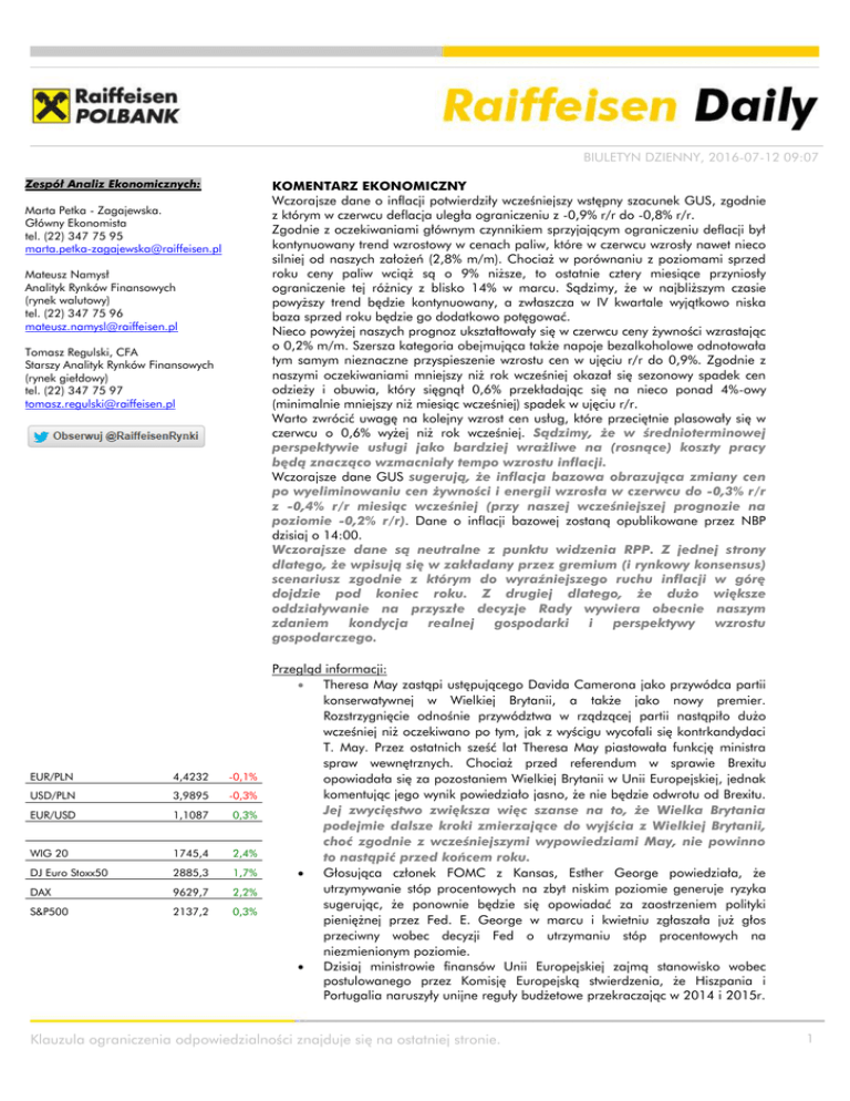 BIULETYN DZIENNY, 2016-07-12 09:07 Zespół Analiz Ekonomicznych: KOMENTARZ EKONOMICZNY Wczorajsze dane o inflacji potwierdziły wcześniejszy wstępny szacunek GUS, zgodnie z którym w czerwcu deflacja uległa ograniczeniu z -0,9% r/r do -0,8% r/r. Zgodnie z oczekiwaniami głównym czynnikiem sprzyjającym ograniczeniu deflacji był kontynuowany trend wzrostowy w cenach paliw, które w czerwcu wzrosły nawet nieco silniej od naszych założeń (2,8% m/m). Chociaż w porównaniu z poziomami sprzed roku ceny paliw wciąż są o 9% niższe, to ostatnie cztery miesiące przyniosły ograniczenie tej różnicy z blisko 14% w marcu. Sądzimy, że w najbliższym czasie powyższy trend będzie kontynuowany, a zwłaszcza w IV kwartale wyjątkowo niska baza sprzed roku będzie go dodatkowo potęgować. Nieco powyżej naszych prognoz ukształtowały się w czerwcu ceny żywności wzrastając o 0,2% m/m. Szersza kategoria obejmująca także napoje bezalkoholowe odnotowała tym samym nieznaczne przyspieszenie wzrostu cen w ujęciu r/r do 0,9%. Zgodnie z naszymi oczekiwaniami mniejszy niż rok wcześniej okazał się sezonowy spadek cen odzieży i obuwia, który sięgnął 0,6% przekładając się na nieco ponad 4%-owy (minimalnie mniejszy niż miesiąc wcześniej) spadek w ujęciu r/r. Warto zwrócić uwagę na kolejny wzrost cen usług, które przeciętnie plasowały się w czerwcu o 0,6% wyżej niż rok wcześniej. Sądzimy, że w średnioterminowej perspektywie usługi jako bardziej wrażliwe na (rosnące) koszty pracy będą znacząco wzmacniały tempo wzrostu inflacji. Wczorajsze dane GUS sugerują, że inflacja bazowa obrazująca zmiany cen po wyeliminowaniu cen żywności i energii wzrosła w czerwcu do -0,3% r/r z -0,4% r/r miesiąc wcześniej (przy naszej wcześniejszej prognozie na poziomie -0,2% r/r). Dane o inflacji bazowej zostaną opublikowane przez NBP dzisiaj o 14:00. Wczorajsze dane są neutralne z punktu widzenia RPP. Z jednej strony dlatego, że wpisują się w zakładany przez gremium (i rynkowy konsensus) scenariusz zgodnie z którym do wyraźniejszego ruchu inflacji w górę dojdzie pod koniec roku. Z drugiej dlatego, że dużo większe oddziaływanie na przyszłe decyzje Rady wywiera obecnie naszym zdaniem kondycja realnej gospodarki i perspektywy wzrostu gospodarczego. Marta Petka - Zagajewska. Główny Ekonomista tel. (22) 347 75 95 [email protected] Mateusz Namysł Analityk Rynków Finansowych (rynek walutowy) tel. (22) 347 75 96 [email protected] Tomasz Regulski, CFA Starszy Analityk Rynków Finansowych (rynek giełdowy) tel. (22) 347 75 97 [email protected] EUR/PLN 4,4232 -0,1% USD/PLN 3,9895 -0,3% EUR/USD 1,1087 0,3% WIG 20 1745,4 2,4% DJ Euro Stoxx50 2885,3 1,7% DAX 9629,7 2,2% S&P500 2137,2 0,3% Przegląd informacji: Theresa May zastąpi ustępującego Davida Camerona jako przywódca partii konserwatywnej w Wielkiej Brytanii, a także jako nowy premier. Rozstrzygnięcie odnośnie przywództwa w rządzącej partii nastąpiło dużo wcześniej niż oczekiwano po tym, jak z wyścigu wycofali się kontrkandydaci T. May. Przez ostatnich sześć lat Theresa May piastowała funkcję ministra spraw wewnętrznych. Chociaż przed referendum w sprawie Brexitu opowiadała się za pozostaniem Wielkiej Brytanii w Unii Europejskiej, jednak komentując jego wynik powiedziało jasno, że nie będzie odwrotu od Brexitu. Jej zwycięstwo zwiększa więc szanse na to, że Wielka Brytania podejmie dalsze kroki zmierzające do wyjścia z Wielkiej Brytanii, choć zgodnie z wcześniejszymi wypowiedziami May, nie powinno to nastąpić przed końcem roku. Głosująca członek FOMC z Kansas, Esther George powiedziała, że utrzymywanie stóp procentowych na zbyt niskim poziomie generuje ryzyka sugerując, że ponownie będzie się opowiadać za zaostrzeniem polityki pieniężnej przez Fed. E. George w marcu i kwietniu zgłaszała już głos przeciwny wobec decyzji Fed o utrzymaniu stóp procentowych na niezmienionym poziomie. Dzisiaj ministrowie finansów Unii Europejskiej zajmą stanowisko wobec postulowanego przez Komisję Europejską stwierdzenia, że Hiszpania i Portugalia naruszyły unijne reguły budżetowe przekraczając w 2014 i 2015r. Klauzula ograniczenia odpowiedzialności znajduje się na ostatniej stronie. 1 BIULETYN DZIENNY, 12 lipca 2016, GODZ 9.10 próg deficytu sektora finansów publicznych w relacji do PKB na poziomie 3%. Wczoraj z oceną Komisji zgodzili się ministrowie Eurogrupy. Aprobata ministrów otworzy drogę do kontynuacji procedury nadmiernego deficytu, która daje możliwość nałożenia na objęte nią państwa sankcji finansowych. KOMENTARZ RYNKOWY Dalsza poprawa nastrojów inwestycyjnych na świecie w poniedziałek nie wsparła notowań złotego względem euro. Kurs EURPLN wzrósł w okolice 4,43, co istotnie zmniejsza szanse na wybicie dołem z pasma 4,40-4,45 na fali spadku awersji do ryzyka na rynkach i sugeruje kontynuację konsolidacji w tym przedziale w najbliższych dniach. Kurs EURUSD po nieudanej próbie zbliżenia się do psychologicznej bariery 1,10, odbił się aż w okolice 1,1090. Dziś opór przy poziomie 1,11 w postaci 200-sesyjnej średniej powinien hamować zwyżkę. Za wyhamowaniem wzrostów przemawiają dość liczne czynniki ryzyka związane ze strefą euro. Europejskie władze wciąż nie dały zielonego światła do ratowania włoskiego sektora bankowego bez częściowego obciążenia jego kosztem obligatariuszy. 29 lipca poznamy wyniki stress-testów europejskich banków, które raczej nie zwiększą poziomu zaufania inwestorów do tego sektora. Ponadto kraje UE rozważają obecnie formę ukarania Portugalii i Hiszpanii za nieprzestrzeganie wytycznych w ramach procedury nadmiernego deficytu (decyzję w tej sprawie możemy poznać na rozpoczętym wczoraj i kontynuowanym dziś spotkaniu europejskich ministrów finansów). Kara może sięgać maksymalnie 0,5% PKB danego kraju, jednak prawdopodobnie będzie jedynie symboliczna, choć i to może 