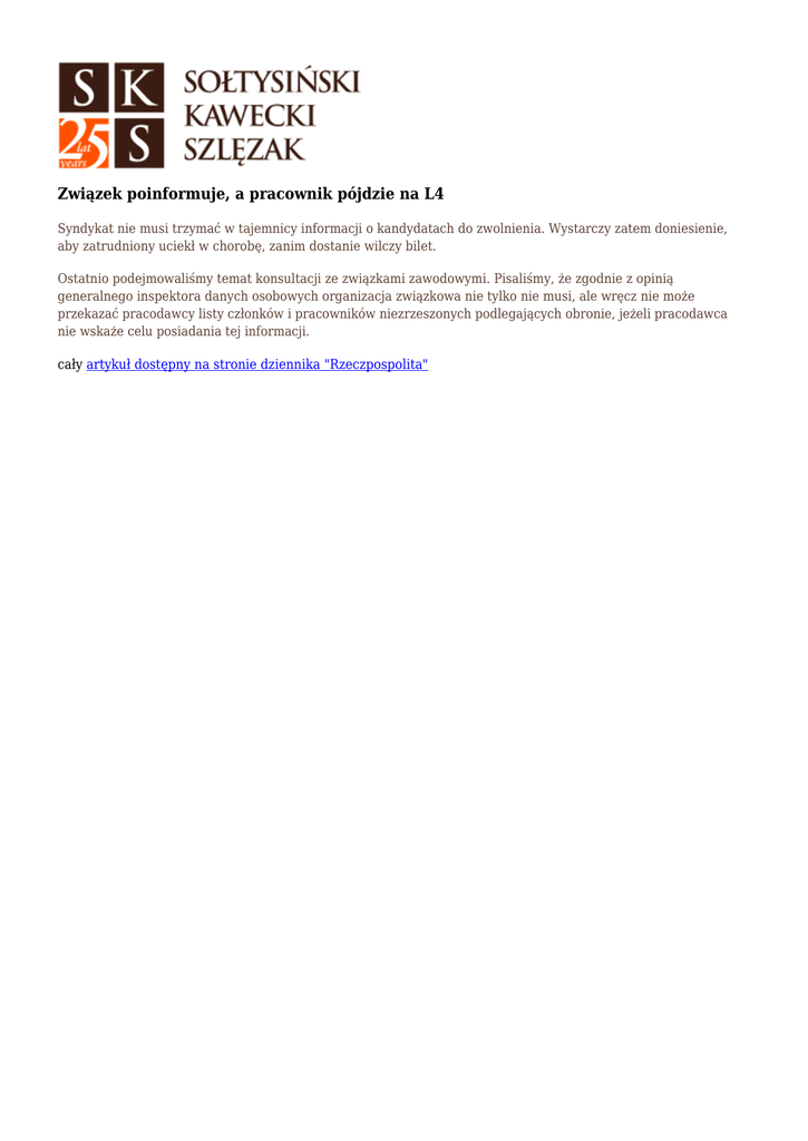 Związek poinformuje, a pracownik pójdzie na L4 Syndykat nie musi trzymać w tajemnicy informacji o kandydatach do zwolnienia. Wystarczy zatem doniesienie, aby zatrudniony uciekł w chorobę, zanim dostanie wilczy bilet. Ostatnio podejmowaliśmy temat konsultacji ze związkami zawodowymi. Pisaliśmy, że zgodnie z opinią generalnego inspektora danych osobowych organizacja związkowa nie tylko nie musi, ale wręcz nie może przekazać pracodawcy listy członków i pracowników niezrzeszonych podlegających obronie, jeżeli pracodawca nie wskaże celu posiadania tej informacji. cały artykuł dostępny na stronie dziennika "Rzeczpospolita"