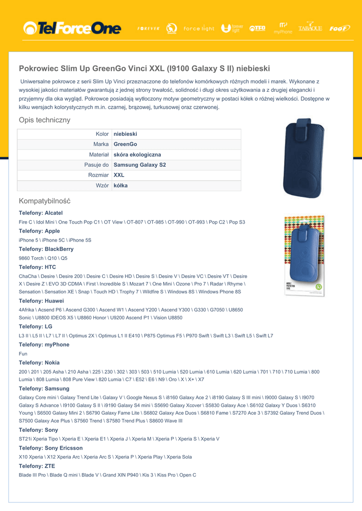 Pokrowiec Slim Up GreenGo Vinci XXL (I9100 Galaxy S II) niebieski Uniwersalne pokrowce z serii Slim Up Vinci przeznaczone do telefonów komórkowych różnych modeli i marek. Wykonane z wysokiej jakości materiałów gwarantują z jednej strony trwałość, solidność i długi okres użytkowania a z drugiej elegancki i przyjemny dla oka wygląd. Pokrowce posiadają wytłoczony motyw geometryczny w postaci kółek o różnej wielkości. Dostępne w kilku wersjach kolorystycznych m.in. czarnej, brązowej, turkusowej oraz czerwonej. Opis techniczny Kolor niebieski Marka GreenGo Materiał skóra ekologiczna Pasuje do Samsung Galaxy S2 Rozmiar XXL Wzór kółka Kompatybilność Telefony: Alcatel Fire C \ Idol Mini \ One Touch Pop C1 \ OT View \ OT-807 \ OT-985 \ OT-990 \ OT-993 \ Pop C2 \ Pop S3 Telefony: Apple iPhone 5 \ iPhone 5C \ iPhone 5S Telefony: BlackBerry 9860 Torch \ Q10 \ Q5 Telefony: HTC ChaCha \ Desire \ Desire 200 \ Desire C \ Desire HD \ Desire S \ Desire V \ Desire VC \ Desire VT \ Desire X \ Desire Z \ EVO 3D CDMA \ First \ Incredible S \ Mozart 7 \ One Mini \ Ozone \ Pro 7 \ Radar \ Rhyme \ Sensation \ Sensation XE \ Snap \ Touch HD \ Trophy 7 \ Wildfire S \ Windows 8S \ Windows Phone 8S Telefony: Huawei 4Afrika \ Acsend P6 \ Ascend G300 \ Ascend W1 \ Ascend Y200 \ Ascend Y300 \ G330 \ G7050 \ U8650 Sonic \ U8800 IDEOS X5 \ U8860 Honor \ U9200 Ascend P1 \ Vision U8850 Telefony: LG L3 II \ L5 II \ L7 \ L7 II \ Optimus 2X \ Optimus L1 II E410 \ P875 Optimus F5 \ P970 Swift \ Swift L3 \ Swift L5 \ Swift L7 Telefony: myPhone Fun Telefony: Nokia 200 \ 201 \ 205 Asha \ 210 Asha \ 225 \ 230 \ 302 \ 303 \ 503 \ 510 Lumia \ 520 Lumia \ 610 Lumia \ 620 Lumia \ 701 \ 710 \ 710 Lumia \ 800 Lumia \ 808 Lumia \ 808 Pure View \ 820 Lumia \ C7 \ E52 \ E6 \ N9 \ Oro \ X \ X+ \ X7 Telefony: Samsung Galaxy Core mini \ Galaxy Trend Lite \ Galaxy V \ Google Nexus S \ i8160 Galaxy Ace 2 \ i8190 Galaxy S III mini \ I9000 Galaxy S \ I9070 Galaxy S Advance \ I9100 Galaxy S II \ i9190 Galaxy S4 mini \ S5690 Galaxy Xcover \ S5830 Galaxy Ace \ S6102 Galaxy Y Duos \ S6310 Young \ S6500 Galaxy Mini 2 \ S6790 Galaxy Fame Lite \ S6802 Galaxy Ace Duos \ S6810 Fame \ S7270 Ace 3 \ S7392 Galaxy Trend Duos \ S7500 Galaxy Ace Plus \ S7560 Trend \ S7580 Trend Plus \ S8600 Wave III Telefony: Sony ST21i Xperia Tipo \ Xperia E \ Xperia E1 \ Xperia J \ Xperia M \ Xperia P \ Xperia S \ Xperia V Telefony: Sony Ericsson X10 Xperia \ X12 Xperia Arc \ Xperia Arc S \ Xperia P \ Xperia Play \ Xperia Sola Telefony: ZTE Blade III Pro \ Blade Q mini \ Blade V \ Grand XIN P940 \ Kis 3 \ Kiss Pro \ Open C